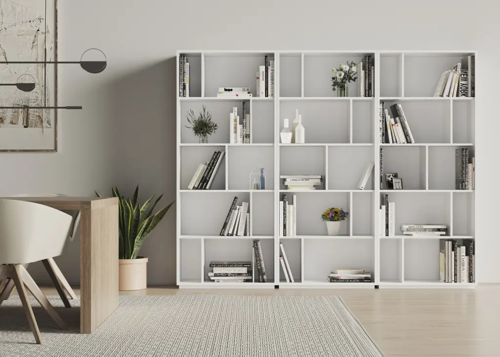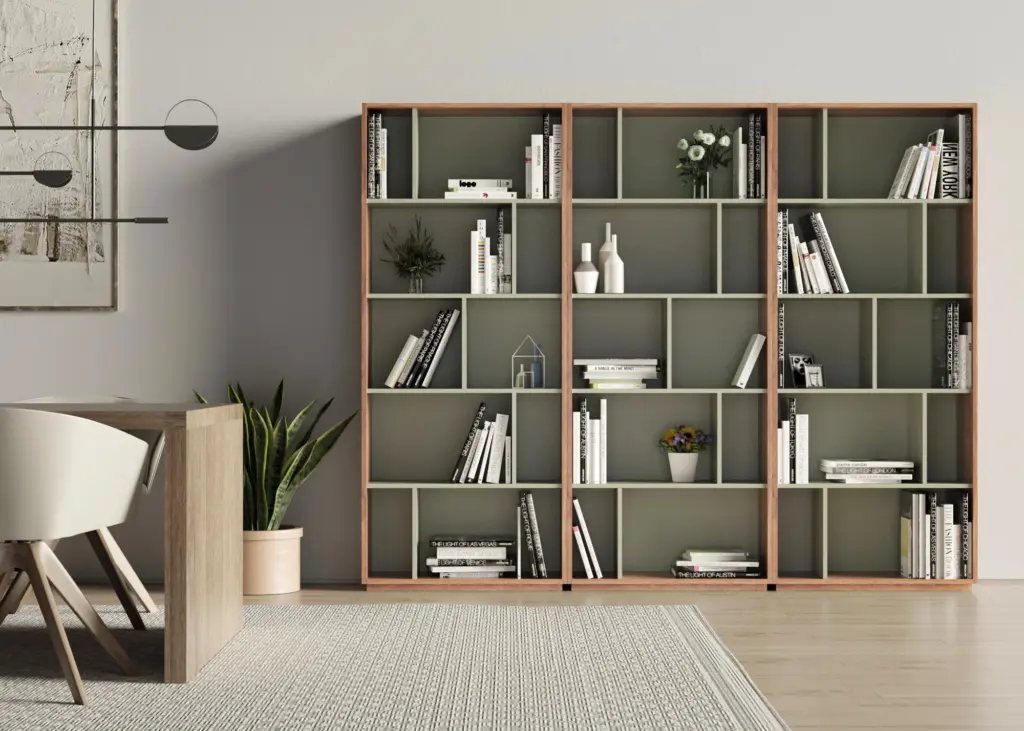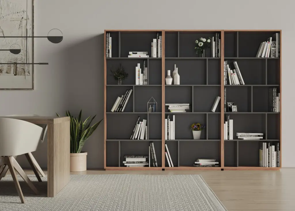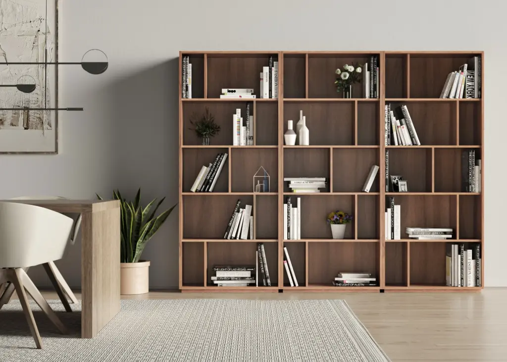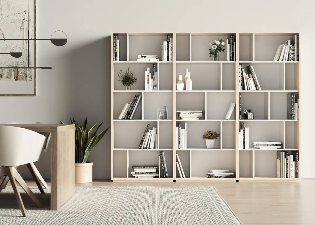 Estantería librería fabricada en melamina con gran capacidad de almacenamiento gracias a los múltiples huecos. El diseño es modular, por lo que se pueden colocar varias librerías juntas, ya sean del mismo modelo o de distinto, dentro de la colección de NACK.