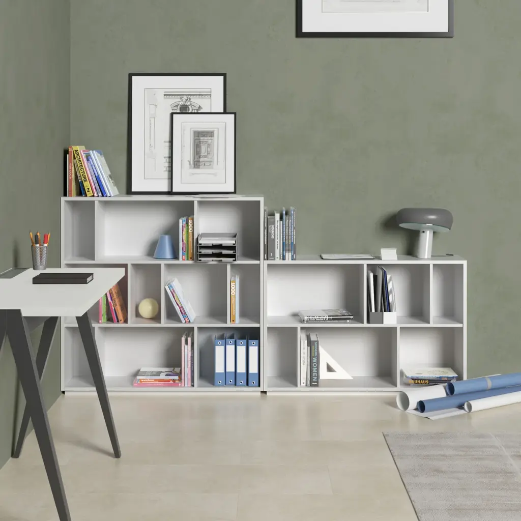 Estantería librería fabricada en melamina con gran capacidad de almacenamiento gracias a los múltiples huecos. El diseño es modular, por lo que se pueden colocar varias librerías juntas, ya sean del mismo modelo o de distinto, dentro de la colección de NACK.