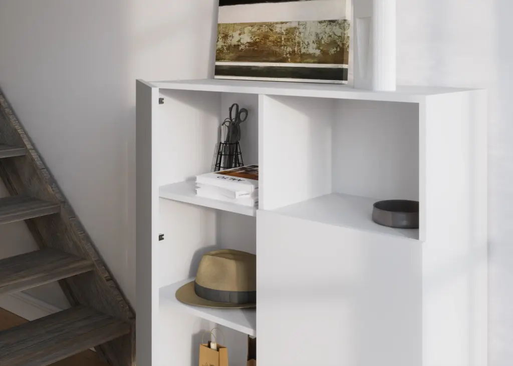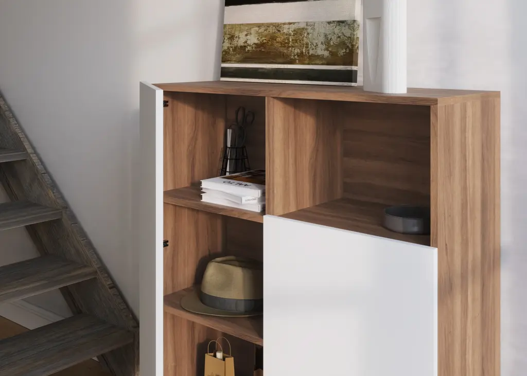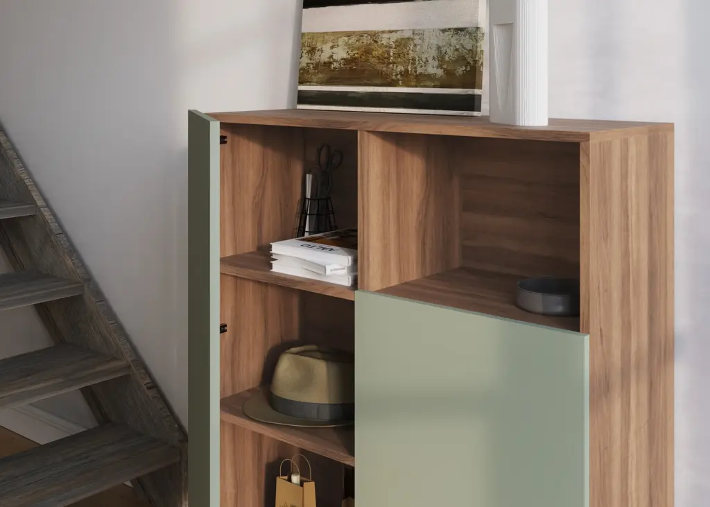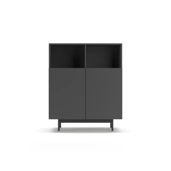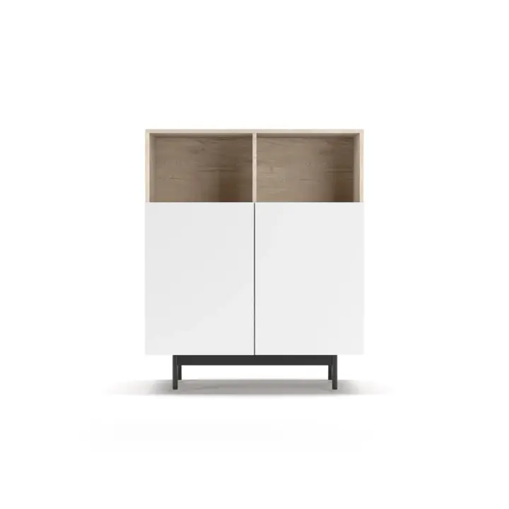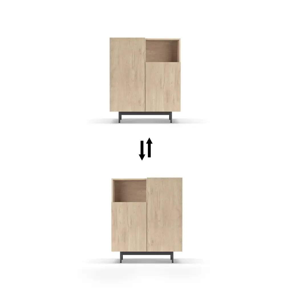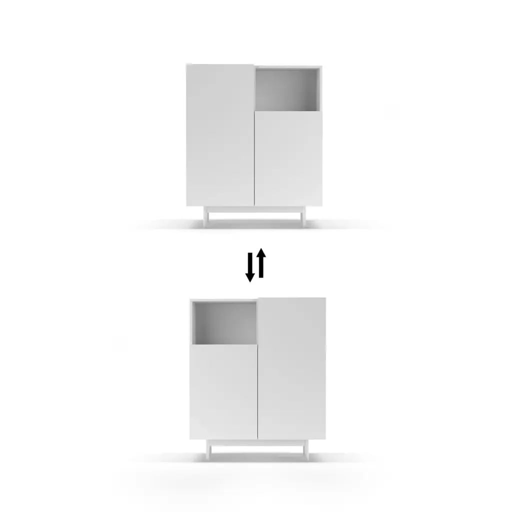 Mueble multifunción fabricado en melamina con patas en metal lacadas. La amplia gama de combinaciones posibles que ofrece este modelo lo hacen un elemento esencial para personalizar cada espacio. Su versatilidad y diseño permite adaptarlo a diferentes necesidades como mueble de entrada, de almacenamiento, zapatero, entre otros usos.