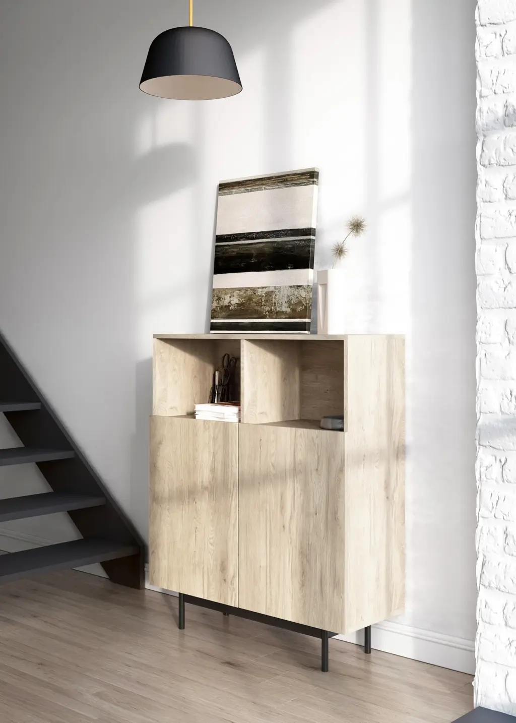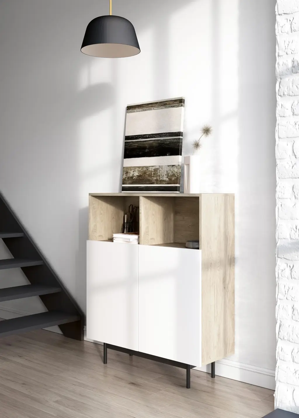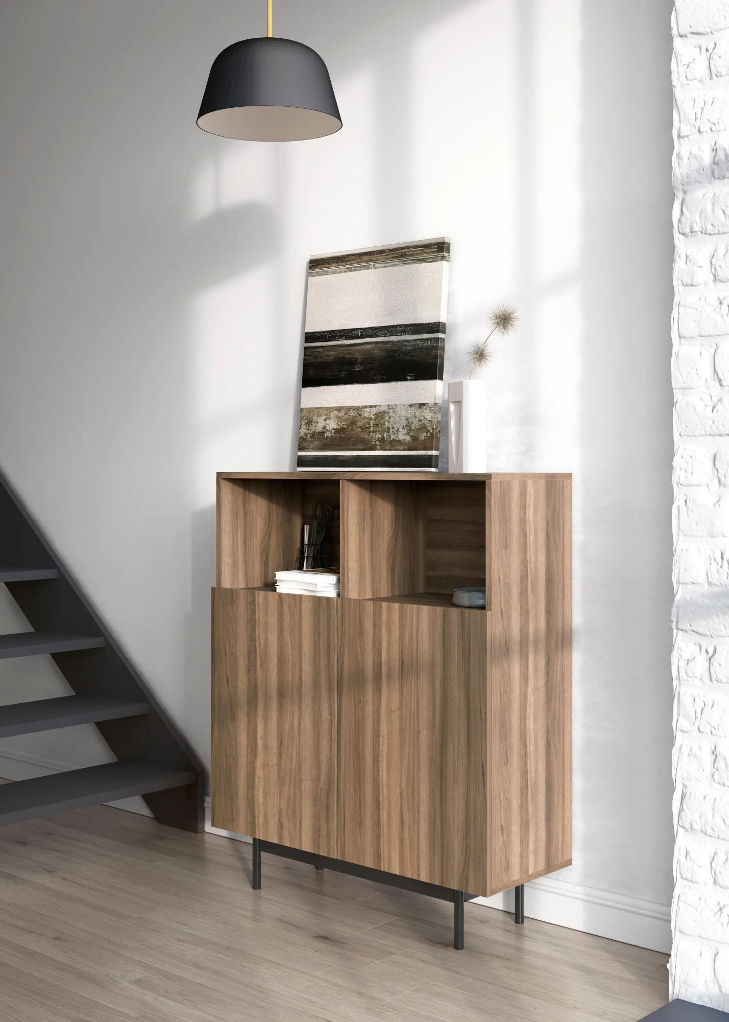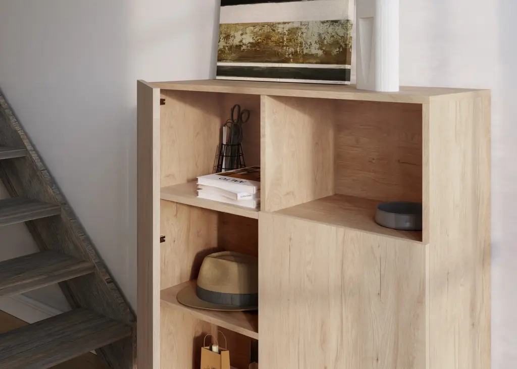Mueble multifunción fabricado en melamina con patas en metal lacadas. La amplia gama de combinaciones posibles que ofrece este modelo lo hacen un elemento esencial para personalizar cada espacio. Su versatilidad y diseño permite adaptarlo a diferentes necesidades como mueble de entrada, de almacenamiento, zapatero, entre otros usos.