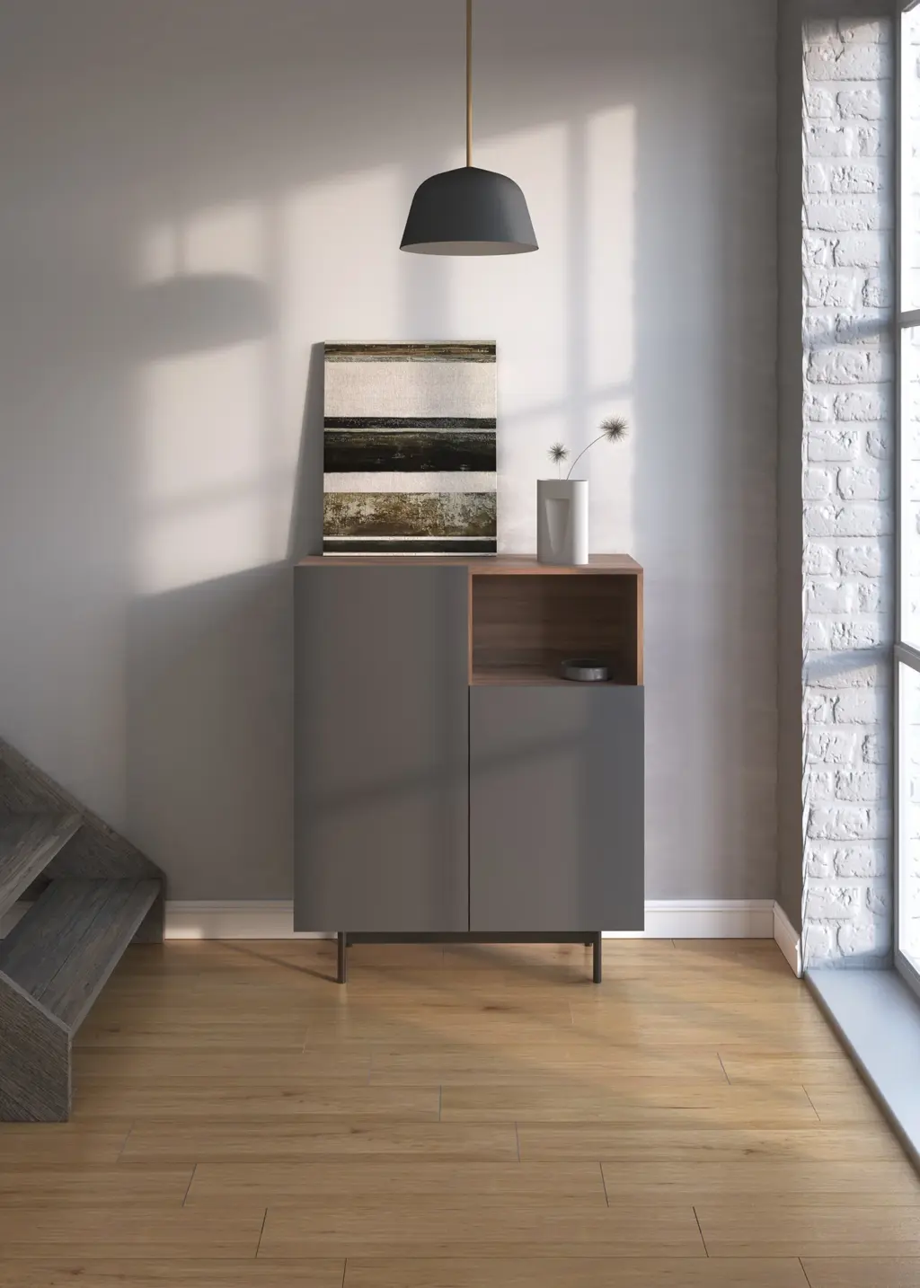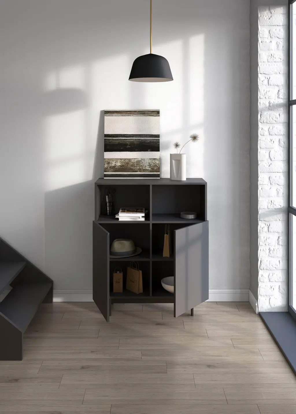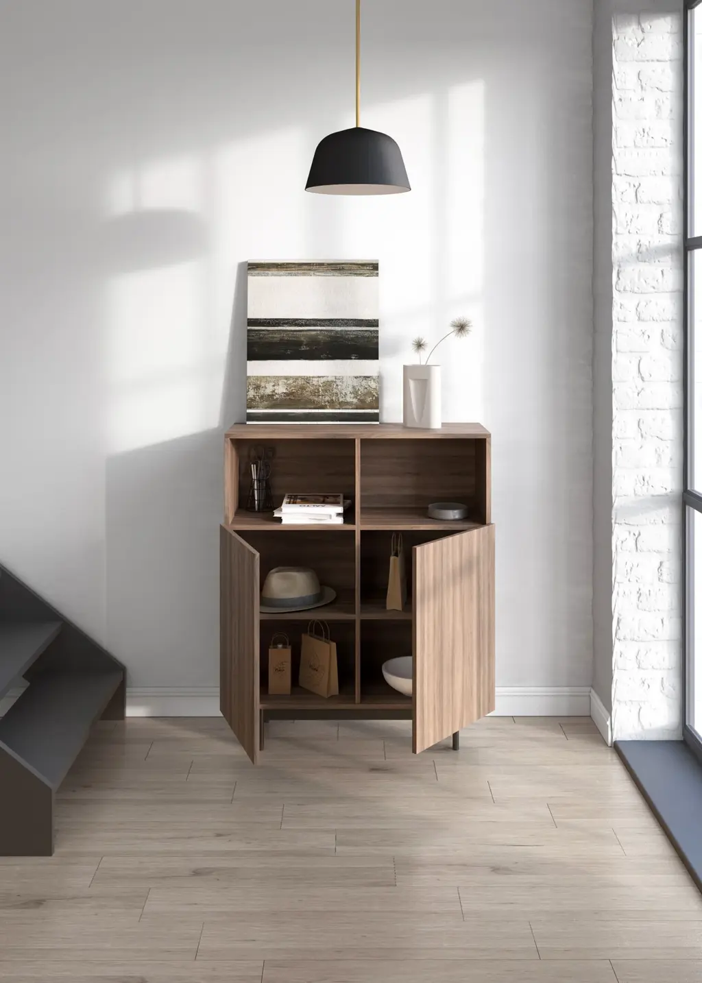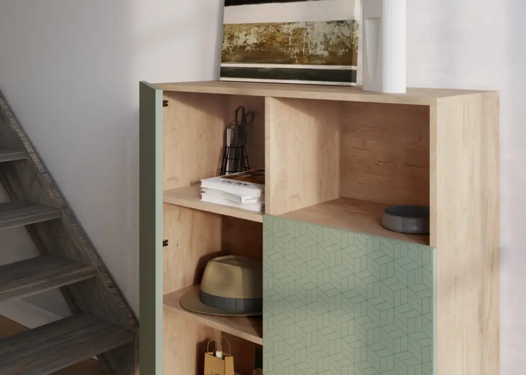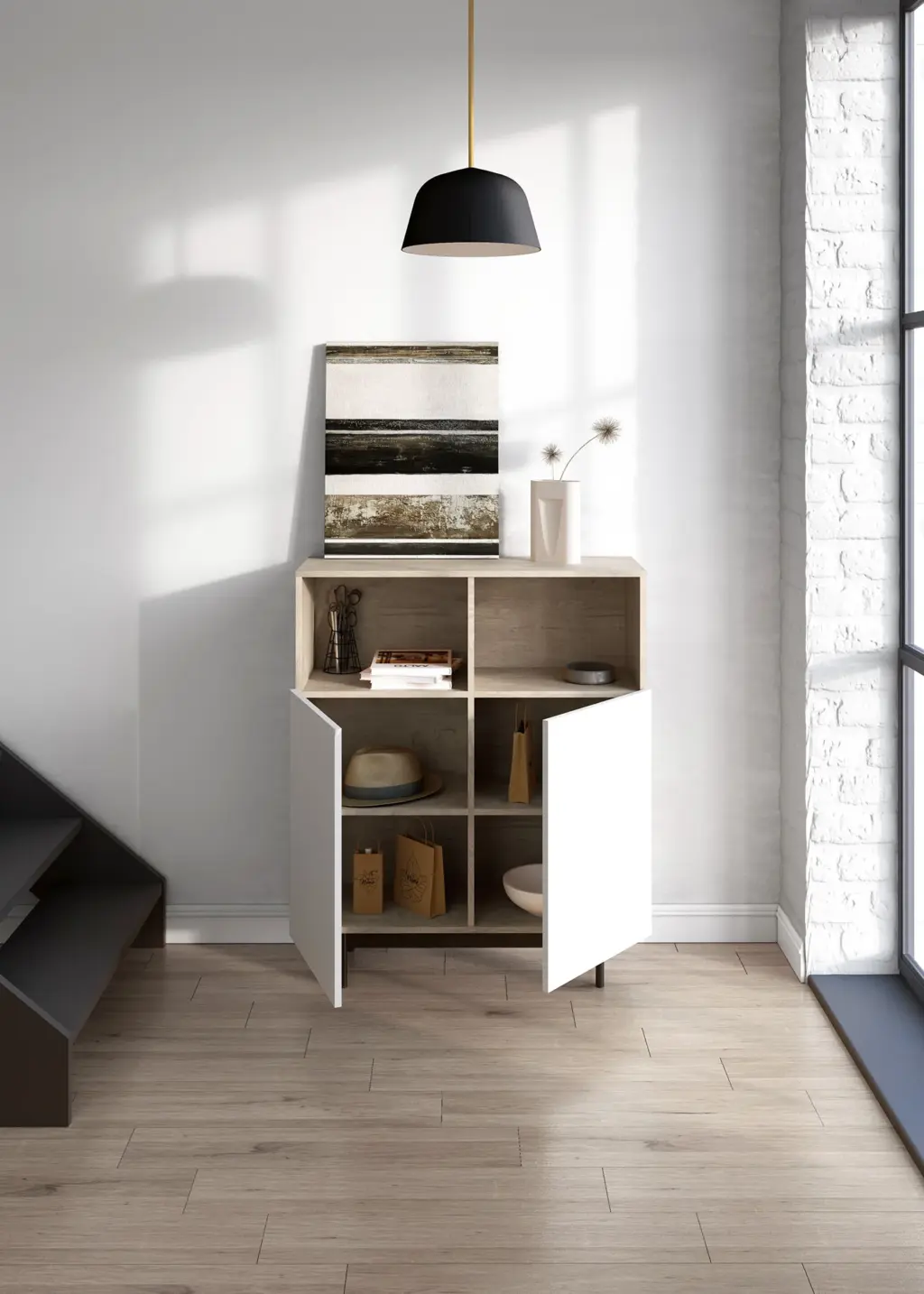 Mueble multifunción fabricado en melamina con patas en metal lacadas. La amplia gama de combinaciones posibles que ofrece este modelo lo hacen un elemento esencial para personalizar cada espacio. Su versatilidad y diseño permite adaptarlo a diferentes necesidades como mueble de entrada, de almacenamiento, zapatero, entre otros usos.