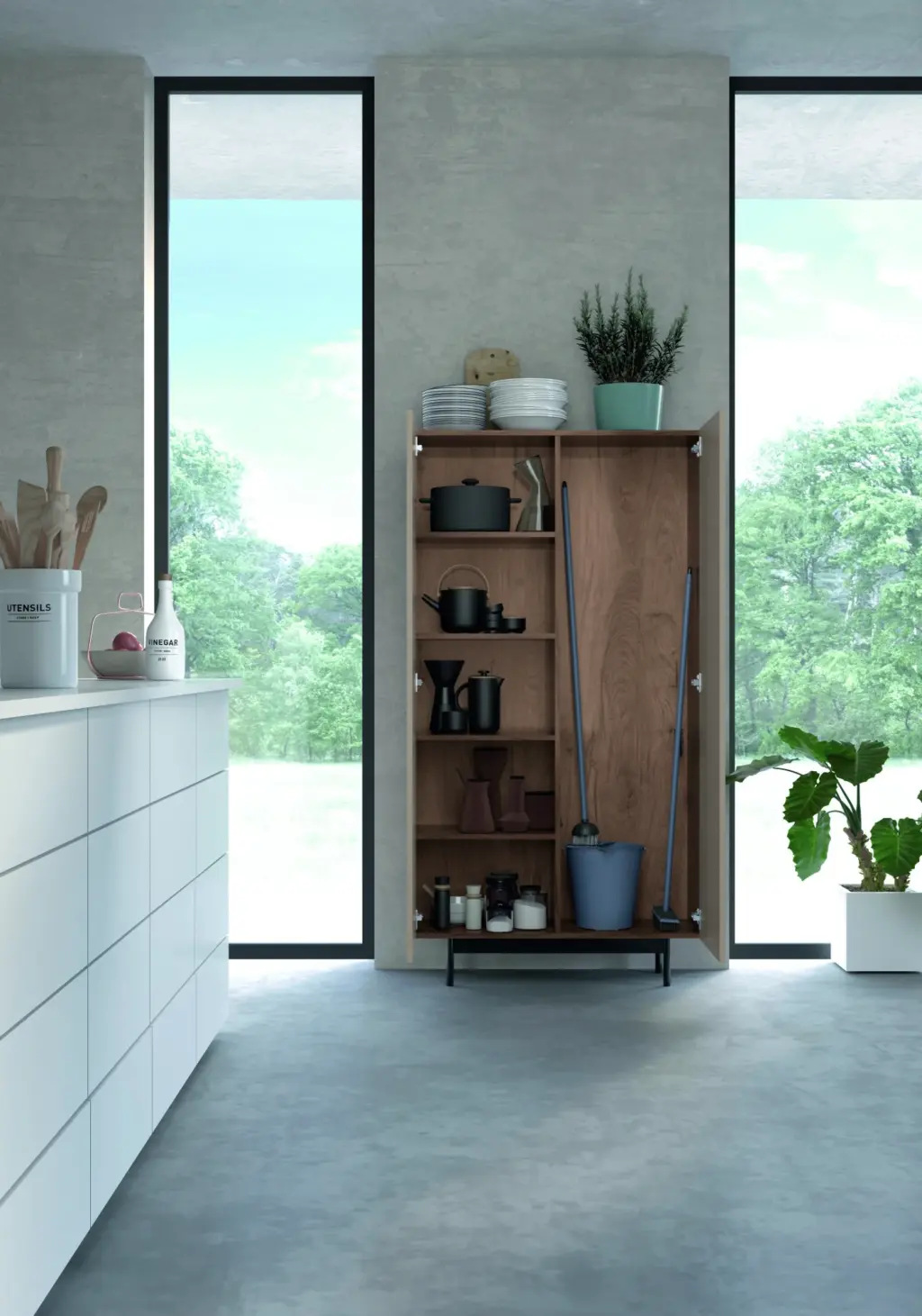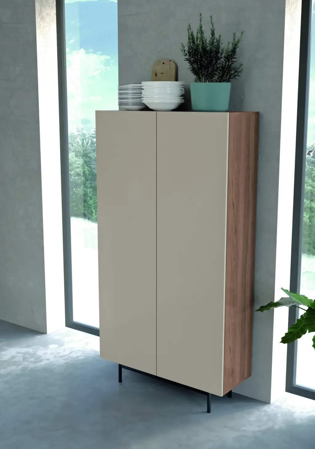 Mueble multifunción fabricado en melamina con patas en metal lacadas. Este mueble es de diseño único, no acepta ninguna modificación con respecto a la base. Sin embargo, si que existe una gran variedad de acabados de color, lo que permitirá personalizar cada espacio. Su distribución es perfecta para utilizarlo como mueble escobero, aunque su gran capacidad de almacenaje le da infinitas posibilidades de uso.