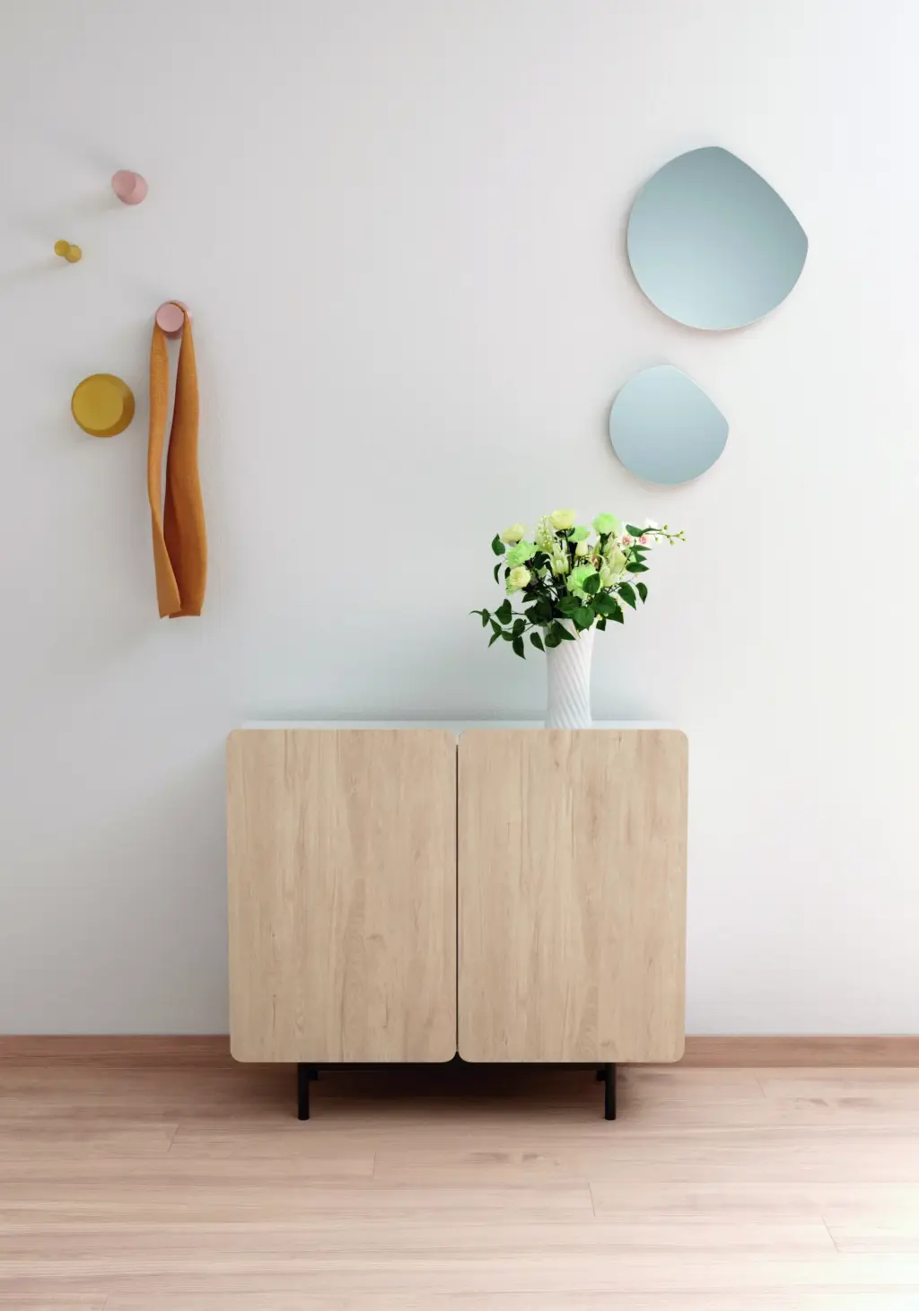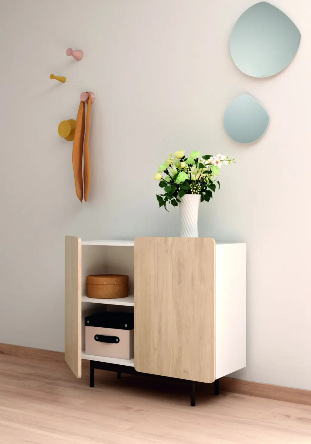 Mueble multifunción fabricado en melamina con patas en metal lacadas. La amplia gama de combinaciones posibles que ofrece este modelo lo hacen un elemento esencial para personalizar cada espacio. Su versatilidad y diseño permite adaptarlo a diferentes necesidades como mueble de entrada, de almacenamiento, zapatero, entre otros usos.