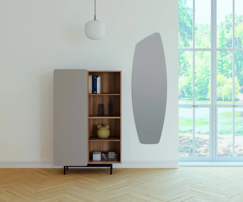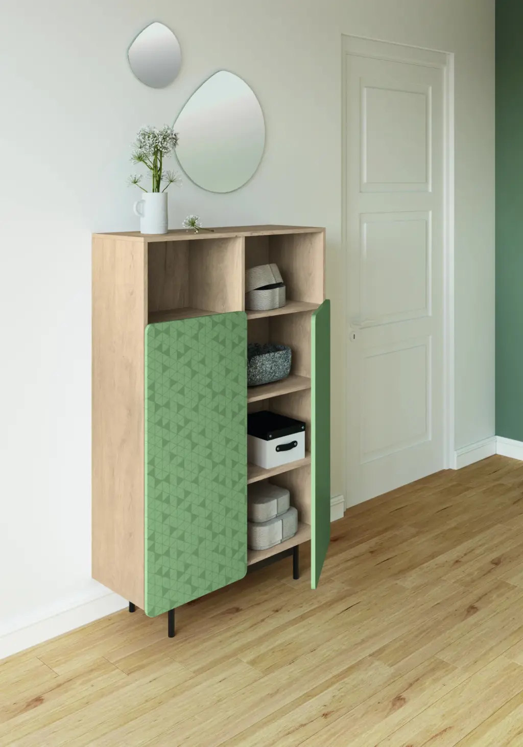 Mueble multifunción fabricado en melamina con patas en metal lacadas. La amplia gama de combinaciones posibles que ofrece este modelo lo hacen un elemento esencial para personalizar cada espacio. Su versatilidad y diseño permite adaptarlo a diferentes necesidades como mueble de entrada, de almacenamiento, zapatero, entre otros usos.