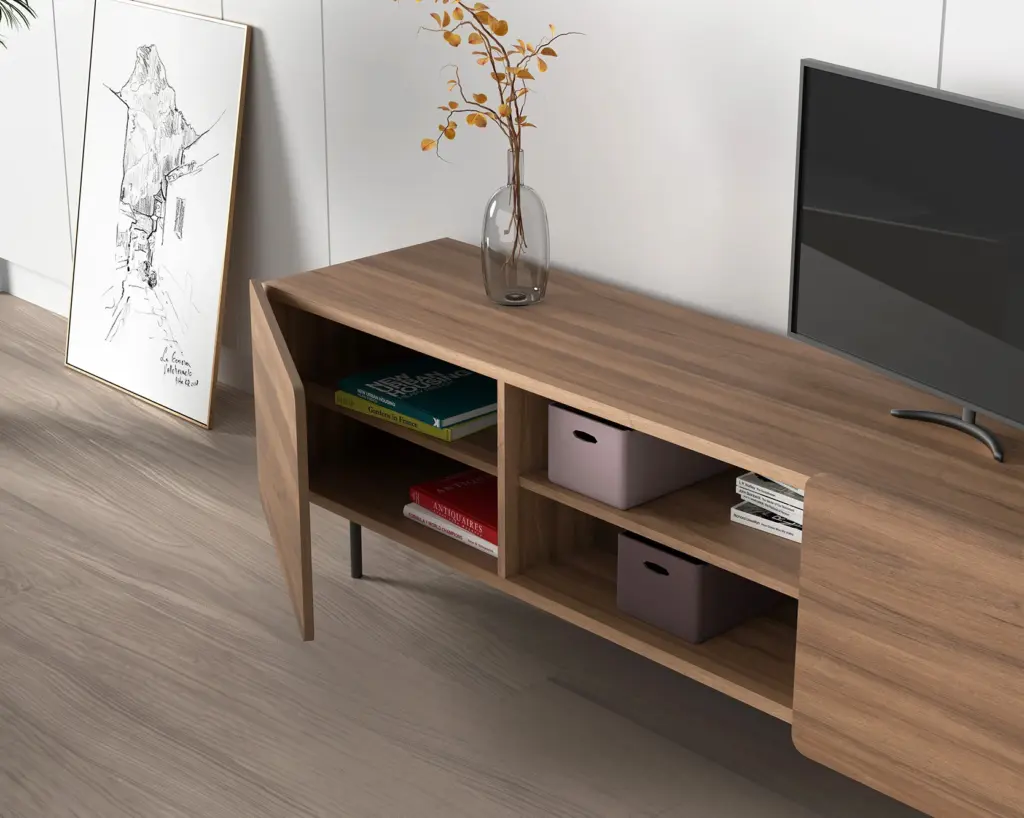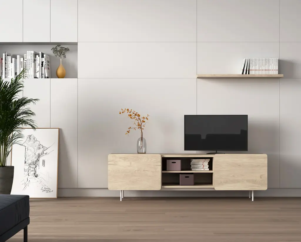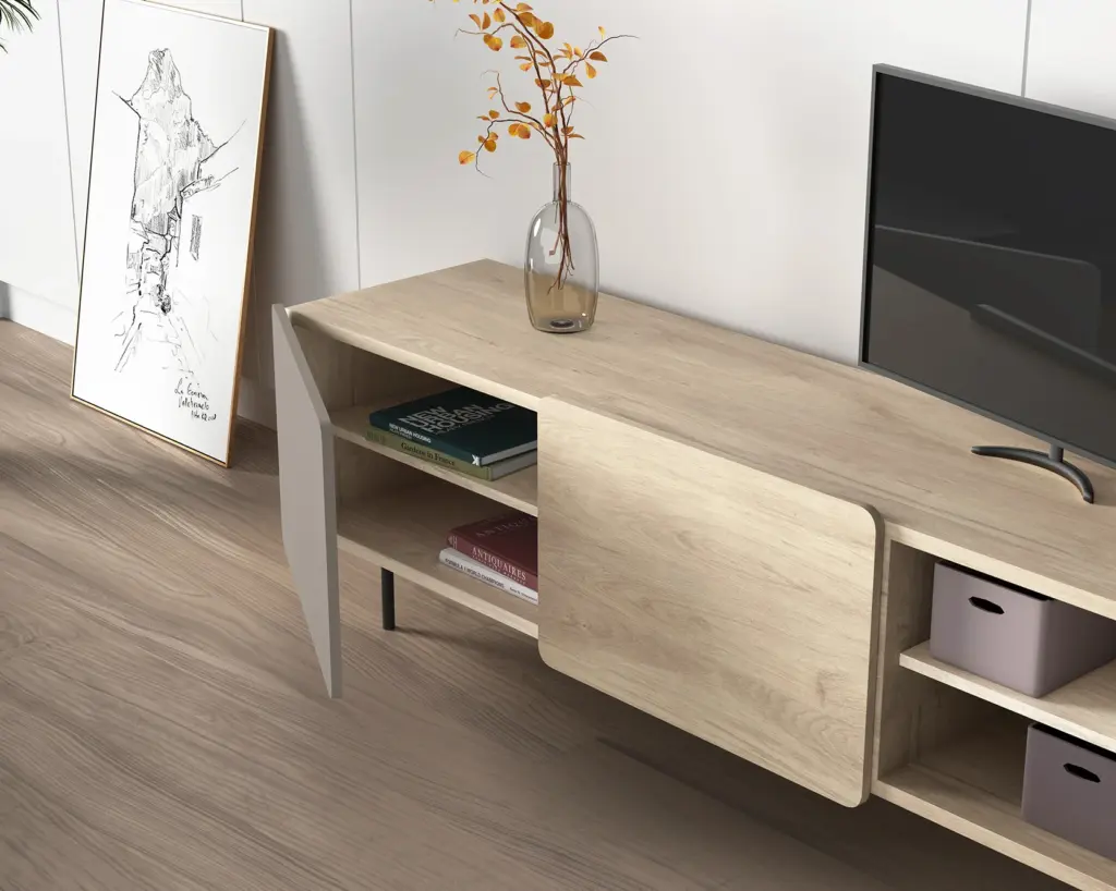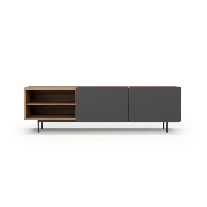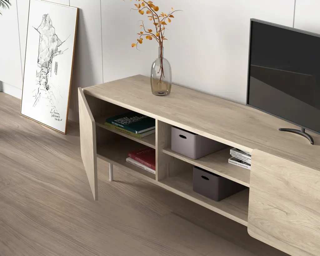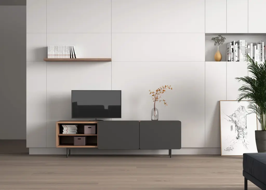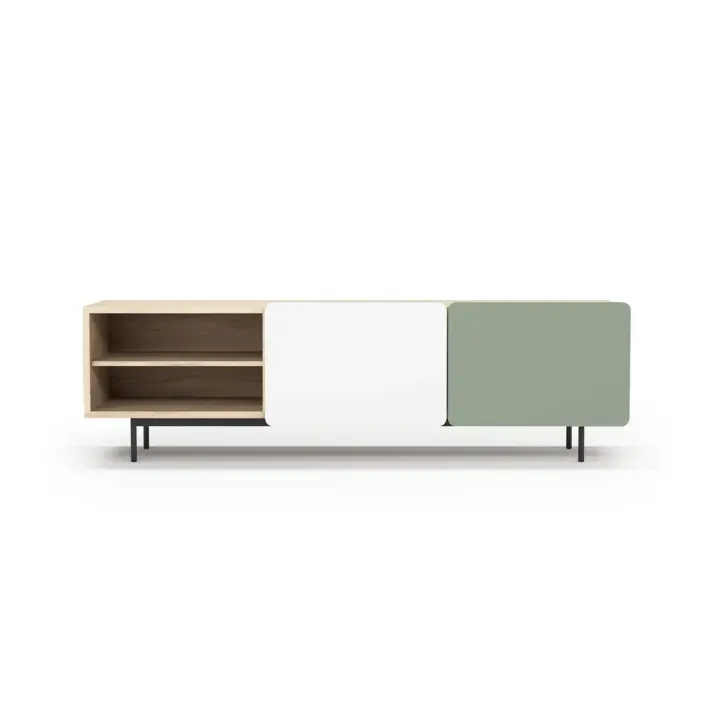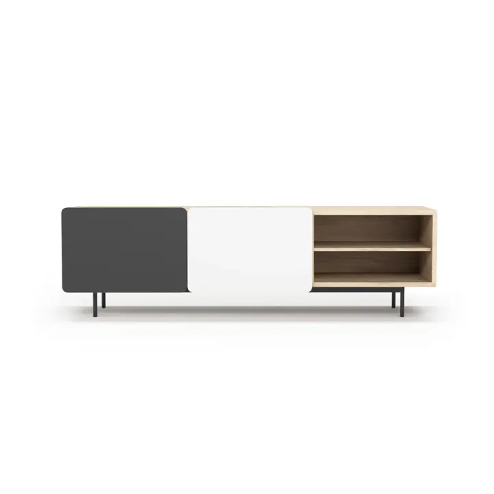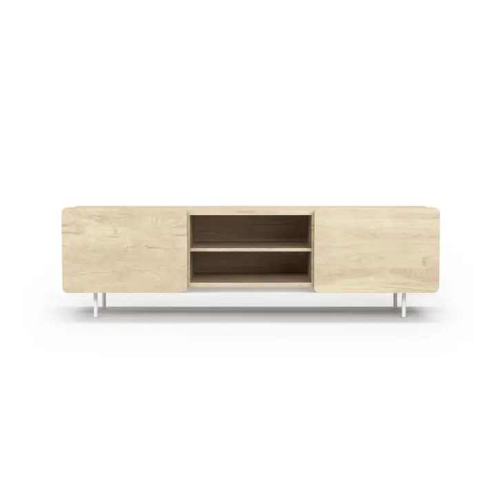 Módulo de TV fabricado en melamina con patas metálicas. Múltiples composiciones y acabados te permitirán adaptarlo a tus necesidades sin perder el estilo. Combínalo con los aparadores de la misma colección para crear un ambiente acogedor y elegante.