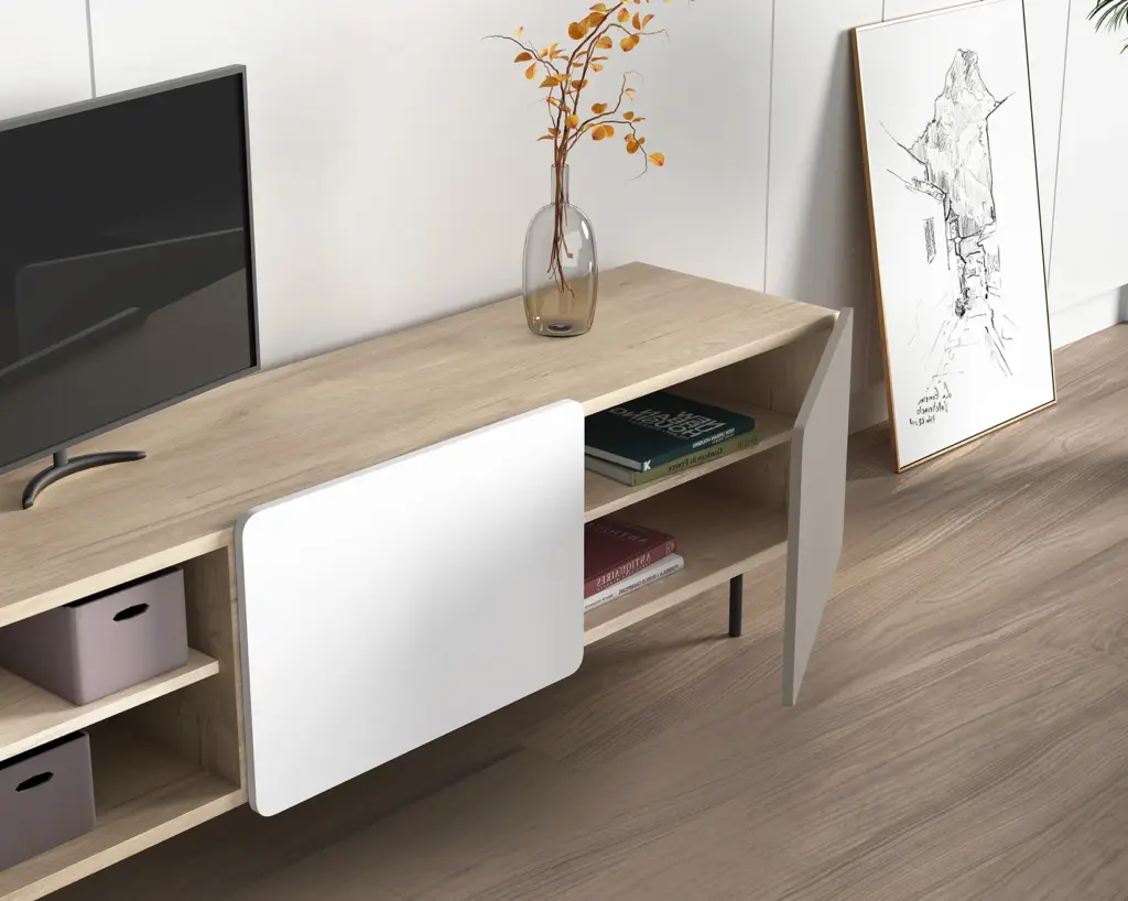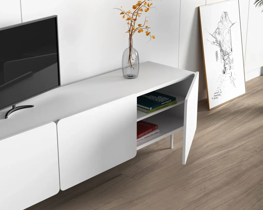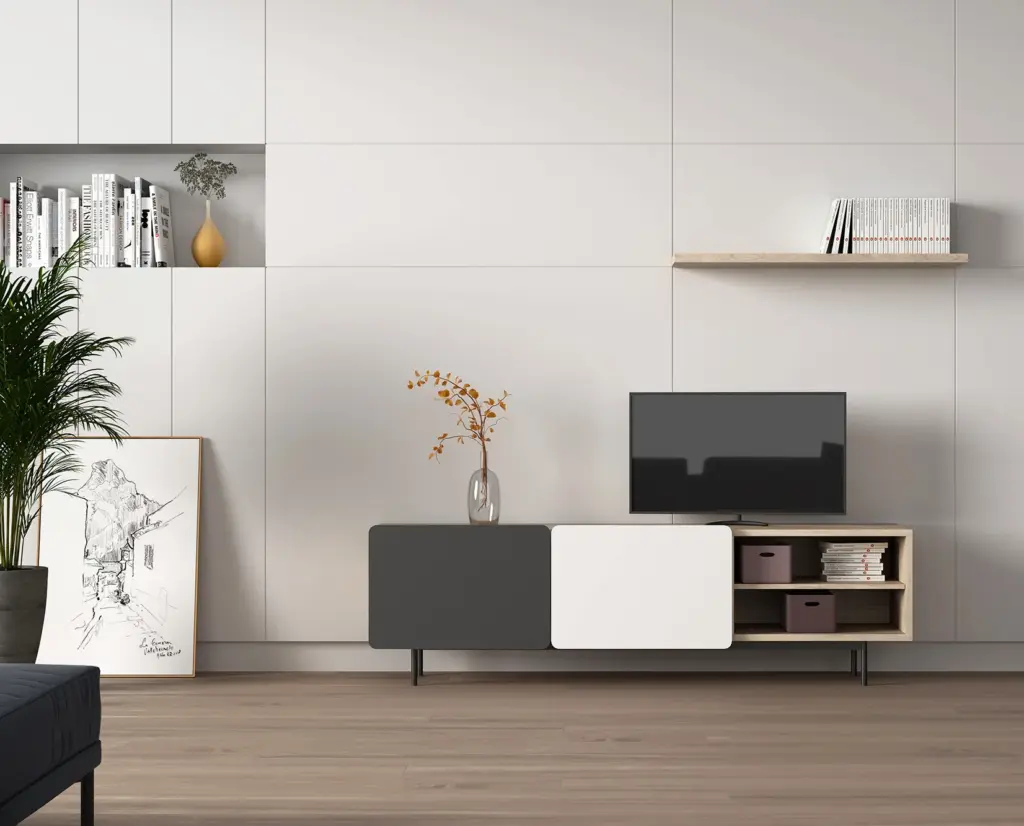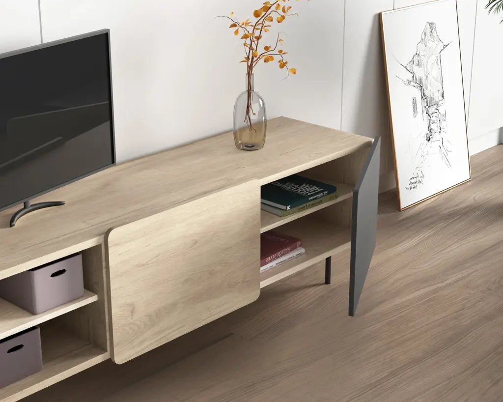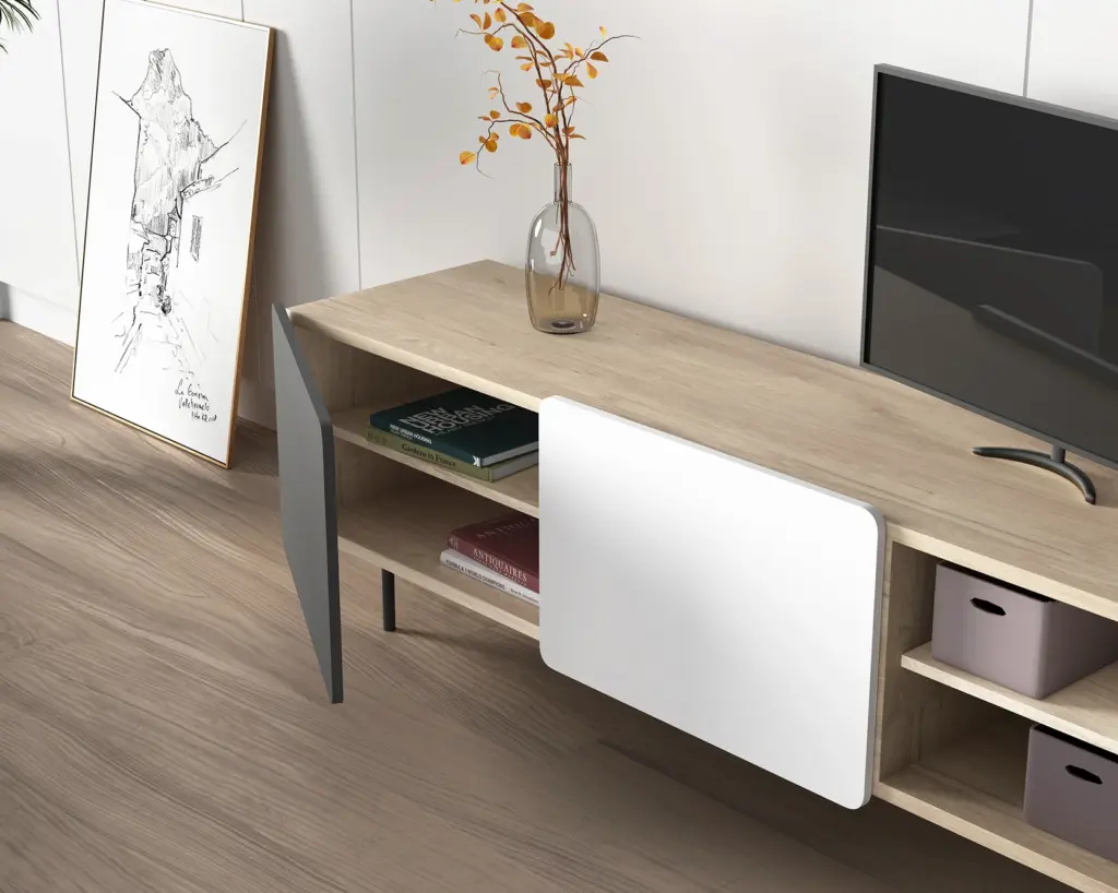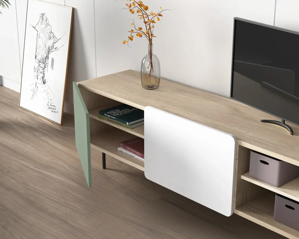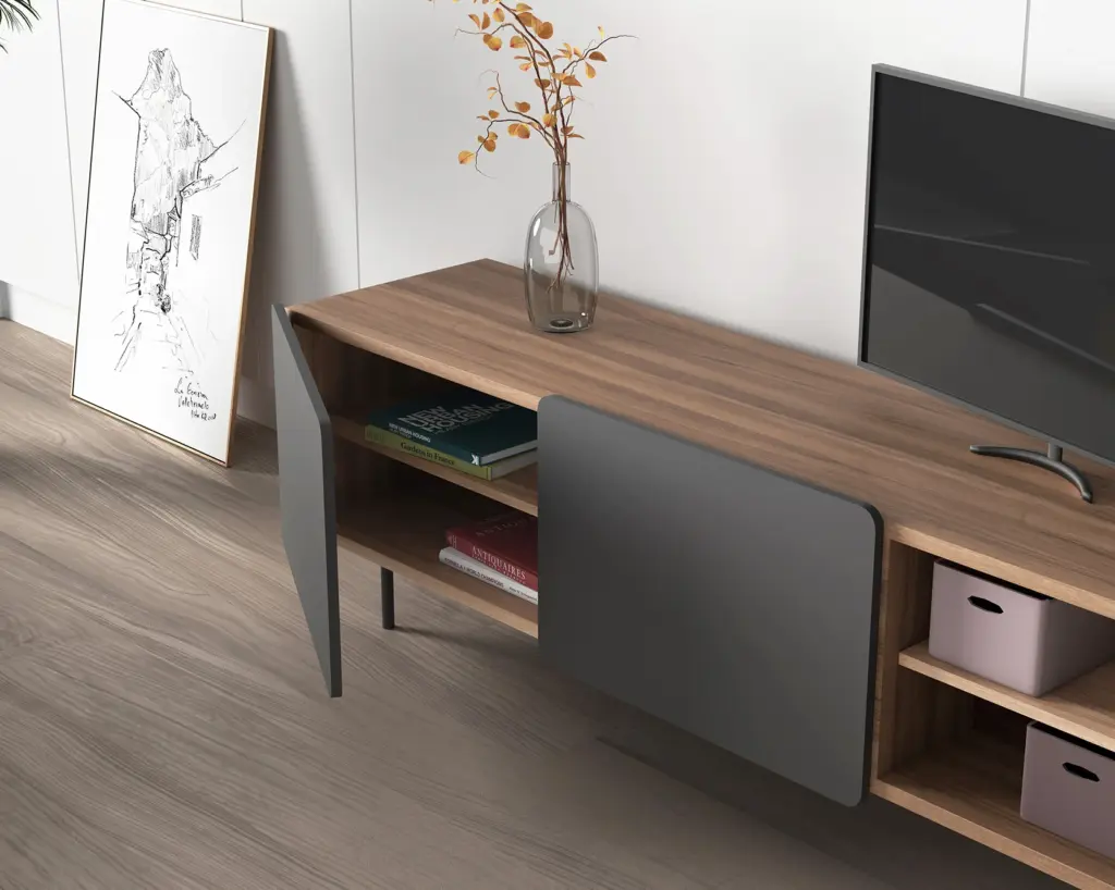Módulo de TV fabricado en melamina con patas metálicas. Múltiples composiciones y acabados te permitirán adaptarlo a tus necesidades sin perder el estilo. Combínalo con los aparadores de la misma colección para crear un ambiente acogedor y elegante.