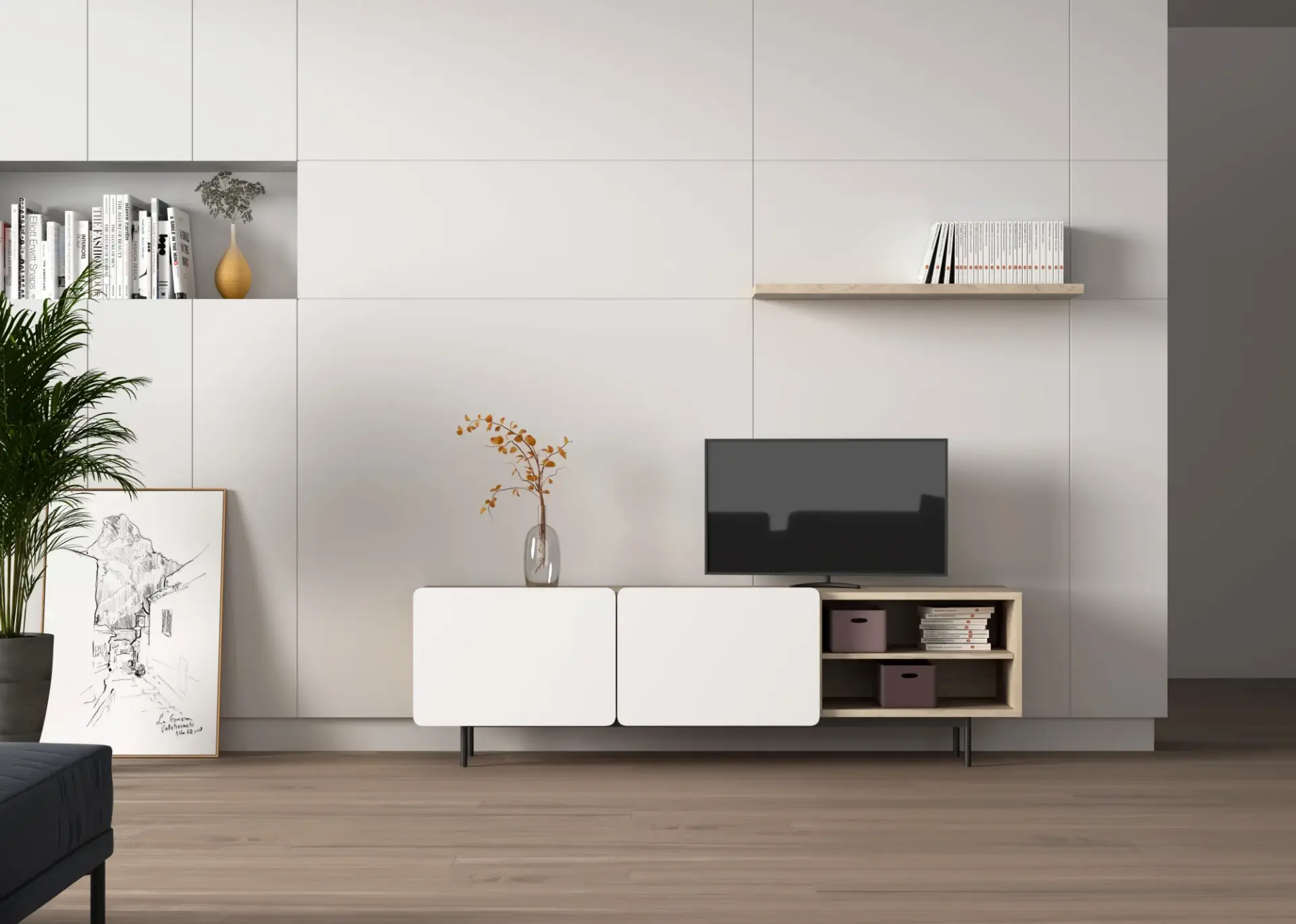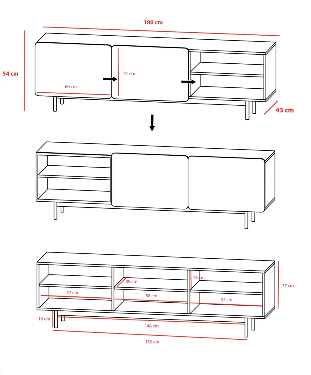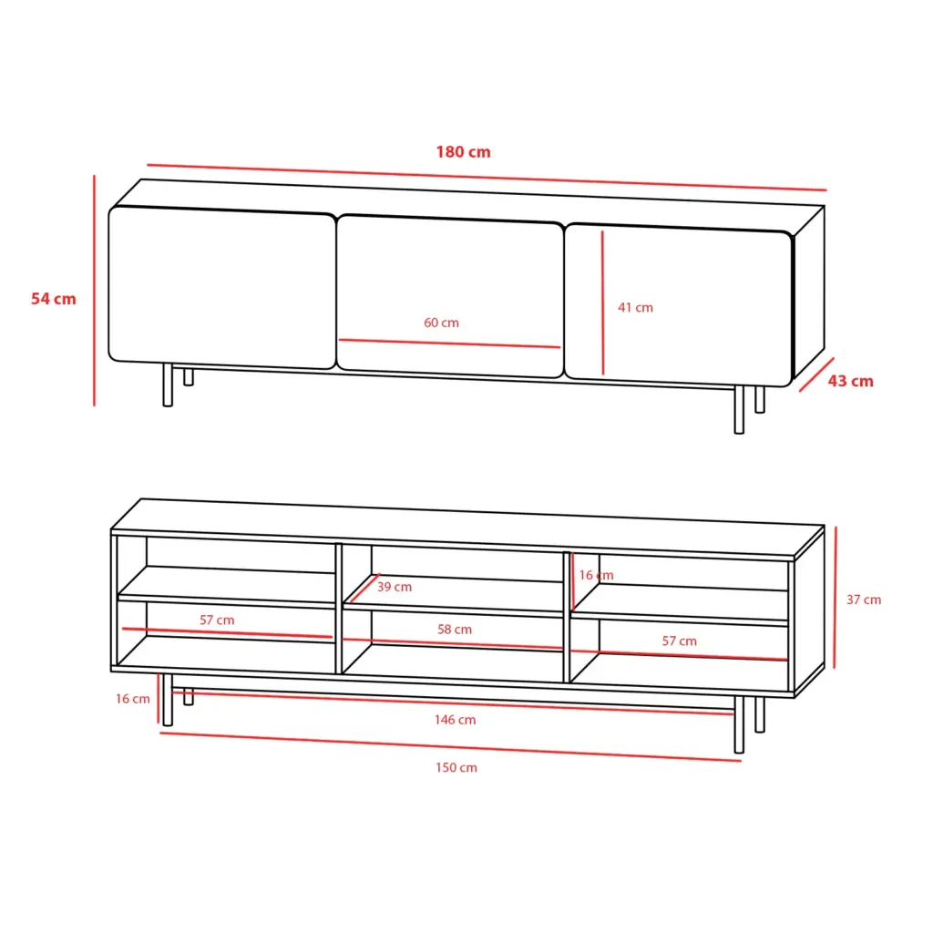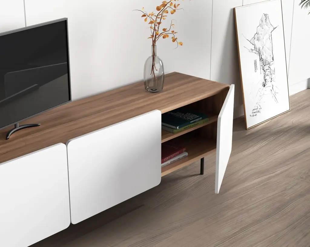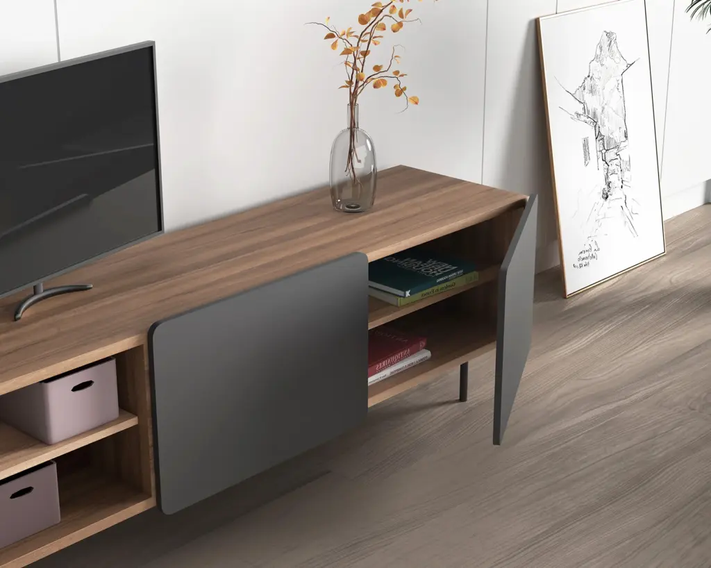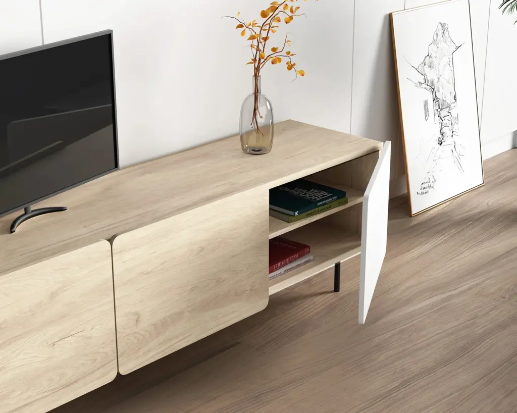 Módulo de TV fabricado en melamina con patas metálicas. Múltiples composiciones y acabados te permitirán adaptarlo a tus necesidades sin perder el estilo. Combínalo con los aparadores de la misma colección para crear un ambiente acogedor y elegante.
