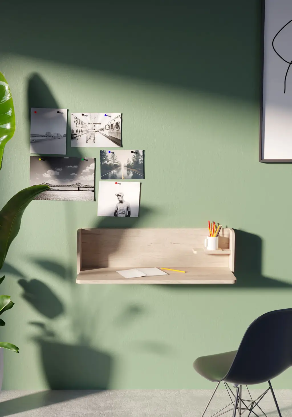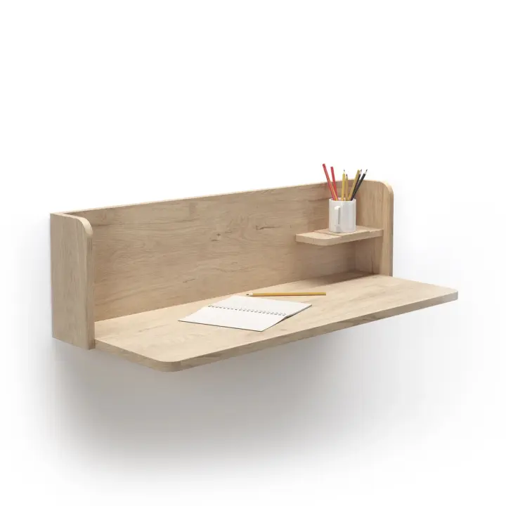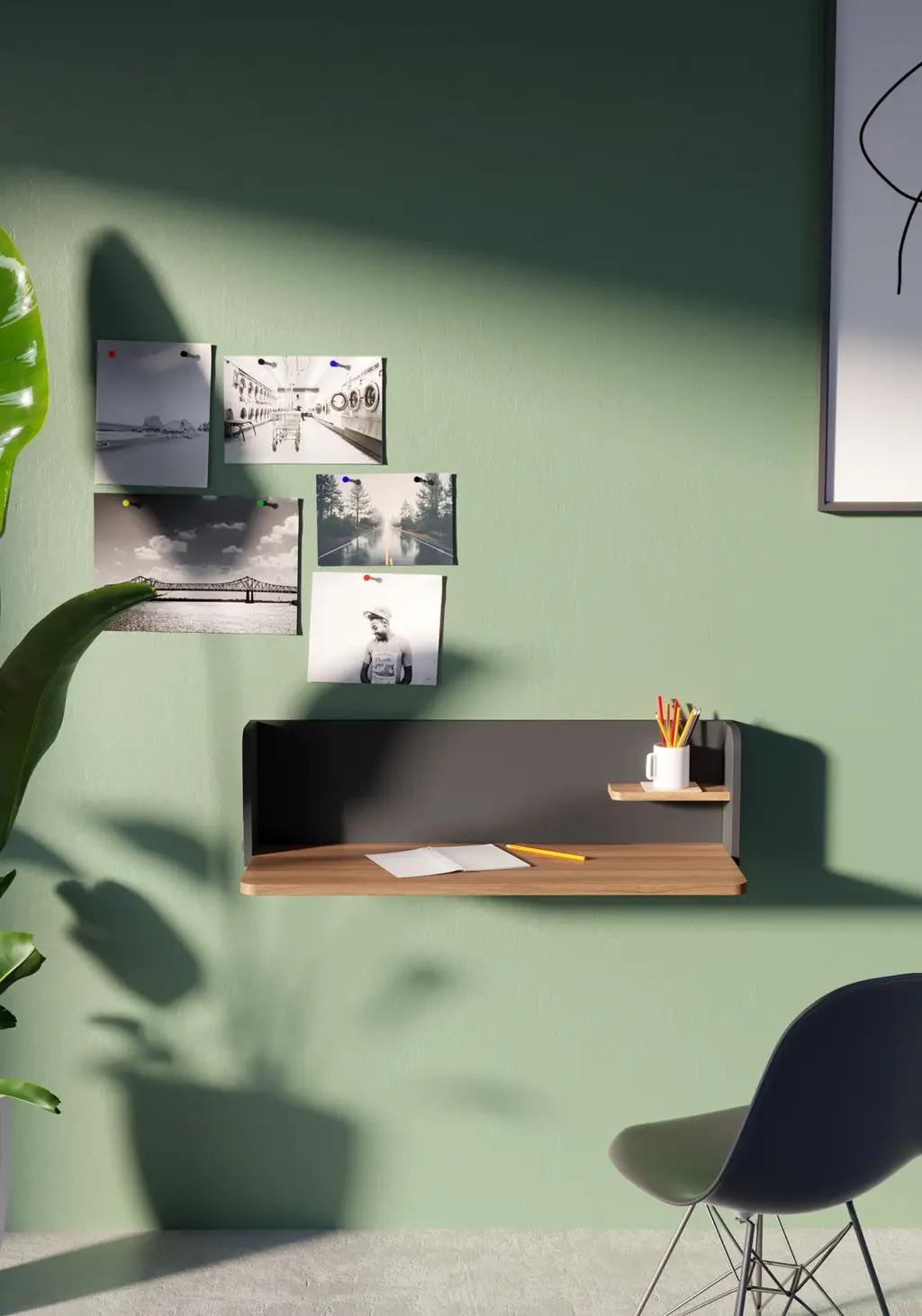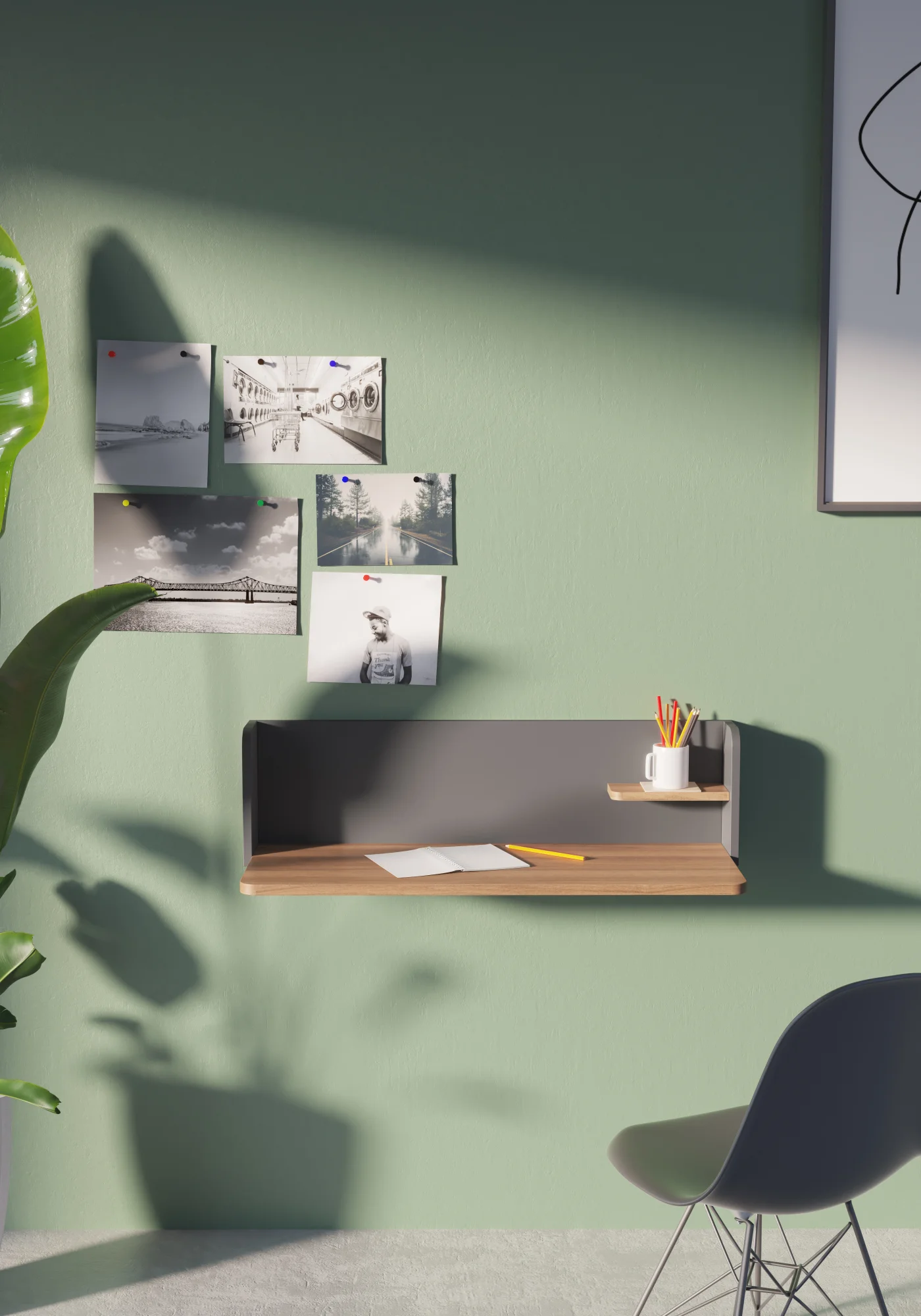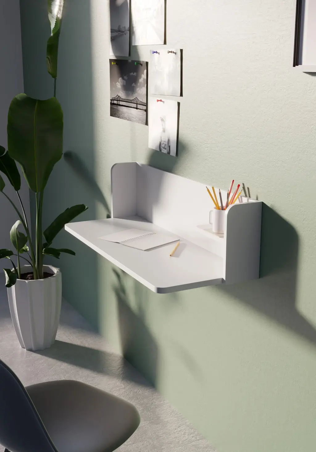 Escritorio suspendido fabricado en melamina. Sus dimensiones lo hacen el elemento ideal para espacios reducidos, sin dejar de aportar la funcionalidad necesaria. El diseño minimalista contribuye a crear un espacio único, ya sea en el despacho o en un rincón del salón.