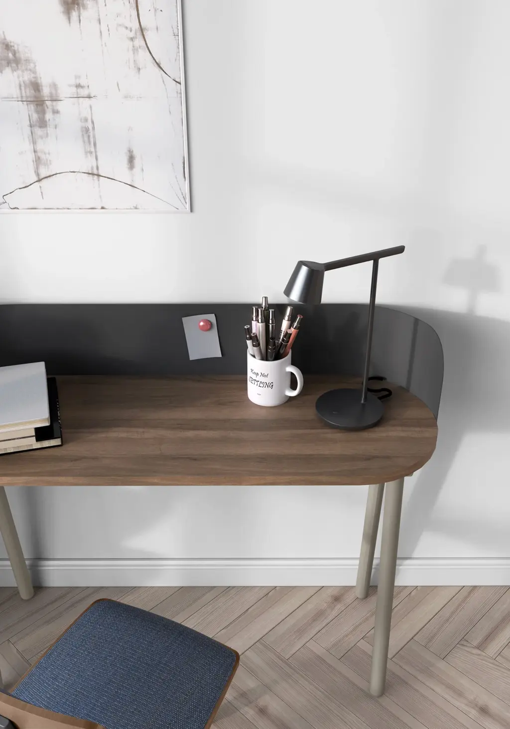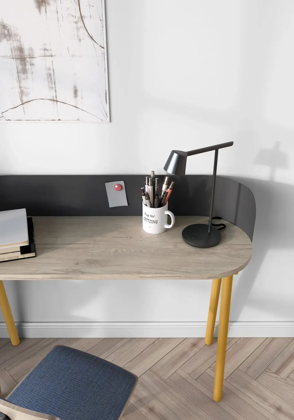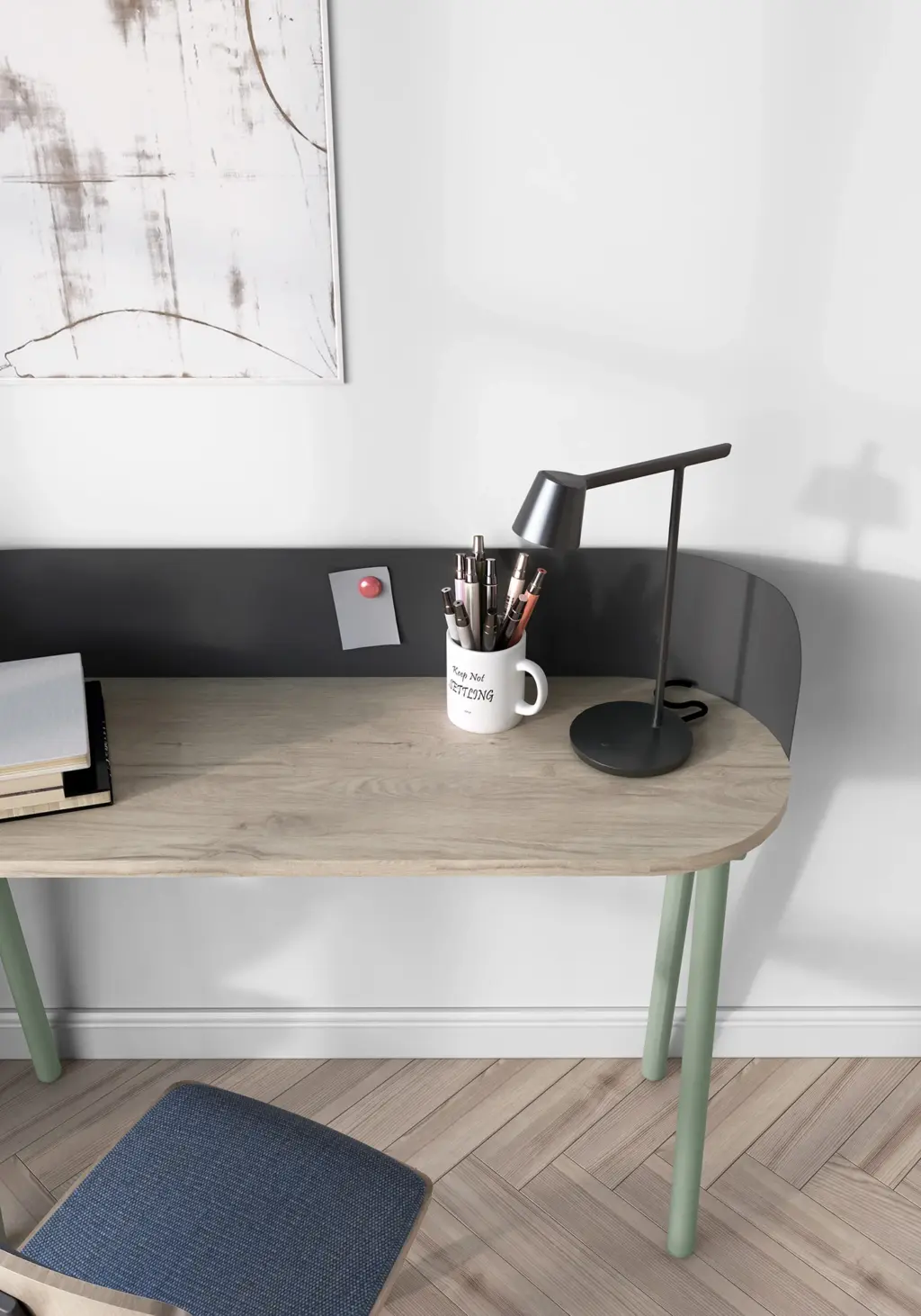 Mesa de estudio sencilla fabricada en melamina, haya maciza y metal. Su amplia tapa dispone de un panel metálico donde podrás pegar tus notas con imanes. Su estilo neutro y sus infinitas posibilidades de color permite adaptarlo a múltiples espacios, ya sea en un dormitorio juvenil o en un despacho general.