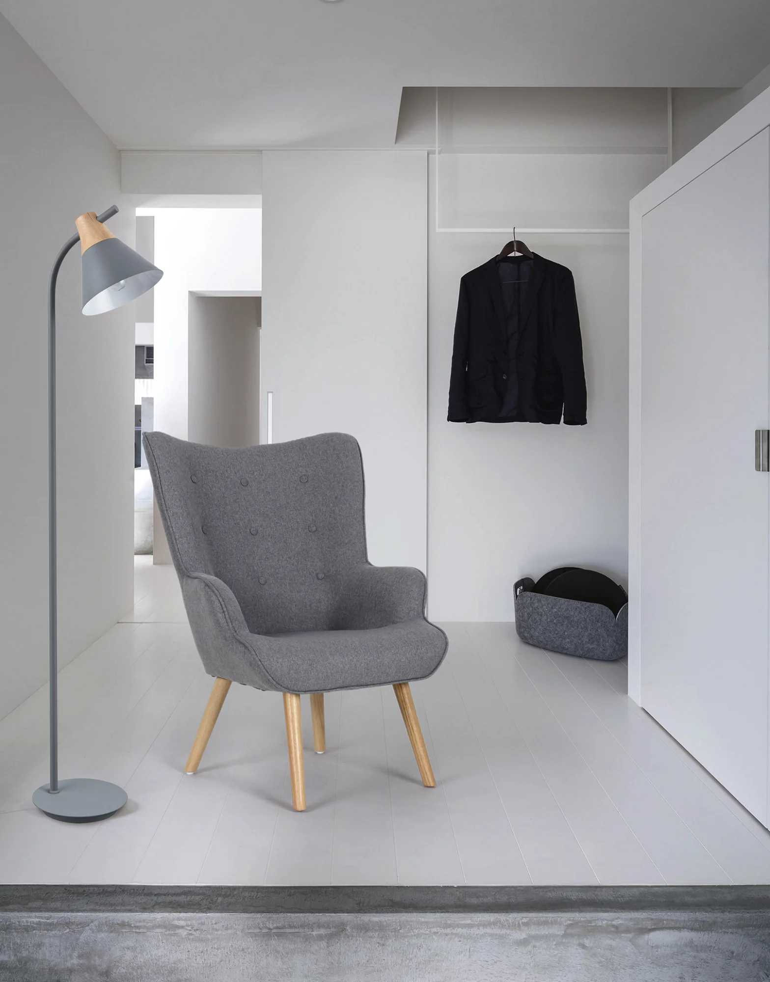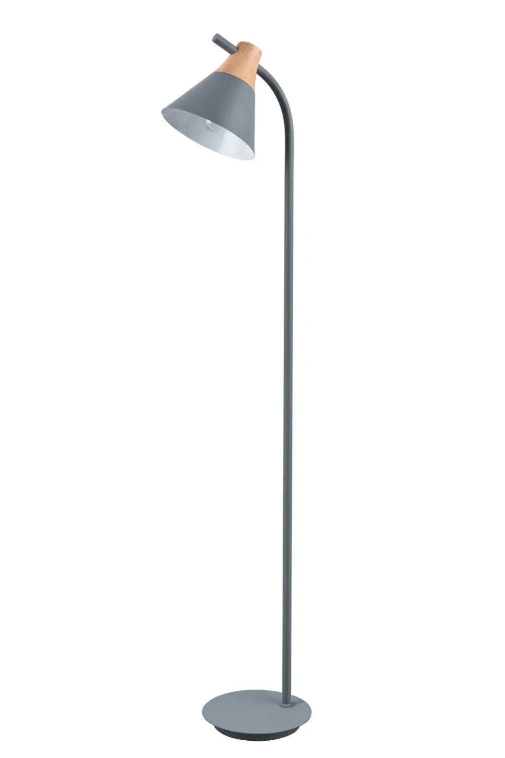 Lámpara de pie en madera y metal de color gris, con una tulipa fija. Su diseño sencillo y estilizado la convierte en una opción versátil para usar en el salón, dormitorio o cualquier espacio común. Compatible con bombillas A++, A+, A, B, C, D, E.