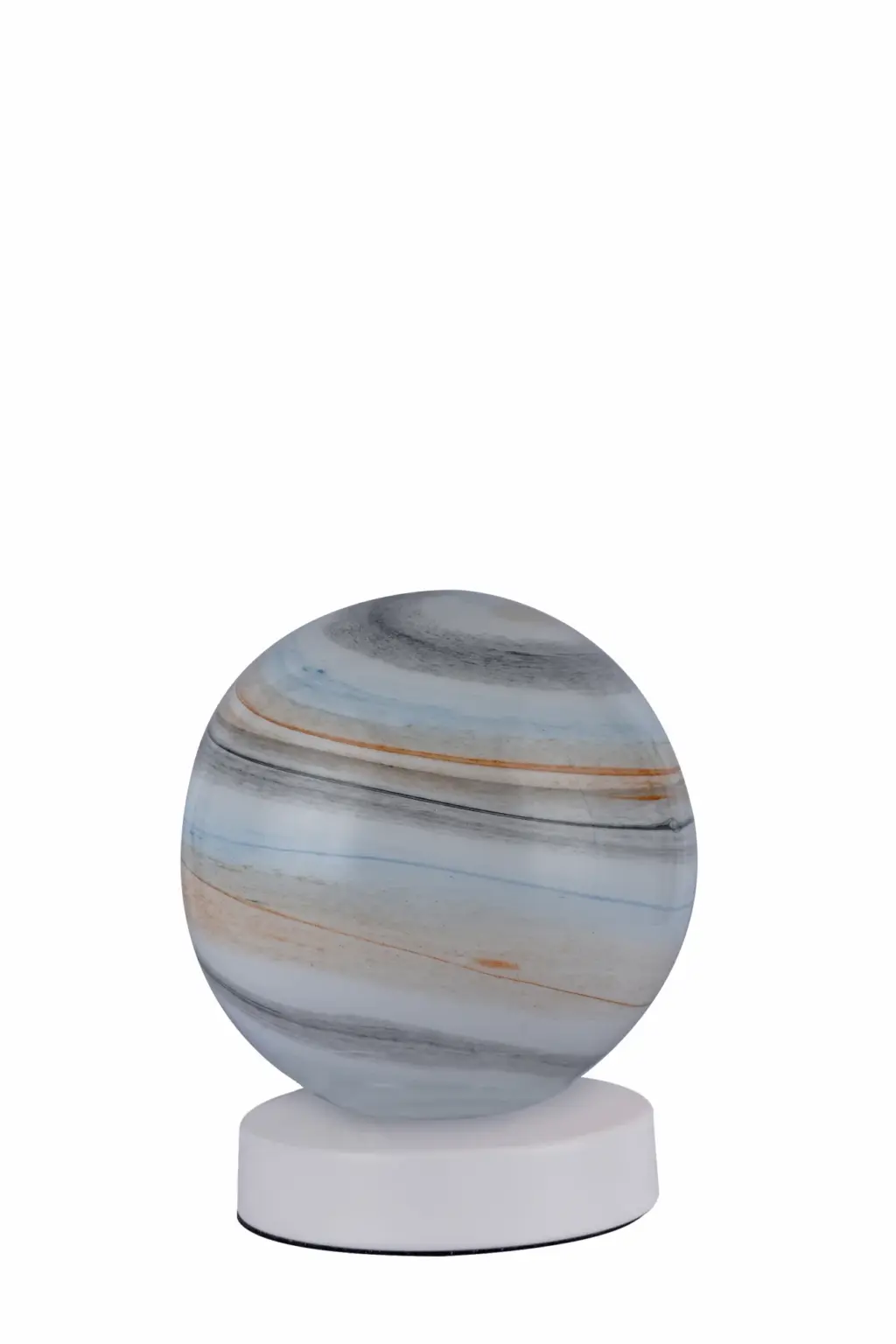Lámpara de mesa fabricada en vidrio y metal con forma esférica. El acabado de la esfera evoca la superficie de un planeta, aportando un toque original y moderno a cualquier espacio. Compatible con bombillas A++, A+, A, B, C, D, E.