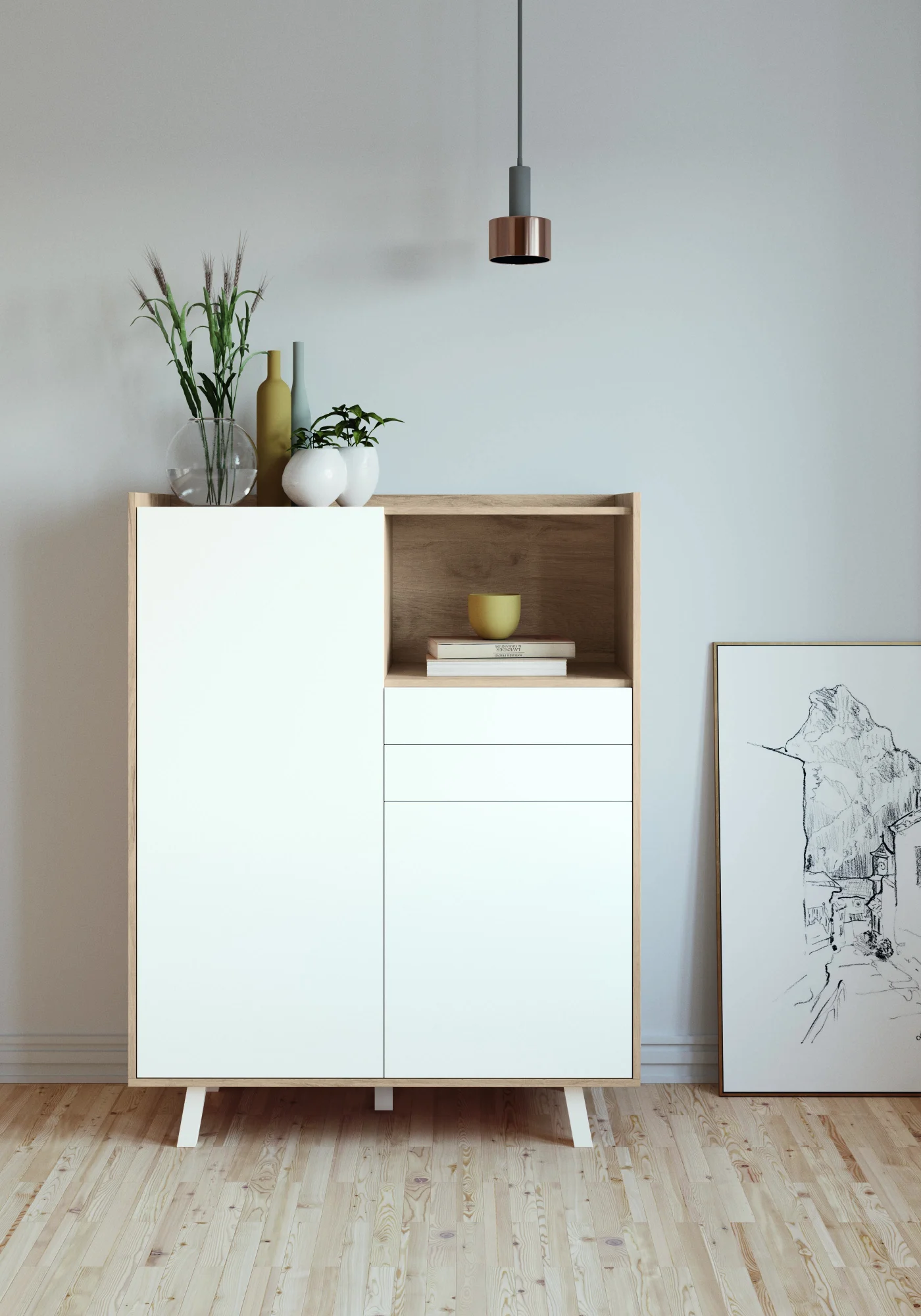 Mueble auxiliar aparador fabricado en melamina. Dispone de dos cajones, dos puertas y un hueco abierto, proporcionándole una gran capacidad de almacenamiento. Su diseño en líneas rectas aporta un toque actual y los múltiples acabados disponibles te dejarán adaptarlo al estilo de tu hogar.