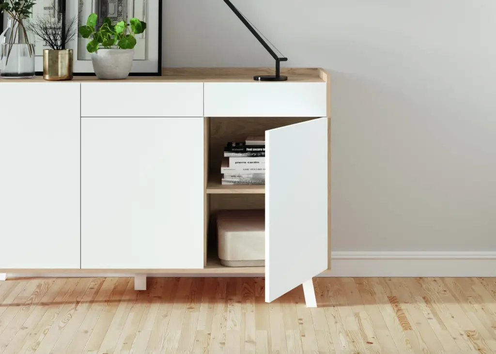 Mueble aparador fabricado en melamina con patas de madera de haya. Combínalo con el módulo de TV de la misma colección para crear un ambiente moderno en tu salón, sin dejar de lado la practicidad.