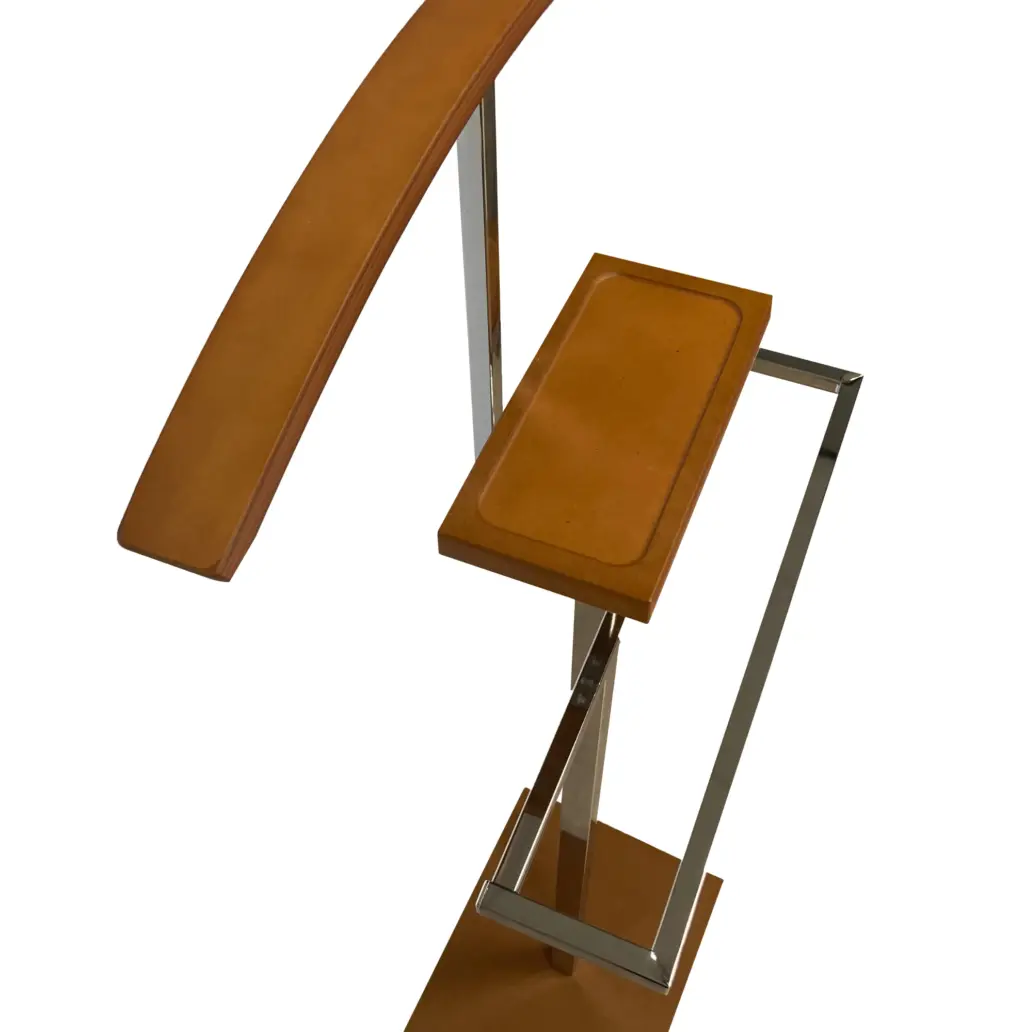 Galán de noche en metal con detalles en madera en color cerezo. Diseño sencillo y moderno, perfecto como complemento fucional del dormitorio.
