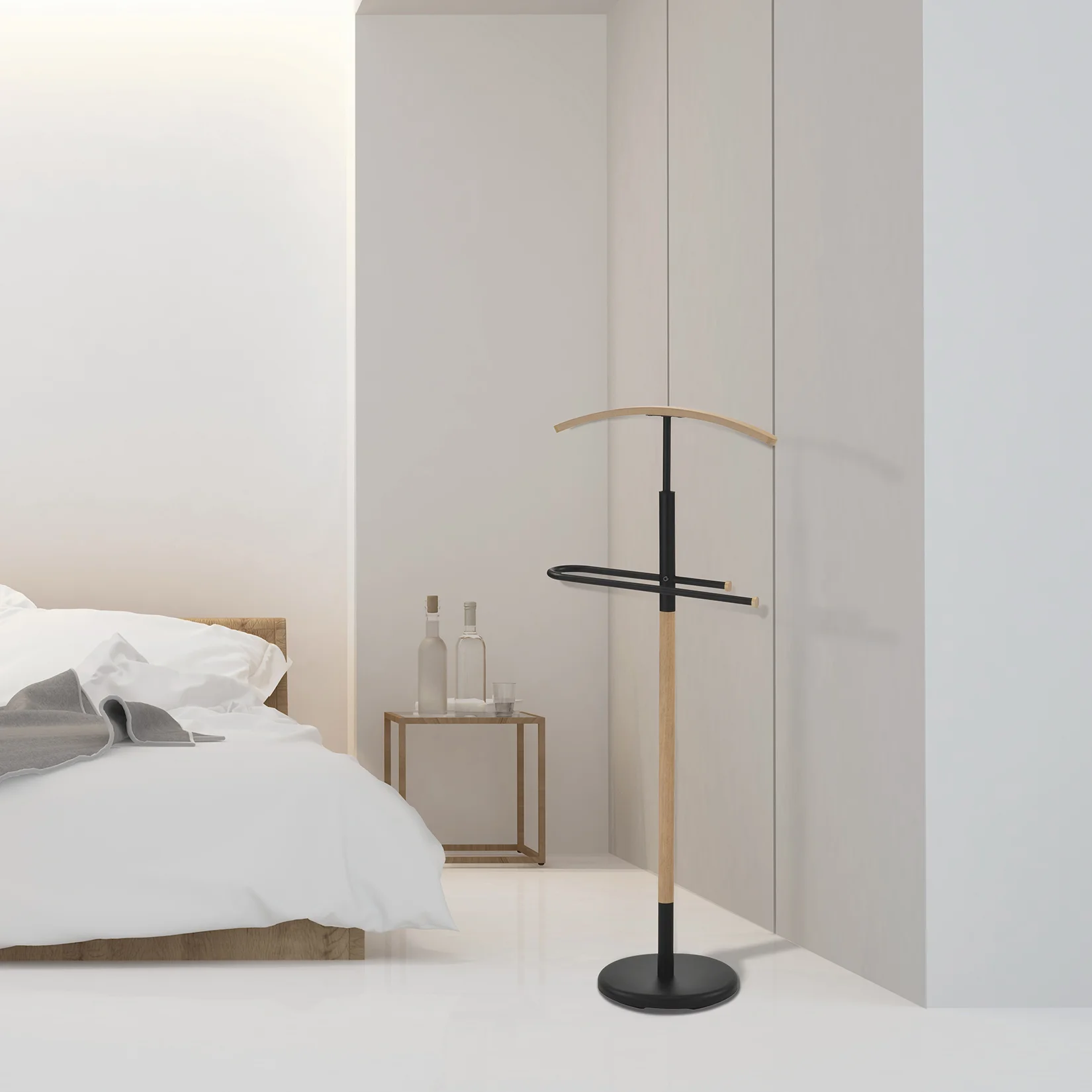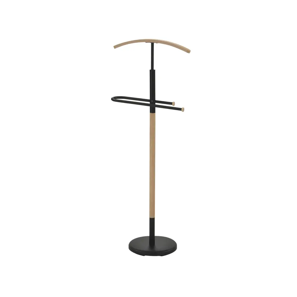 Galán de noche que combina madera y metal en color negro y roble. Formado por percha y pantalonera, será el mejor accesorio del dormitorio.