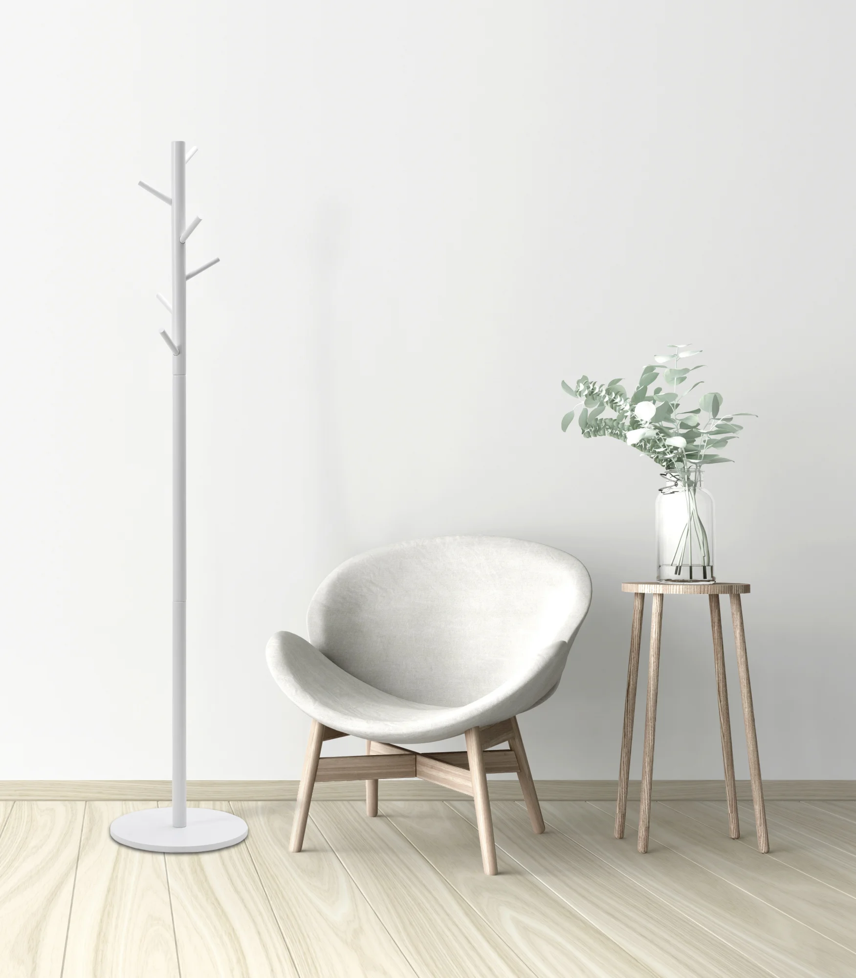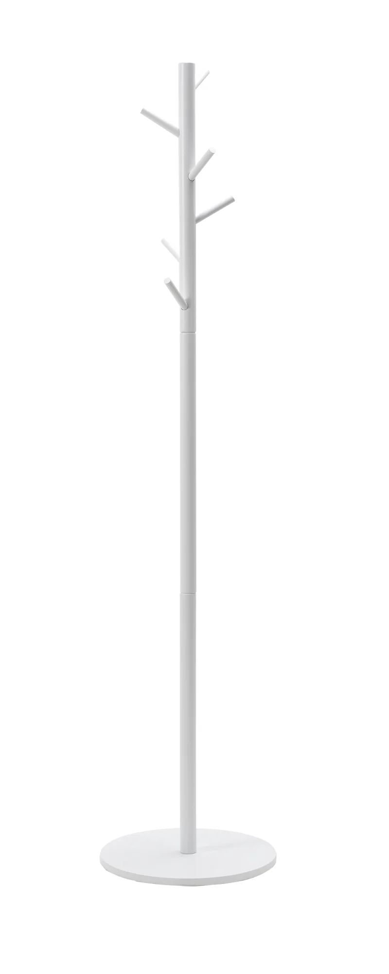 Perchero de pie en madera de haya lacado en color blanco. El diseño en forma de árbol permite colgar varias prendas en distintas alturas.