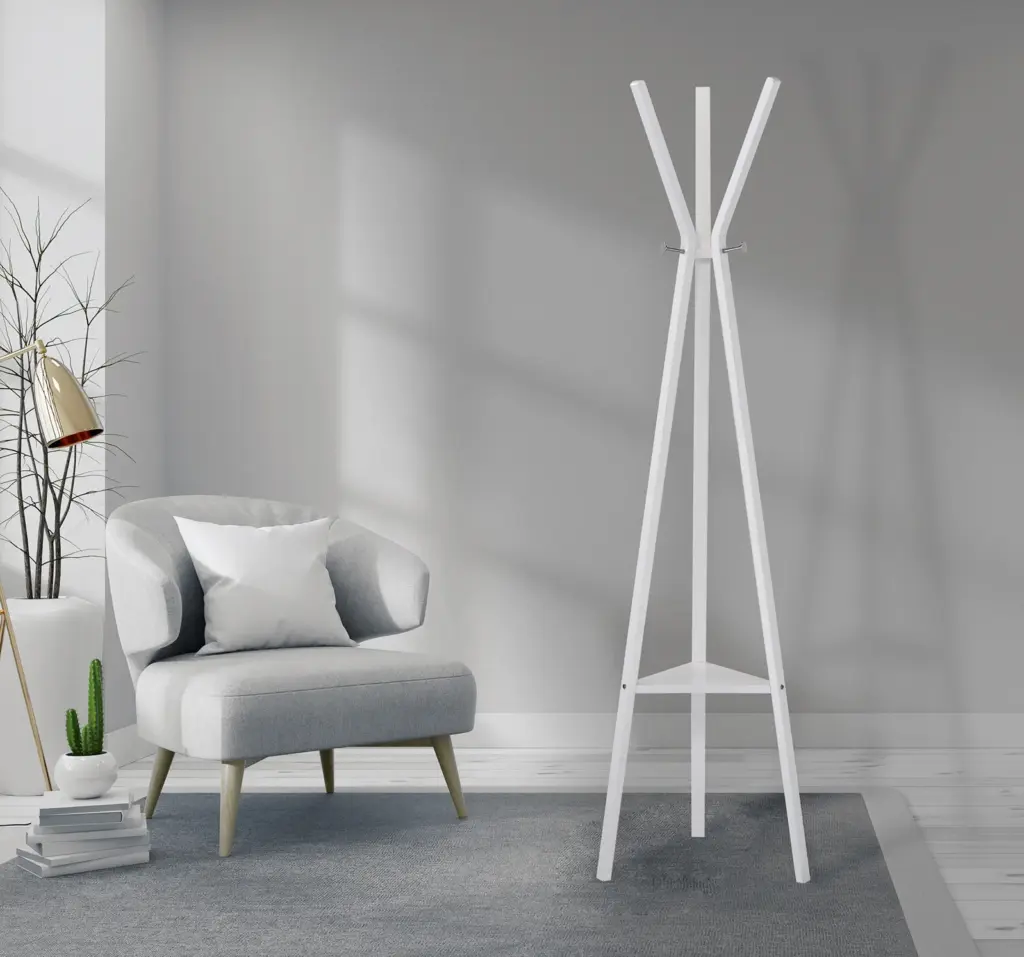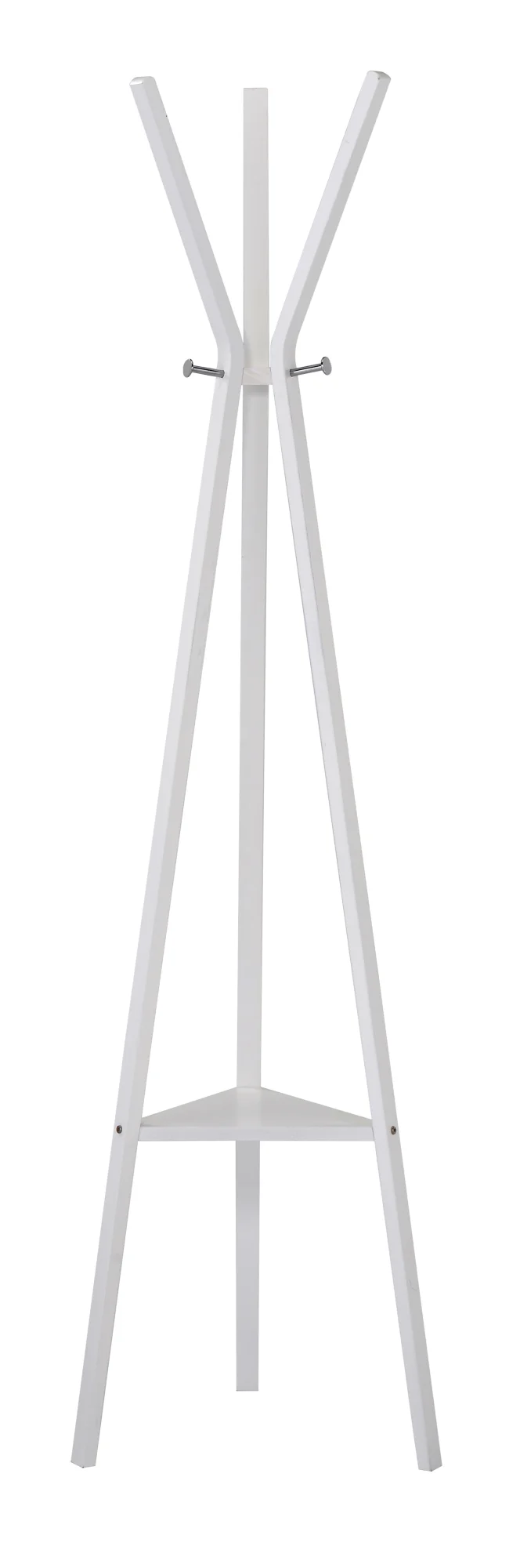 Perchero fabricado en madera y metal en color blanco. La forma de tipi le da un toque original. Dispone de 6 colgadores y de un estante para dejar pequeños objetos. Ideal para la entrada, el dormitorio, la oficina…
