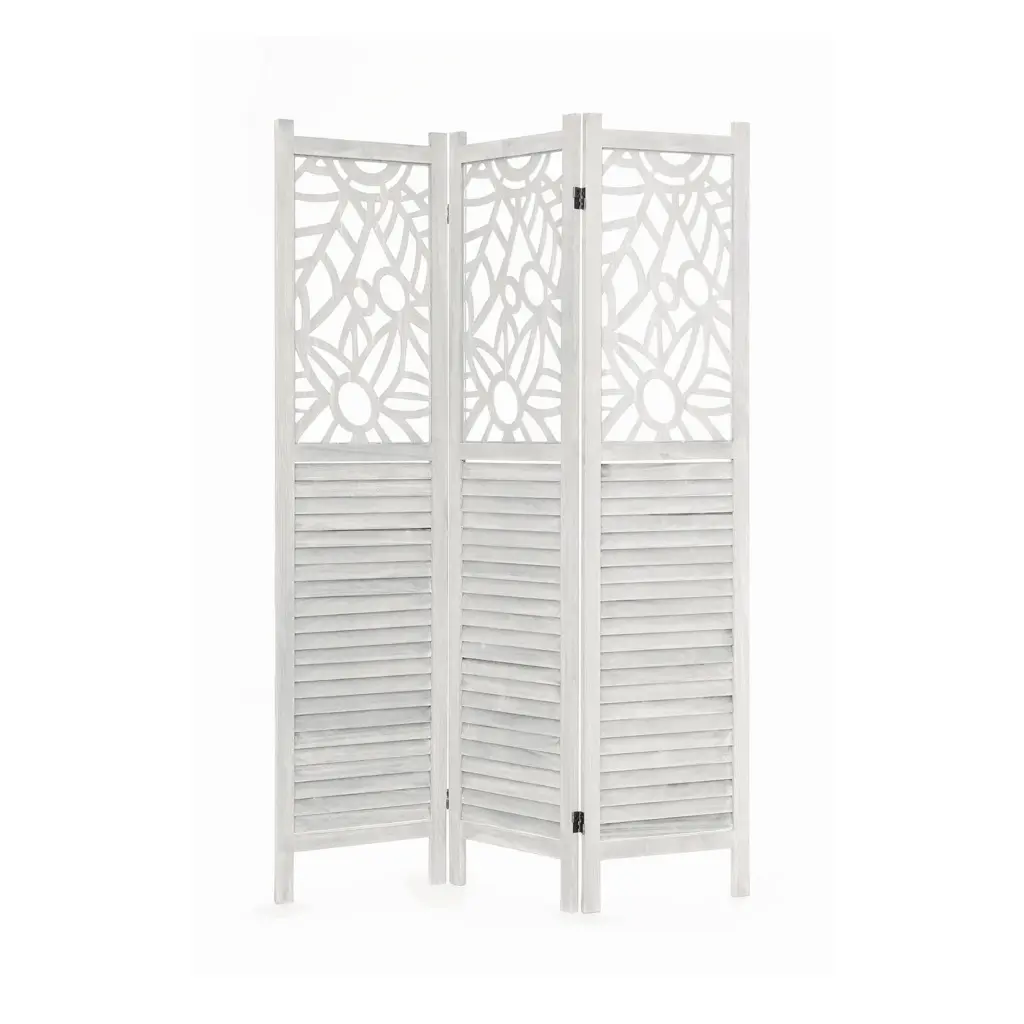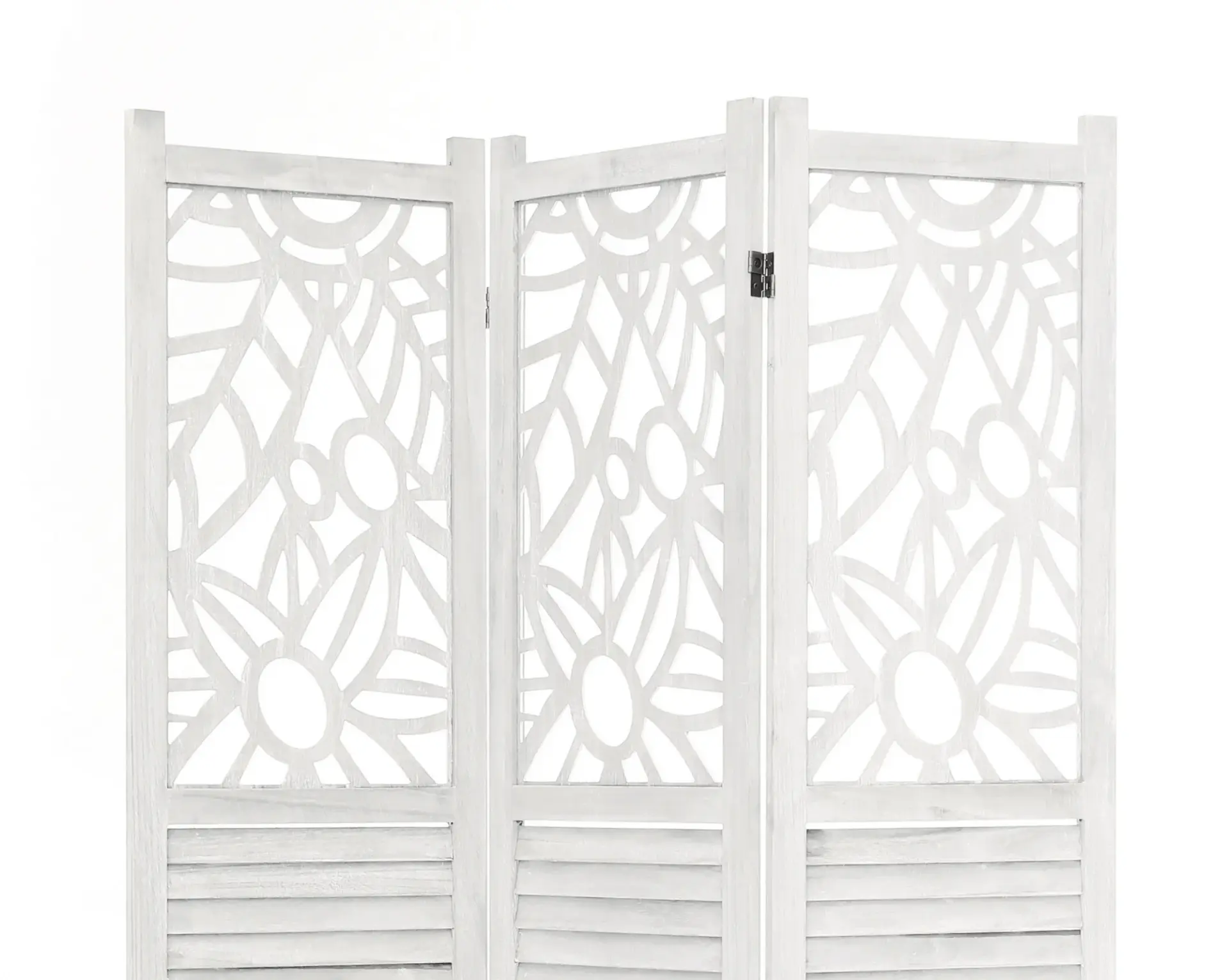 Biombo de madera en color blanco desgastado. Original diseño que combina láminas y un troquelado con motivo floral. Formado por 3 paneles unidos mediante bisagras de apertura 360º, perfecto para separar espacios.