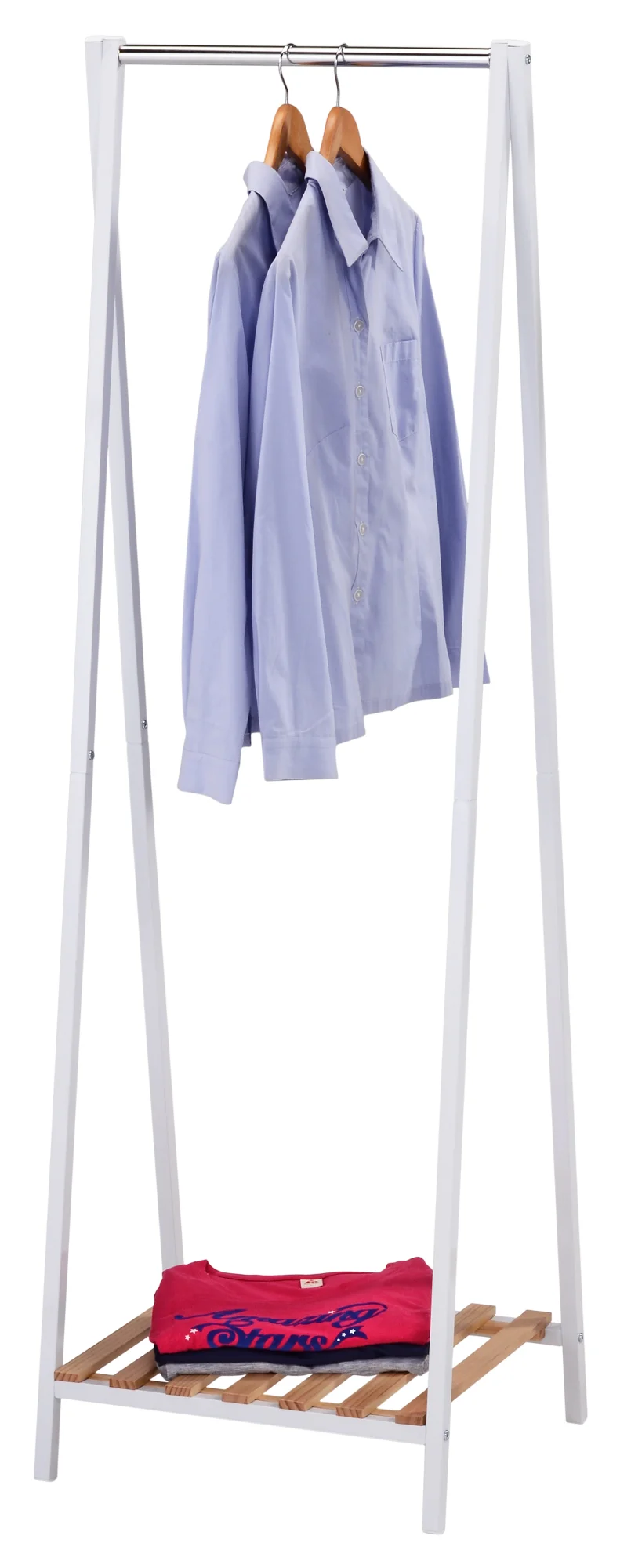 Perchero-parabán con estructura metálica blanca en forma de 'bisagra'. Dispone de una barra superior para colgar prendas y una base de melamina en tono roble, ideal para colocar zapatos o cajas. Su estilo y sus dimensiones lo hacen perfecto para espacios pequeños o como complemento auxiliar en el dormitorio, el vestidor o la entrada.