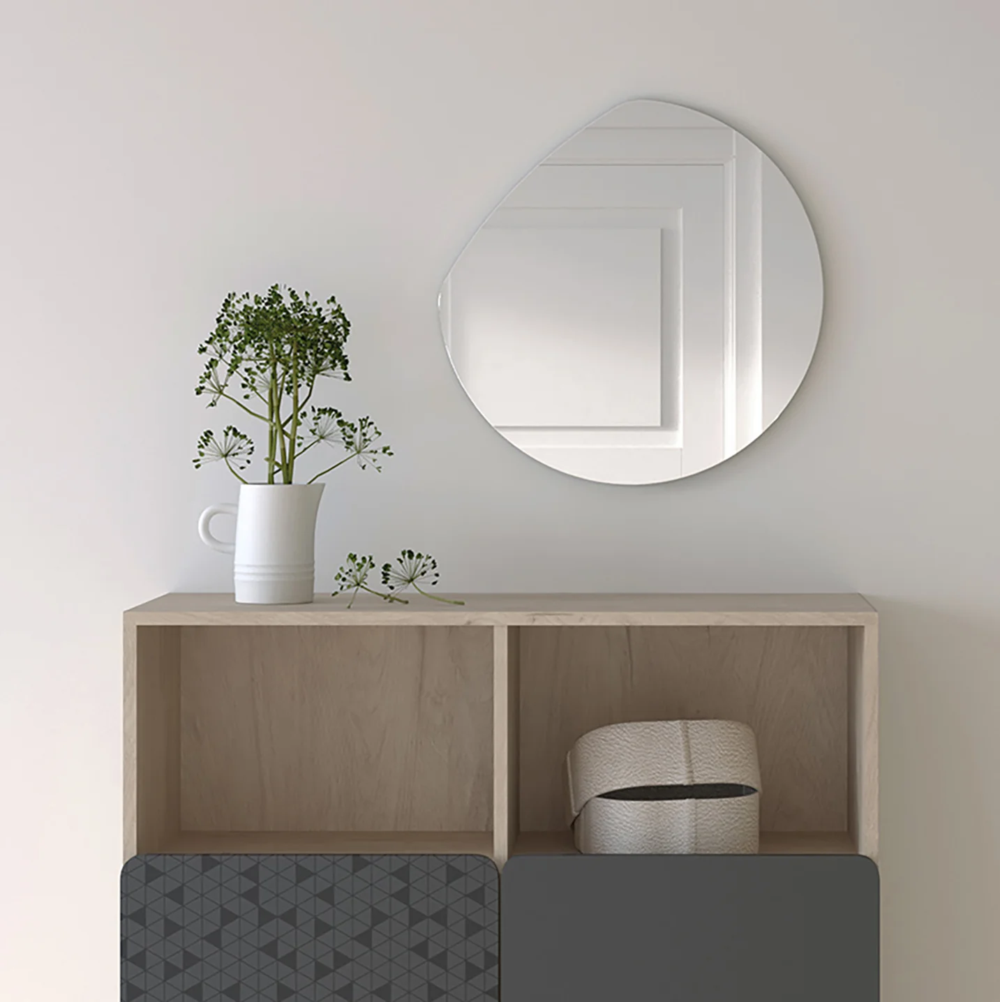 Espejo asimétrico con trasera fabricada en MDF. El perfil de madera es visible, por lo que lo podrás lacar en múltiples colores para complementar tus espacios a la perfección. Lo podrás combinar con los modelos 718 y 719 del mismo diseño para crear ambientes únicos.