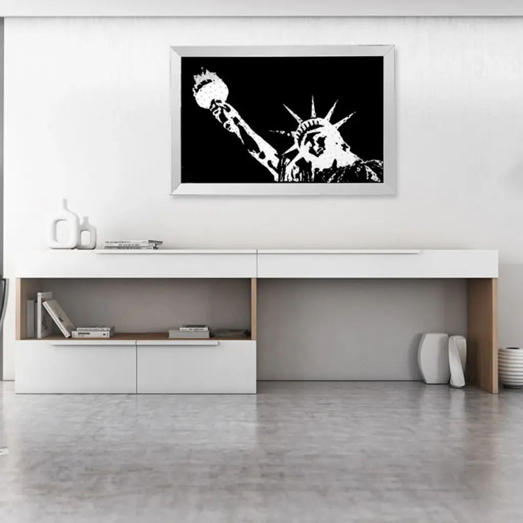Marco decoración en negro y plata. Diseño de la Estatua de la Libertad con detalles brillantes. Perfecto para los amantes de la cultura norteamericana.