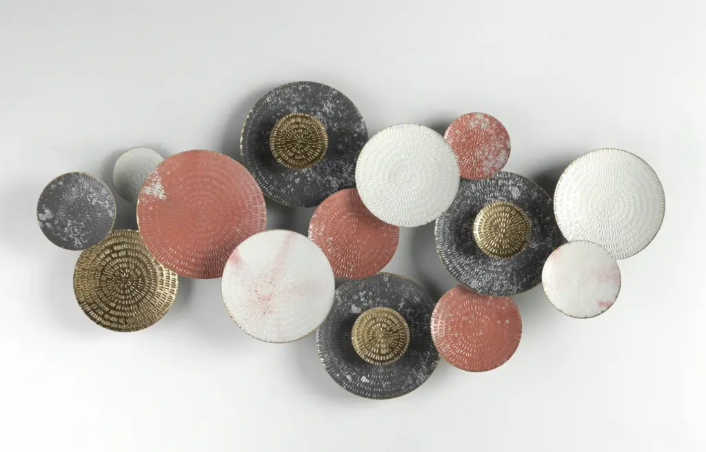 Estructura metálica abstracta de platos en distintos tamaños en colores rojos, blancos, azules y dorados. Pieza perfecta para añadir un toque de textura en cualquier espacio.