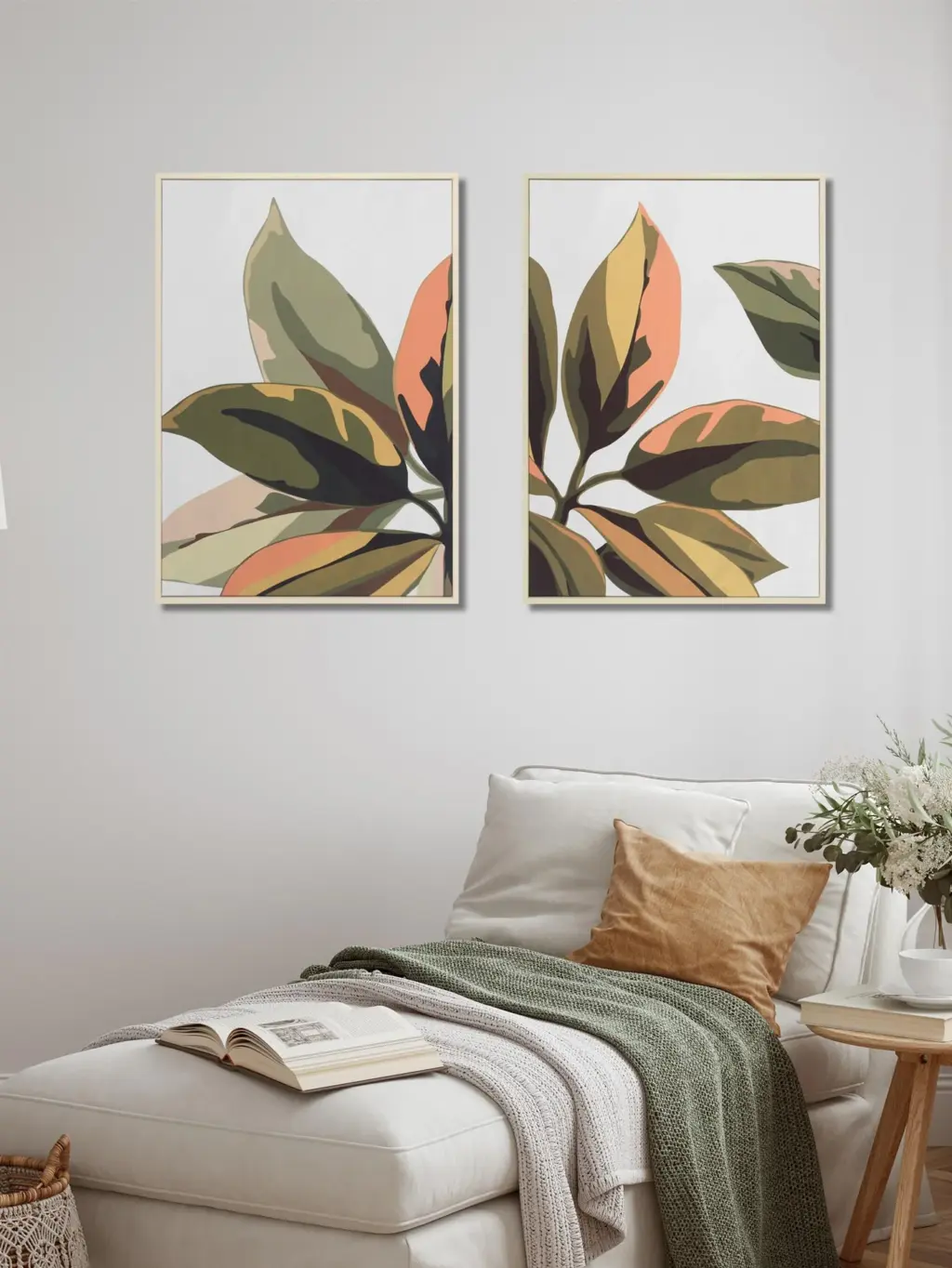 Dúo de lienzos enmarcados que capturan la esencia botánica con pinceladas de contraste sobre fondo blanco. Marcos con acabado madera natural proporcionan calidez y sofisticación.