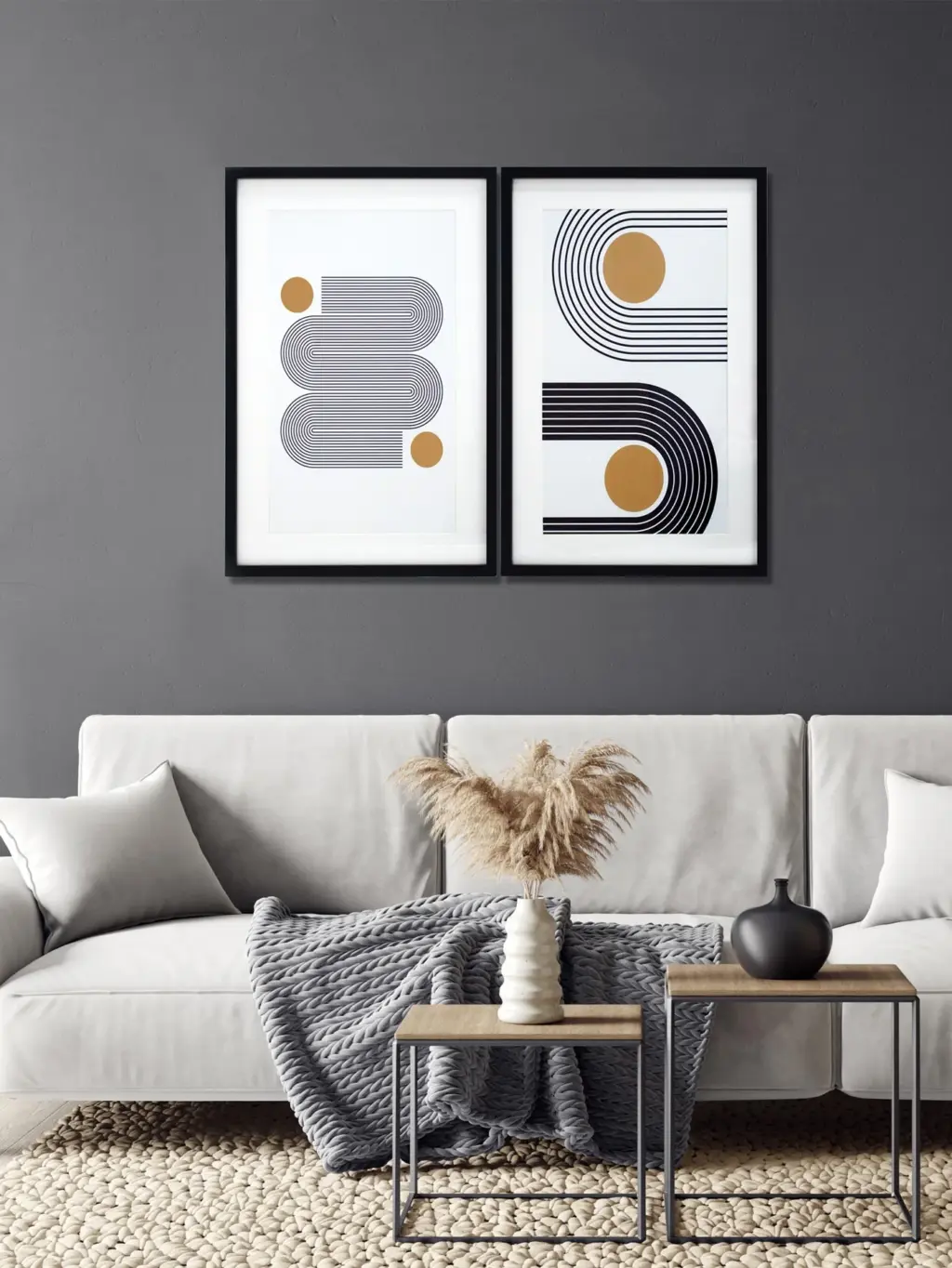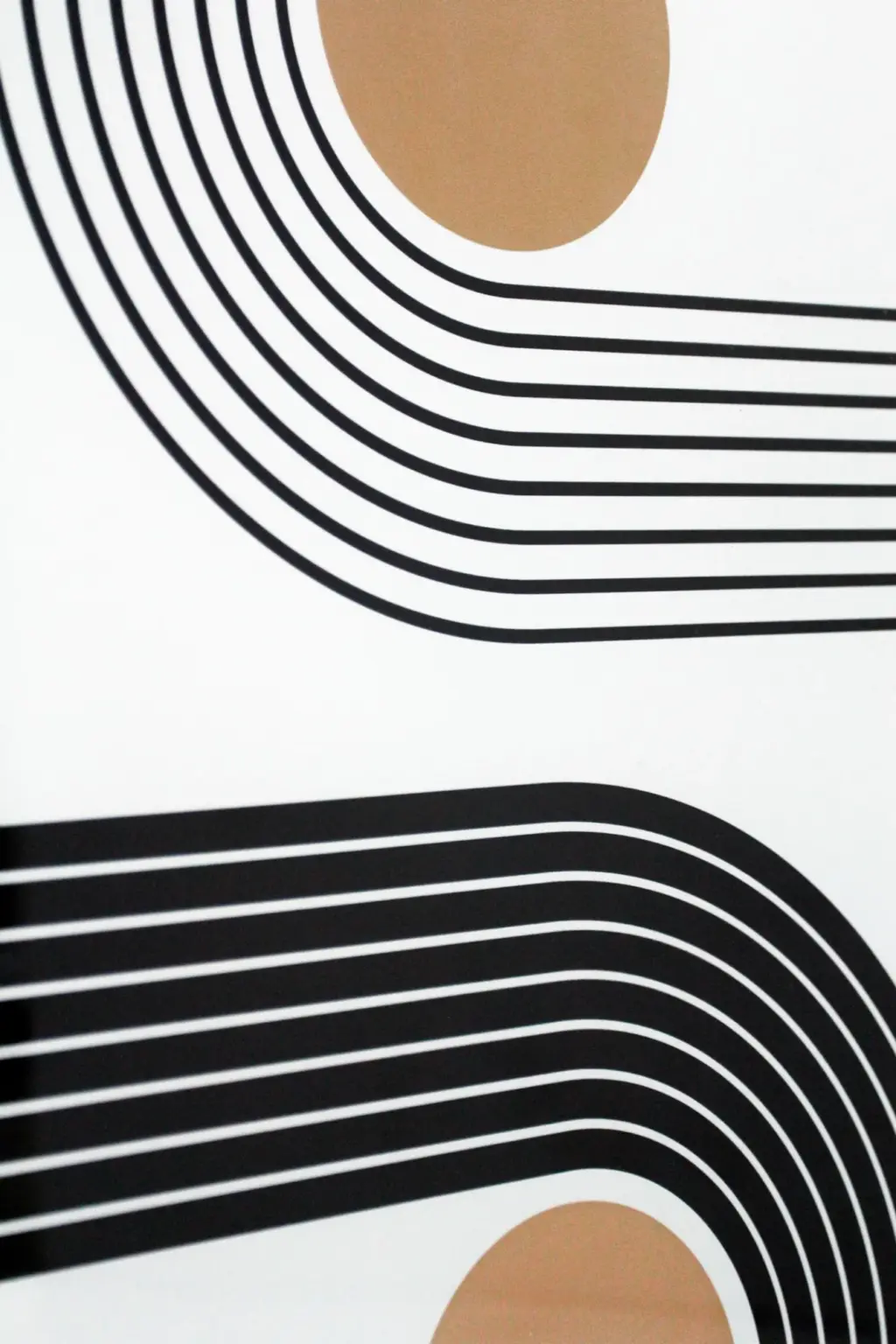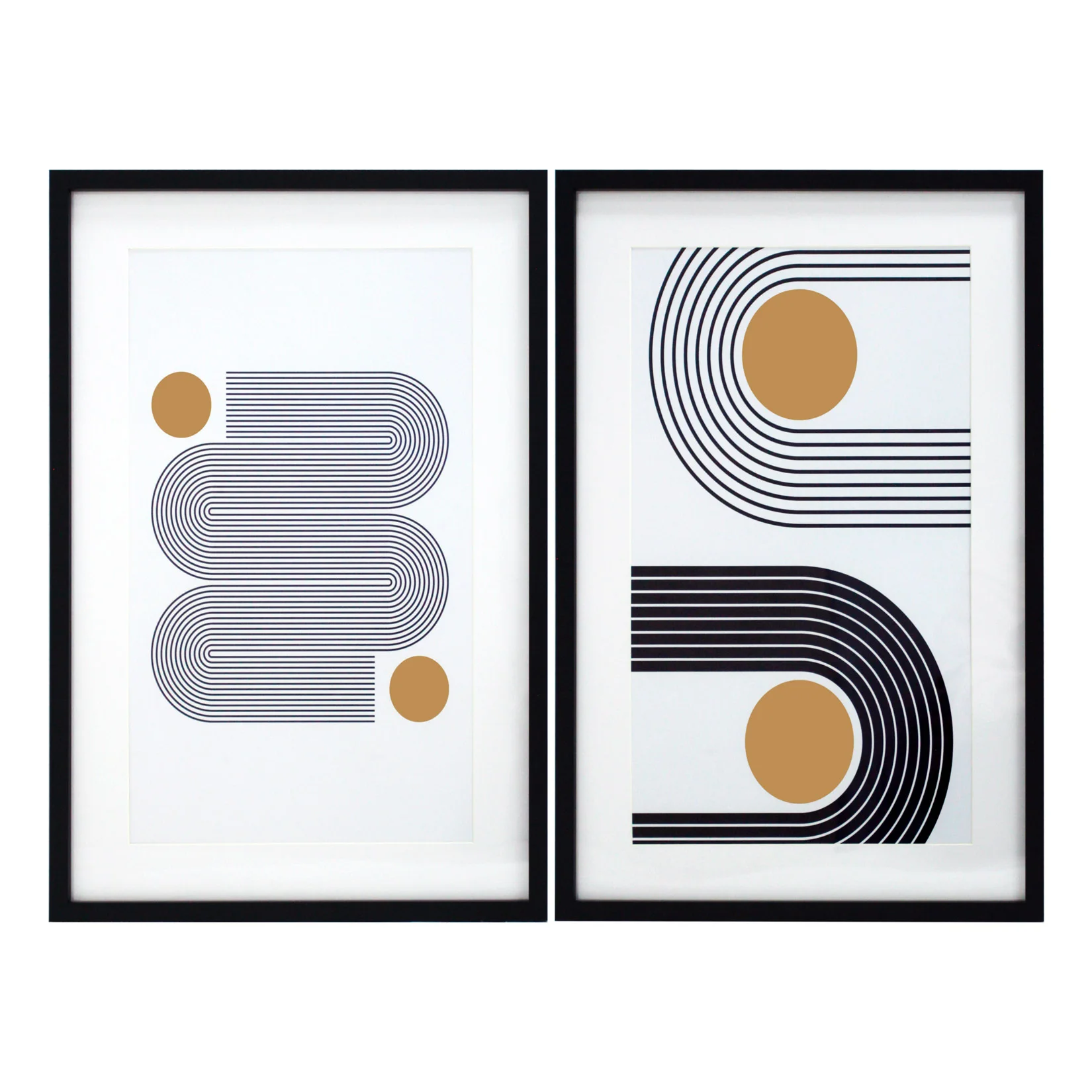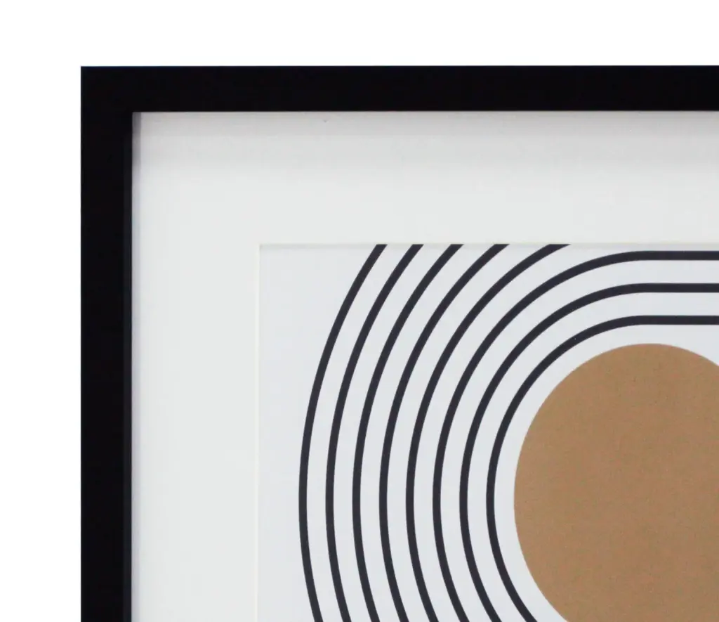 Dos Láminas impresas en papel grueso con diseño geométrico, protegidas por cristal de poliestireno y enmarcadas en MDF negro. Su estilo moderno es ideal para oficinas y hogares urbanos.