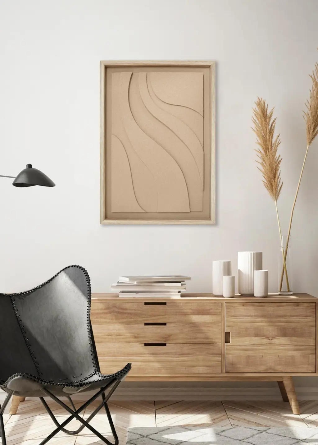 Cuadro de espuma de poliuretano con relieve 3D pintado en color crema. Marco MDF con acabado natural y trasera reforzada en MDF para mayor firmeza. Perfecto para decorar ambientes contemporáneos.