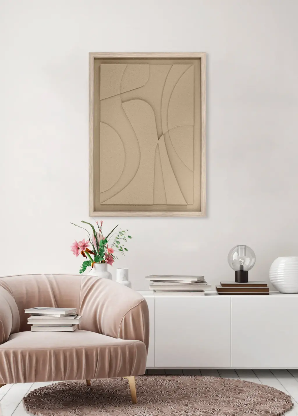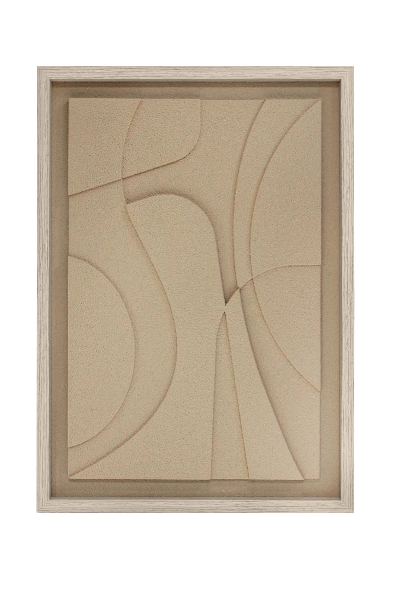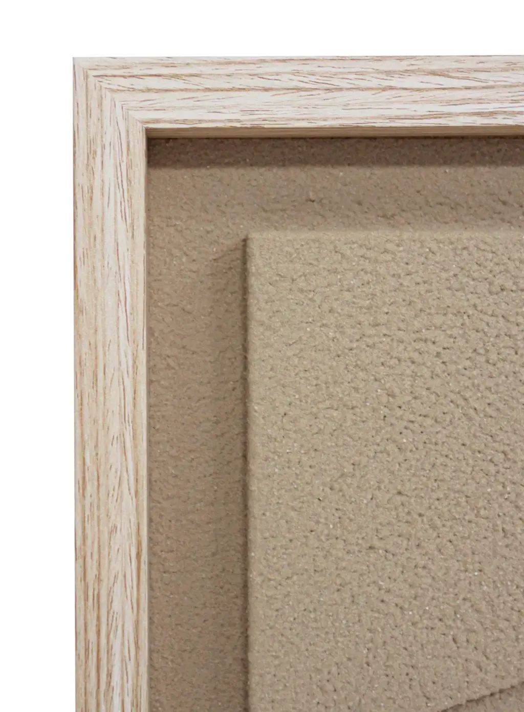 Cuadro tridimensional en espuma de poliuretano con relieve pintado en tonos neutros. Su marco de MDF con acabado madera natural y trasera de MDF ofrecen estabilidad y elegancia. Perfecto para decoraciones modernas o minimalistas.