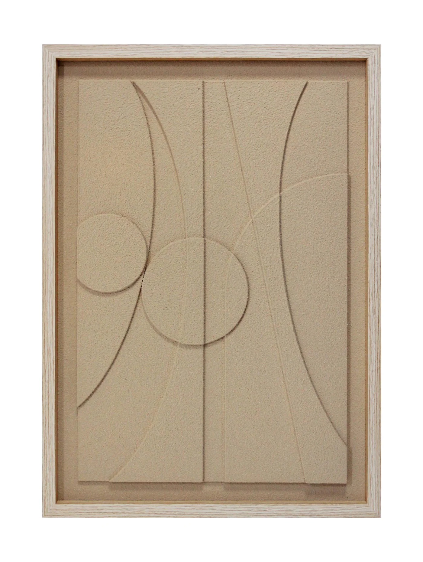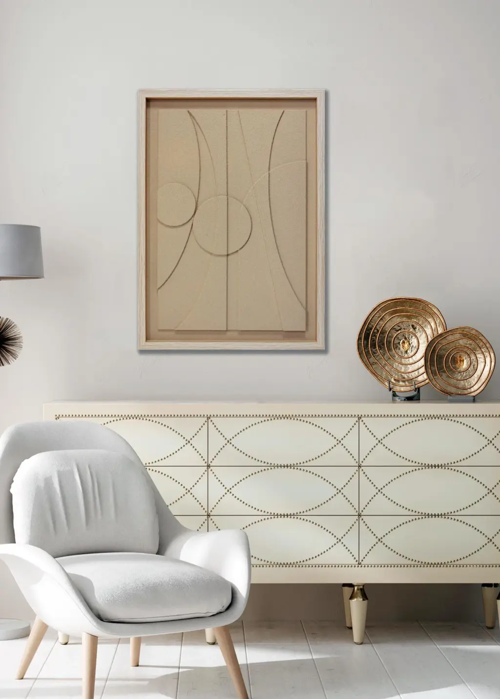 Cuadro decorativo de espuma de poliuretano con diseño en relieve 3D pintado en color crema. Marco MDF con acabado madera natural y trasera reforzada para mayor firmeza. Herrajes incluidos para fácil instalación. Perfecto para un estilo moderno y cálido.