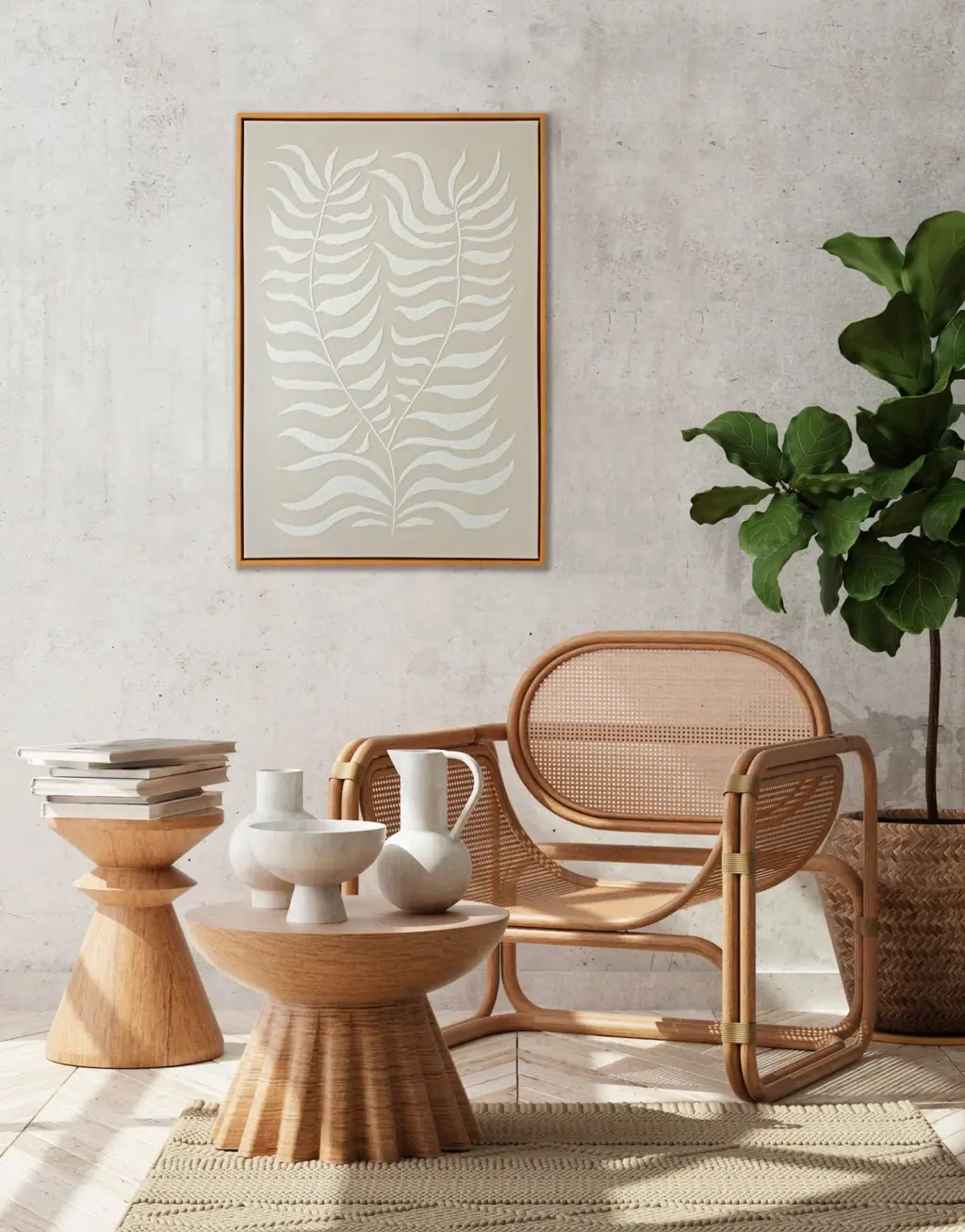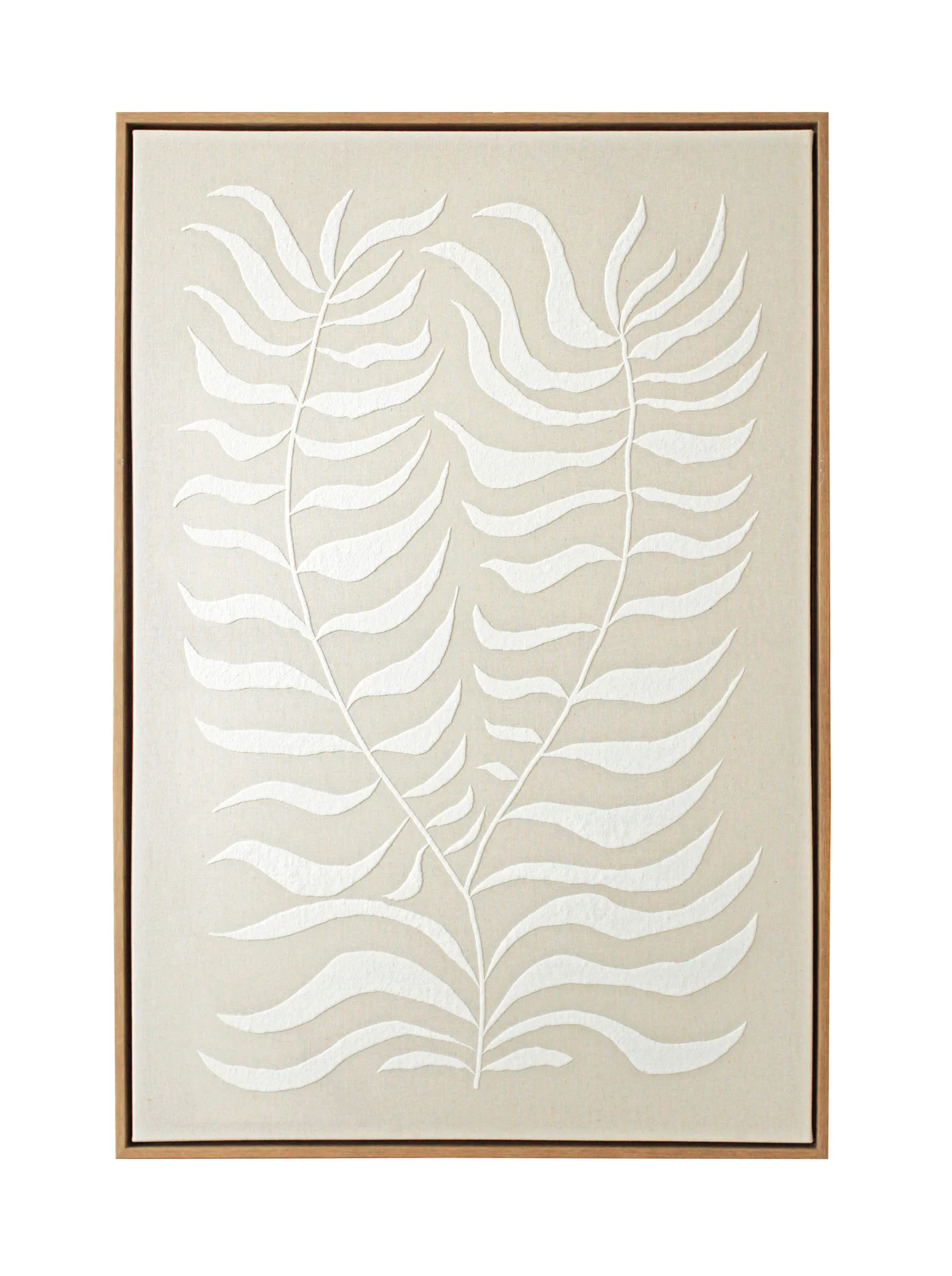 Lienzo de lino con un diseño abstracto en relieve blanco, fabricado en poliuretano. Su marco en madera natural y su trasera de MDF proporcionan una imagen elegante y sólida.