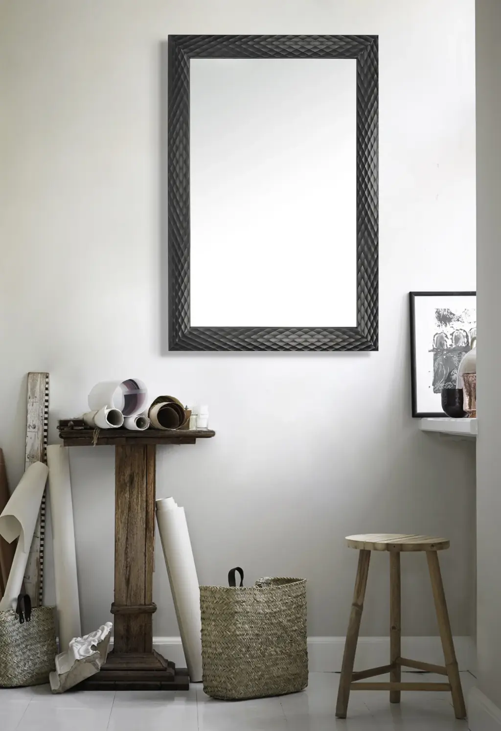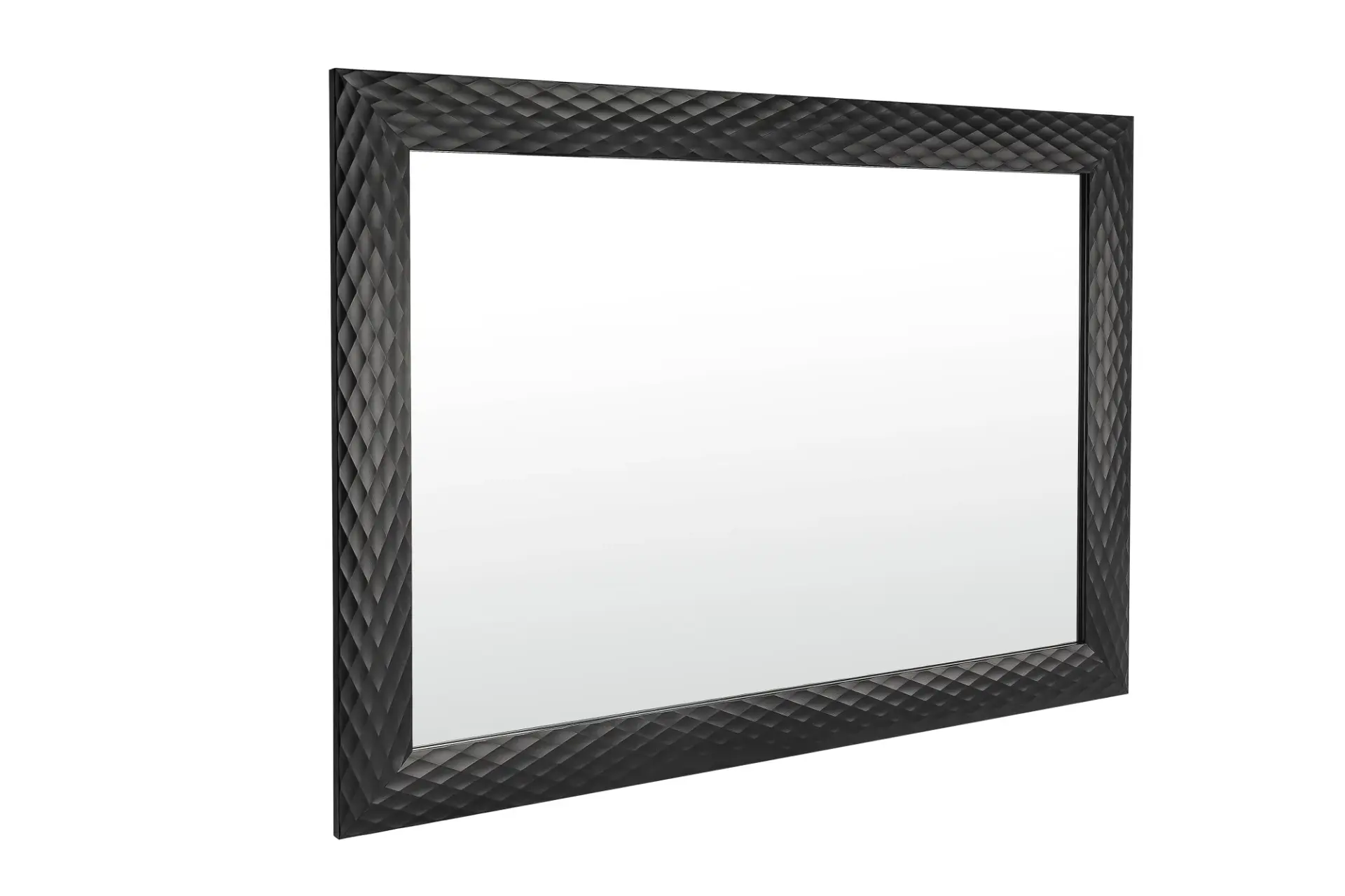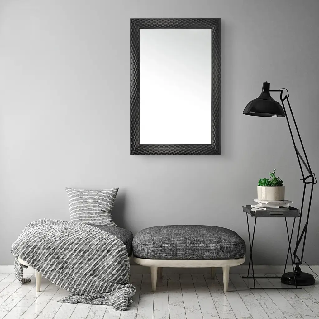 Espejo de pared rectangular con un elegante marco en color negro con diseño texturizado geométrico. Su sistema de fijación versátil permite instalarlo tanto en posición vertical como horizontal, lo que lo convierte en la opción ideal para decorar la entrada, el dormitorio o cualquier espacio común.