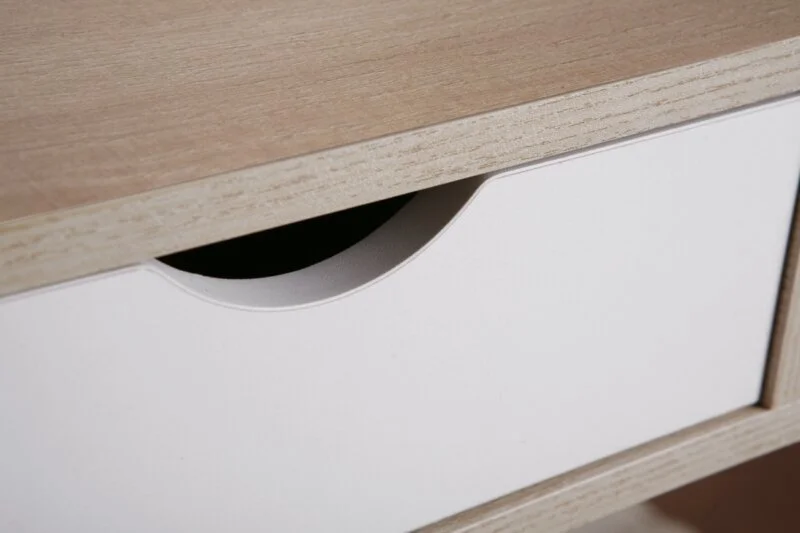 Mesa de estudio en melamina roble con patas metálicas blancas. Los dos cajones y el hueco central proporcionan almacenamiento adicional al amplio espacio de trabajo. Diseño sencillo de estilo nórdico que aportará un toque moderno en el despacho o el dormitorio juvenil.