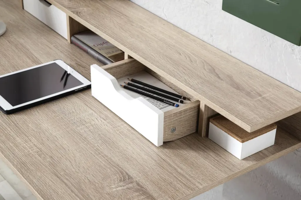 Escritorio en melamina roble con patas en madera lacadas en blanco. Esta pieza ofrece un amplio área de trabajo, además de dos cajones y un pequeño estante elevado en el frente. Practicidad y elegancia fusionados en un solo elemento.
