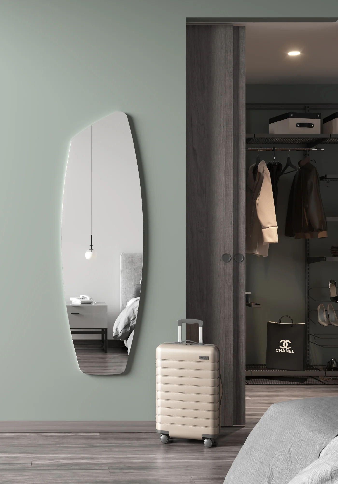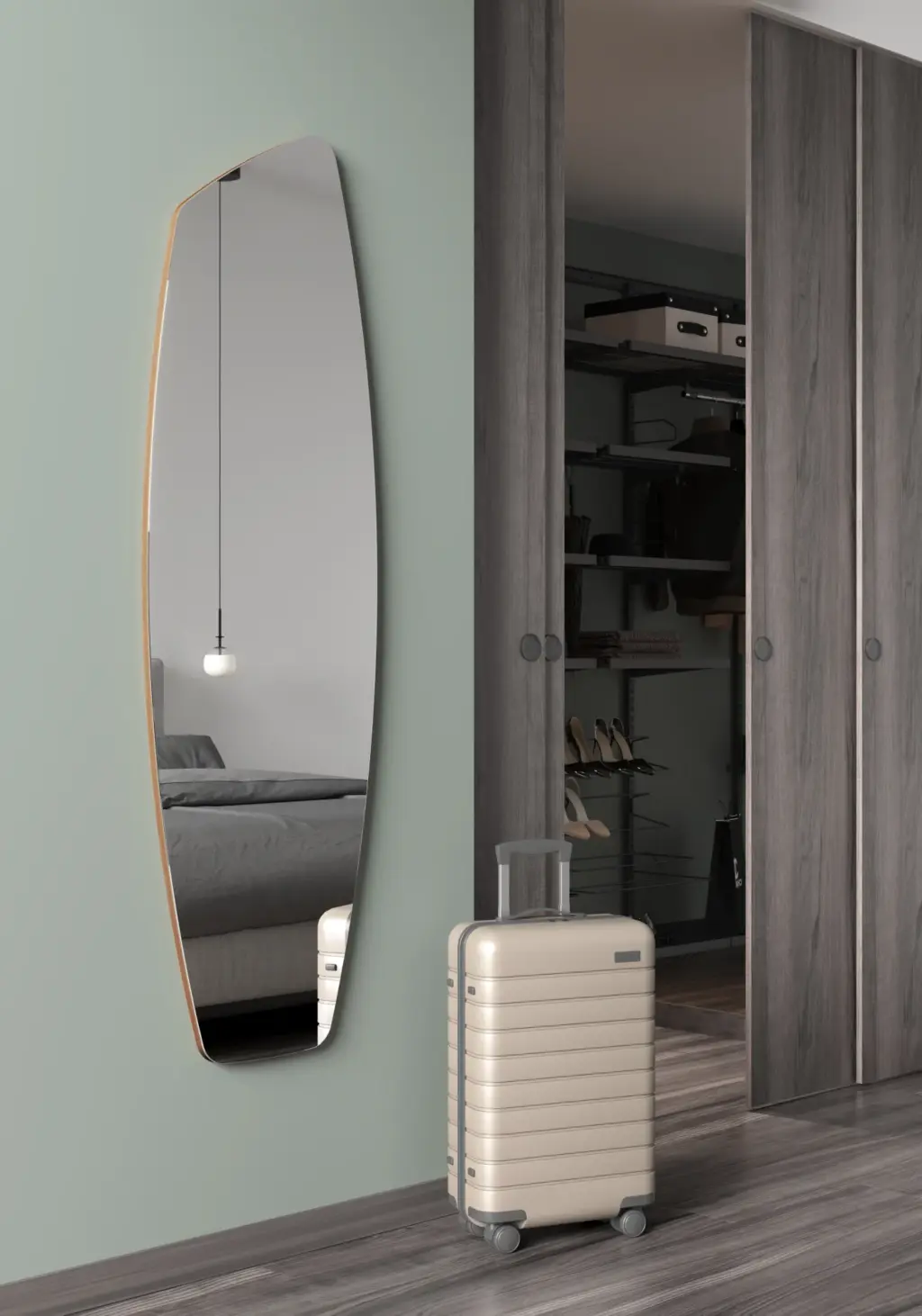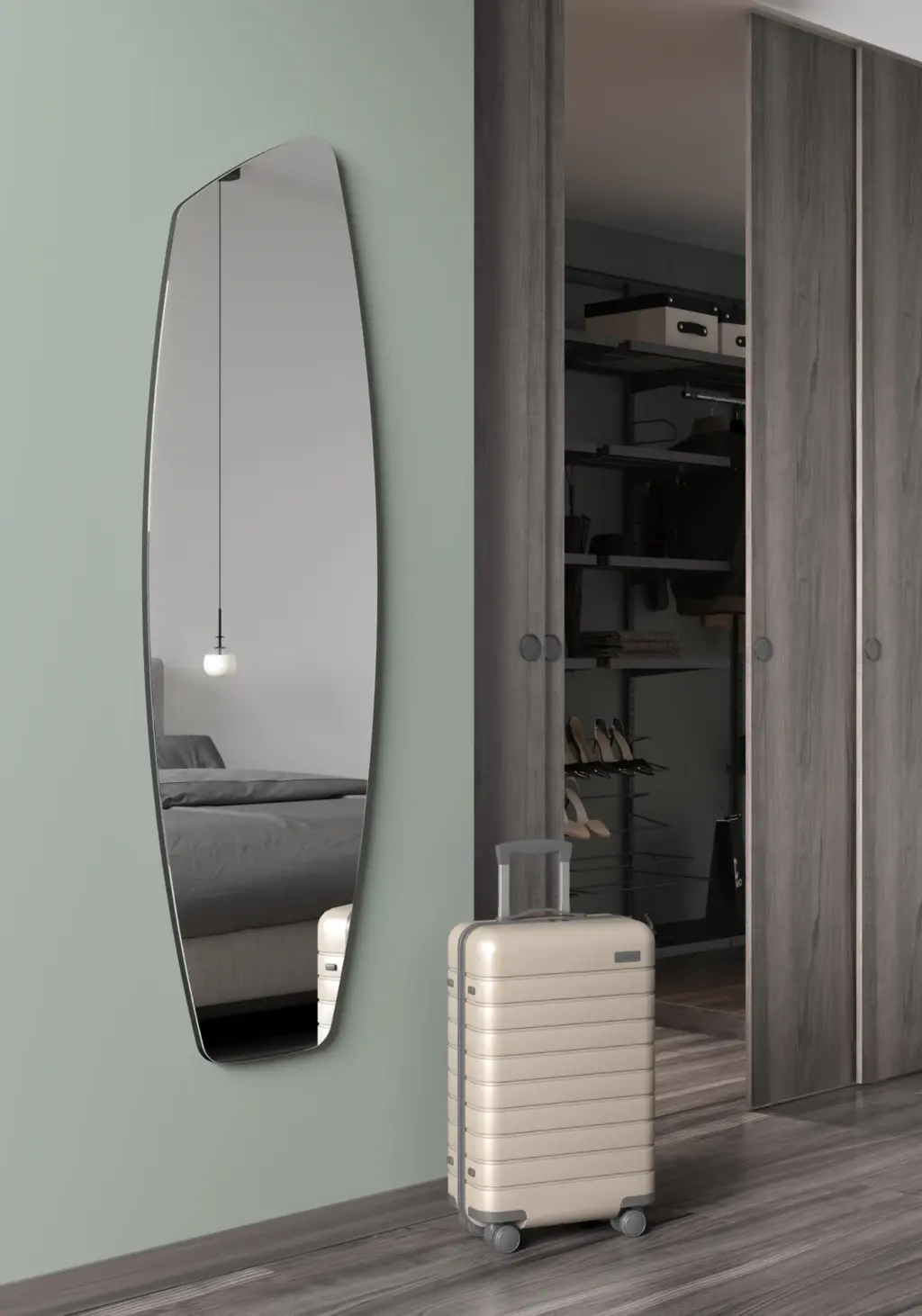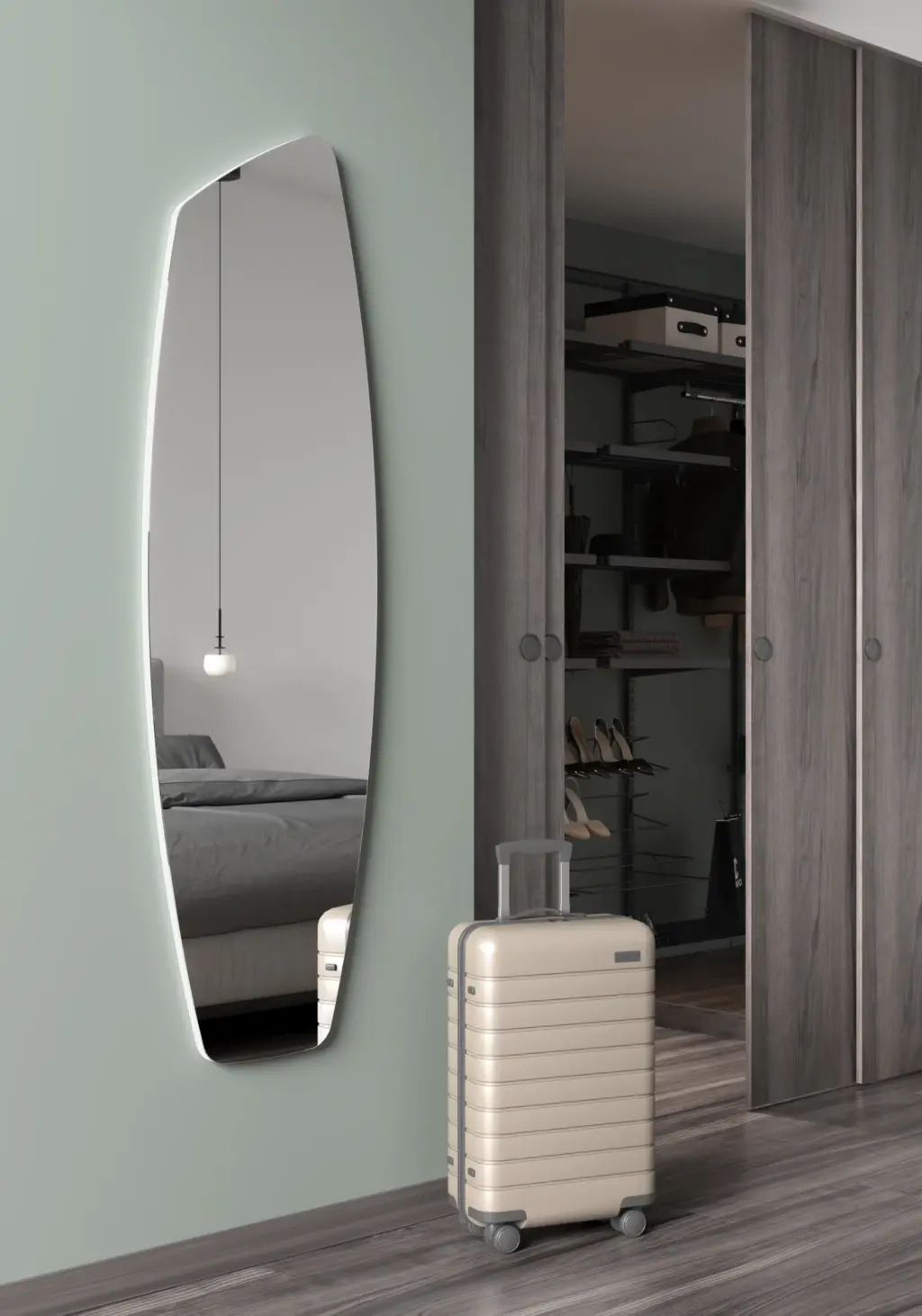 Espejo asimétrico de cuerpo entero con trasera de MDF. El perfil en madera es visible y lo podrás lacar en múltiples opciones de color para adaptarlo al estilo de tu dormitorio, de la entrada o del salón.