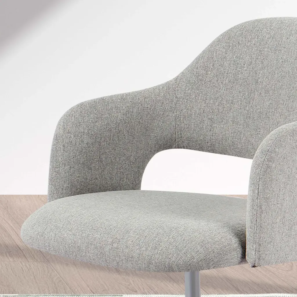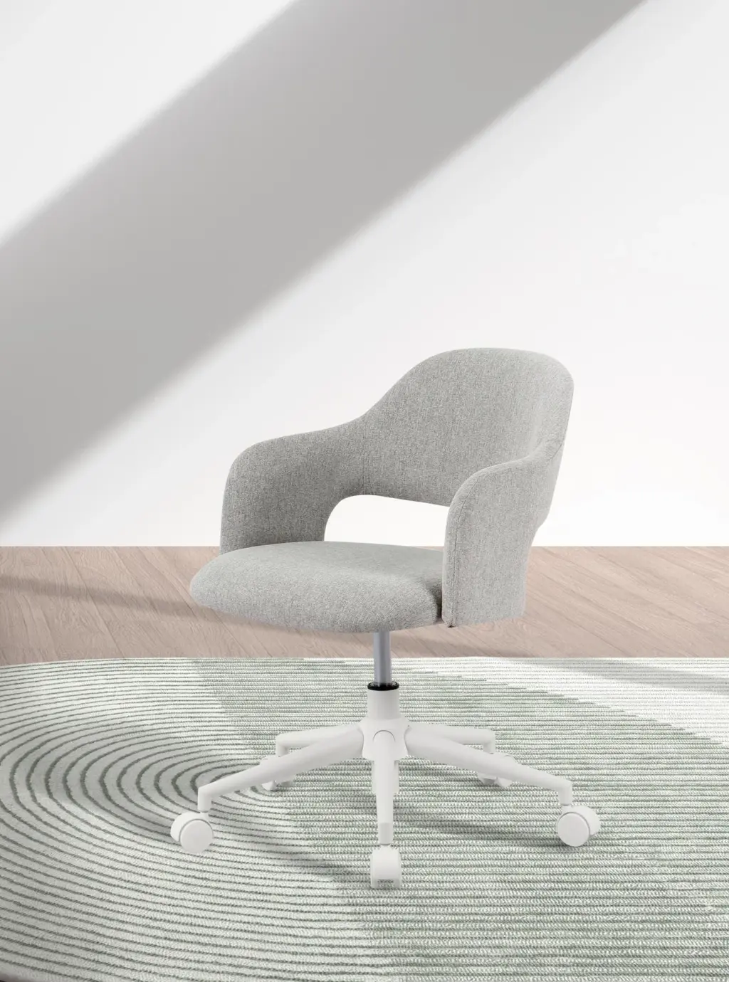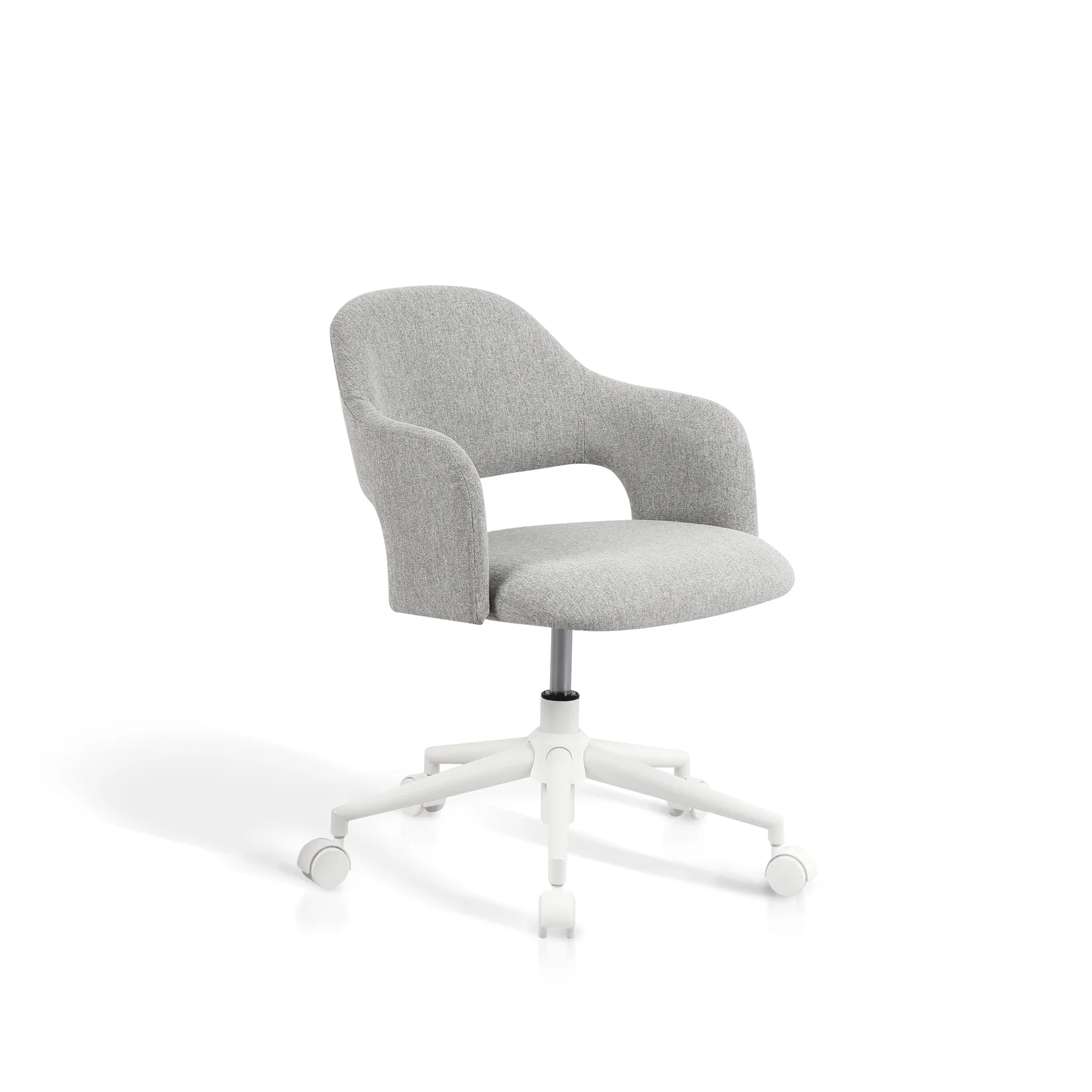 Silla de estudio con diseño estilo butaca, tapizada en tela gris que aporta calidez y elegancia. Incluye un sistema de regulación de altura mediante pistón de gas para un ajuste personalizado. Su base, fabricada en hierro bañado en blanco, ofrece robustez y un toque moderno, mientras que las ruedas de nylon permiten un desplazamiento suave y seguro.