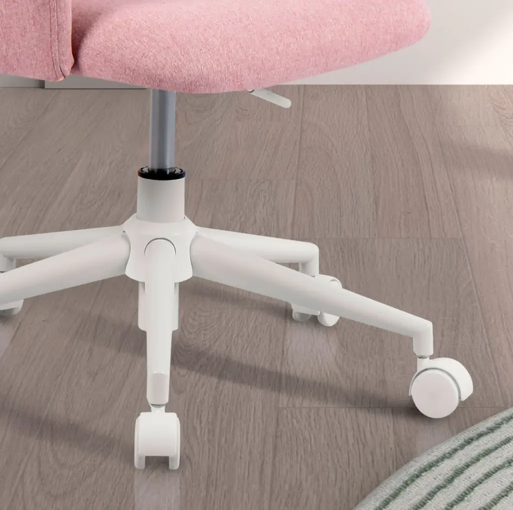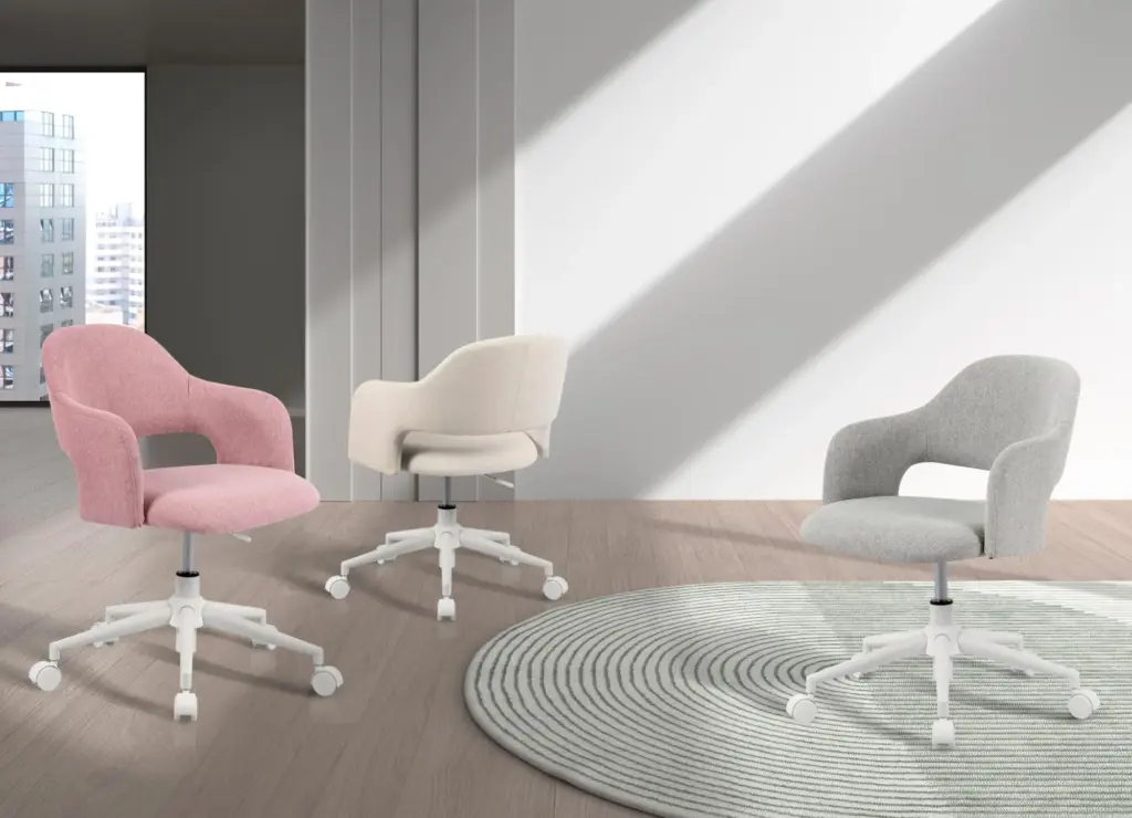 Silla de estudio con diseño estilo butaca, tapizada en tela rosa que aporta calidez y elegancia. Incluye un sistema de regulación de altura mediante pistón de gas para un ajuste personalizado. Su base, fabricada en hierro bañado en blanco, ofrece robustez y un toque moderno, mientras que las ruedas de nylon permiten un desplazamiento suave y seguro.