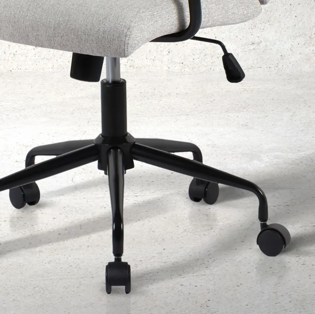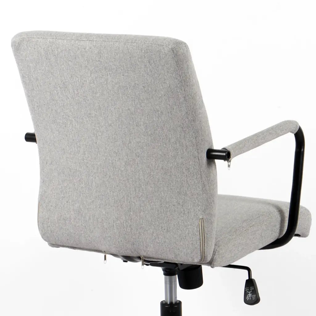 Silla de estudio en textil gris con un elegante diseño vintage. Cuenta con un sistema basculante del asiento completo, con opción de bloqueo para mayor comodidad. Su altura es regulable gracias al pistón de gas, adaptándose fácilmente a diferentes necesidades. Los brazos y la base están fabricados en hierro bañado en negro y las ruedas estándar de nylon.