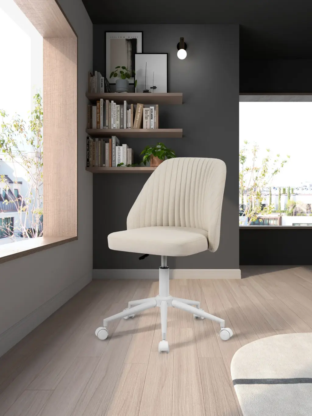 Silla en tela beige sin brazos, con respaldo y asiento tapizados. Dispone de un sistema de regulación de altura mediante pistón de gas, permitiendo un ajuste personalizado. Las ruedas de silicona aseguran un desplazamiento suave y seguro, siendo aptas para todo tipo de suelos, incluido el parquet.