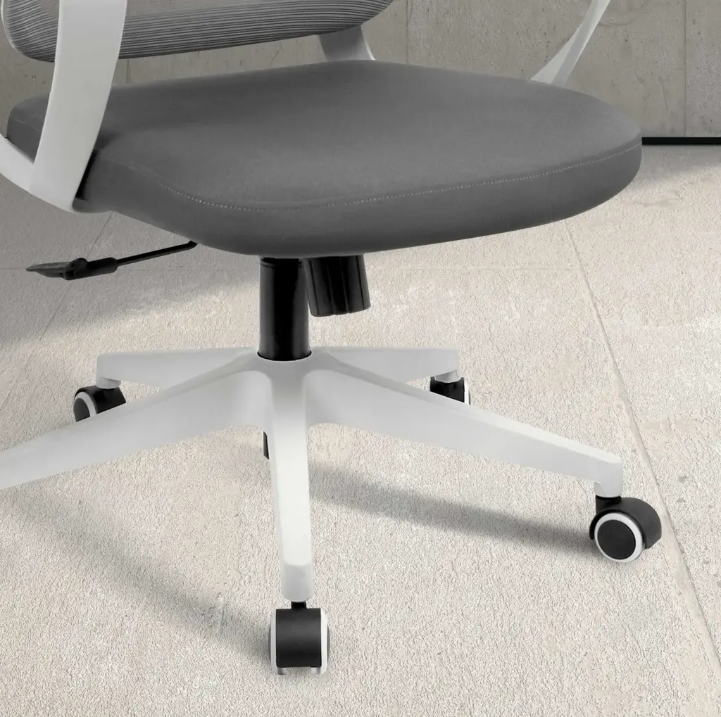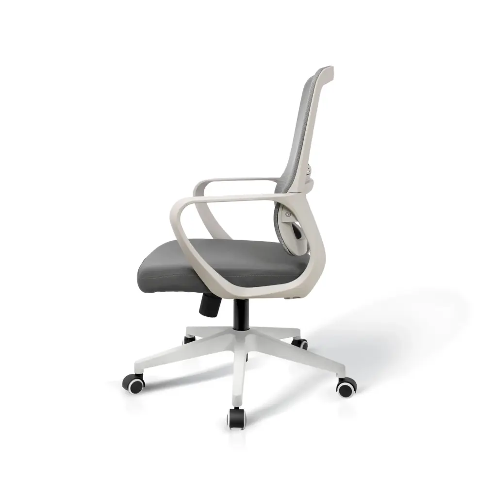Silla en tela gris con respaldo transpirable, estructura y base en nylon gris clarito y equipada con ruedas de silicona, ideales para proteger suelos de parquet. Dispone de sistema basculante y regulación de altura mediante pistón de gas, adaptándose a diferentes posturas y necesidades.