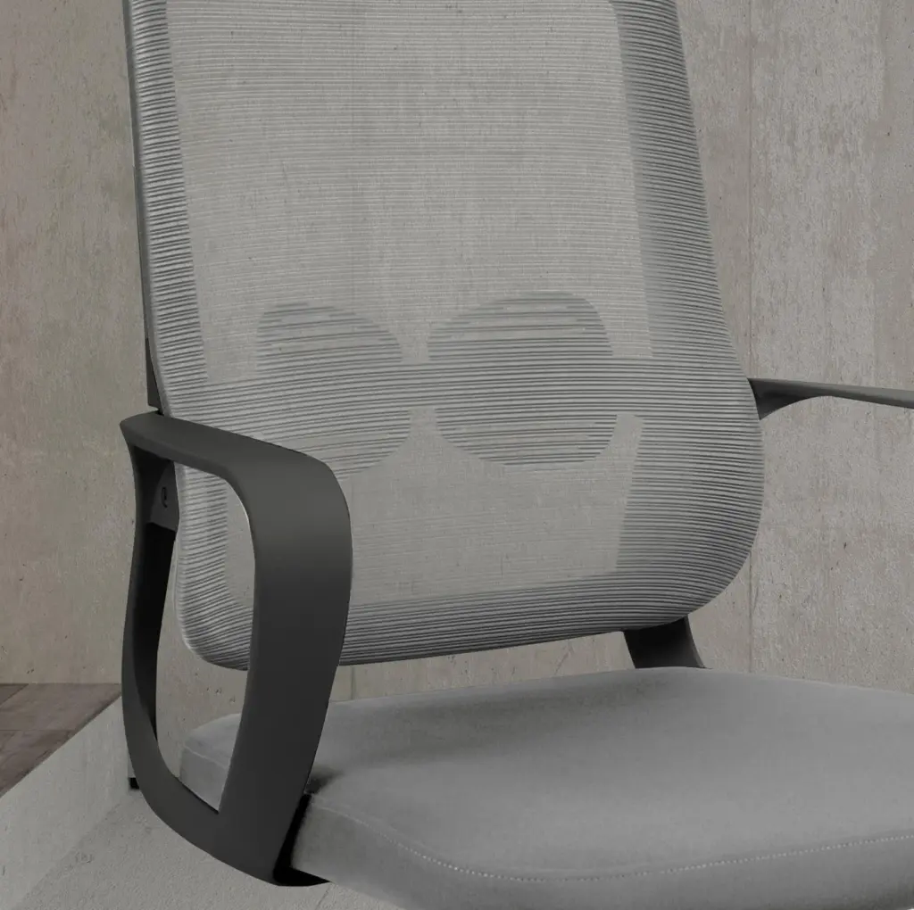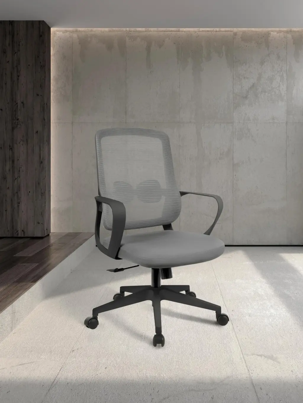 Silla en tela gris con respaldo transpirable, estructura y base en nylon negro y equipada con ruedas de silicona, ideales para proteger suelos de parquet. Dispone de sistema basculante y regulación de altura mediante pistón de gas, adaptándose a diferentes posturas y necesidades.