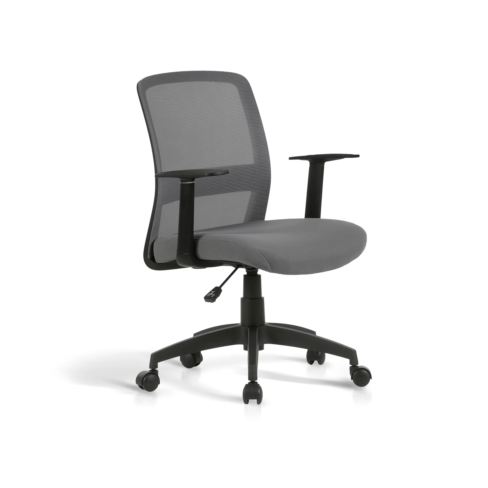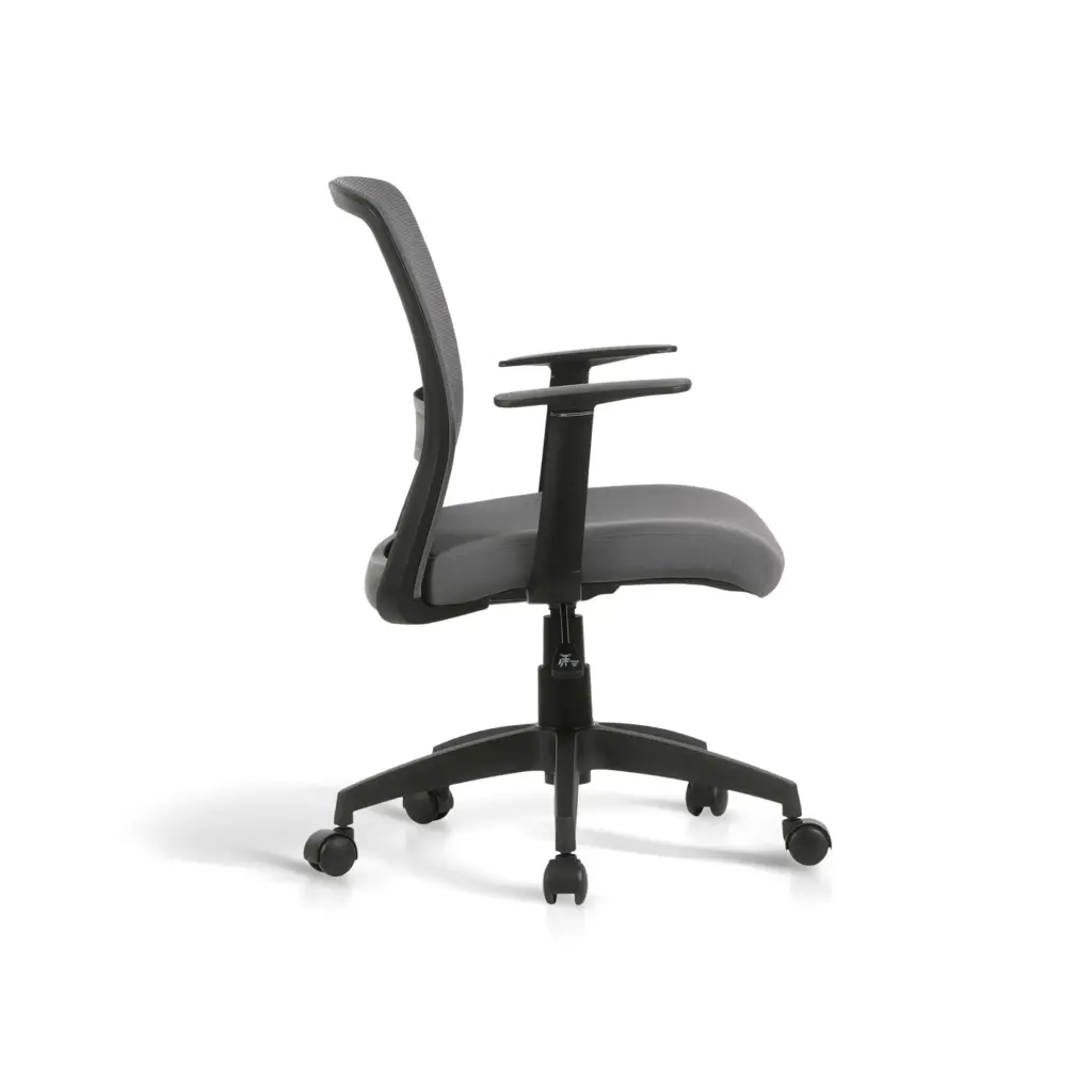 Silla en tela gris con respaldo transpirable, estructura y base en nylon y equipada con ruedas estándar. Dispone de sistema basculante con posición de bloqueo y regulación de altura mediante pistón de gas, adaptándose a diferentes posturas y necesidades.