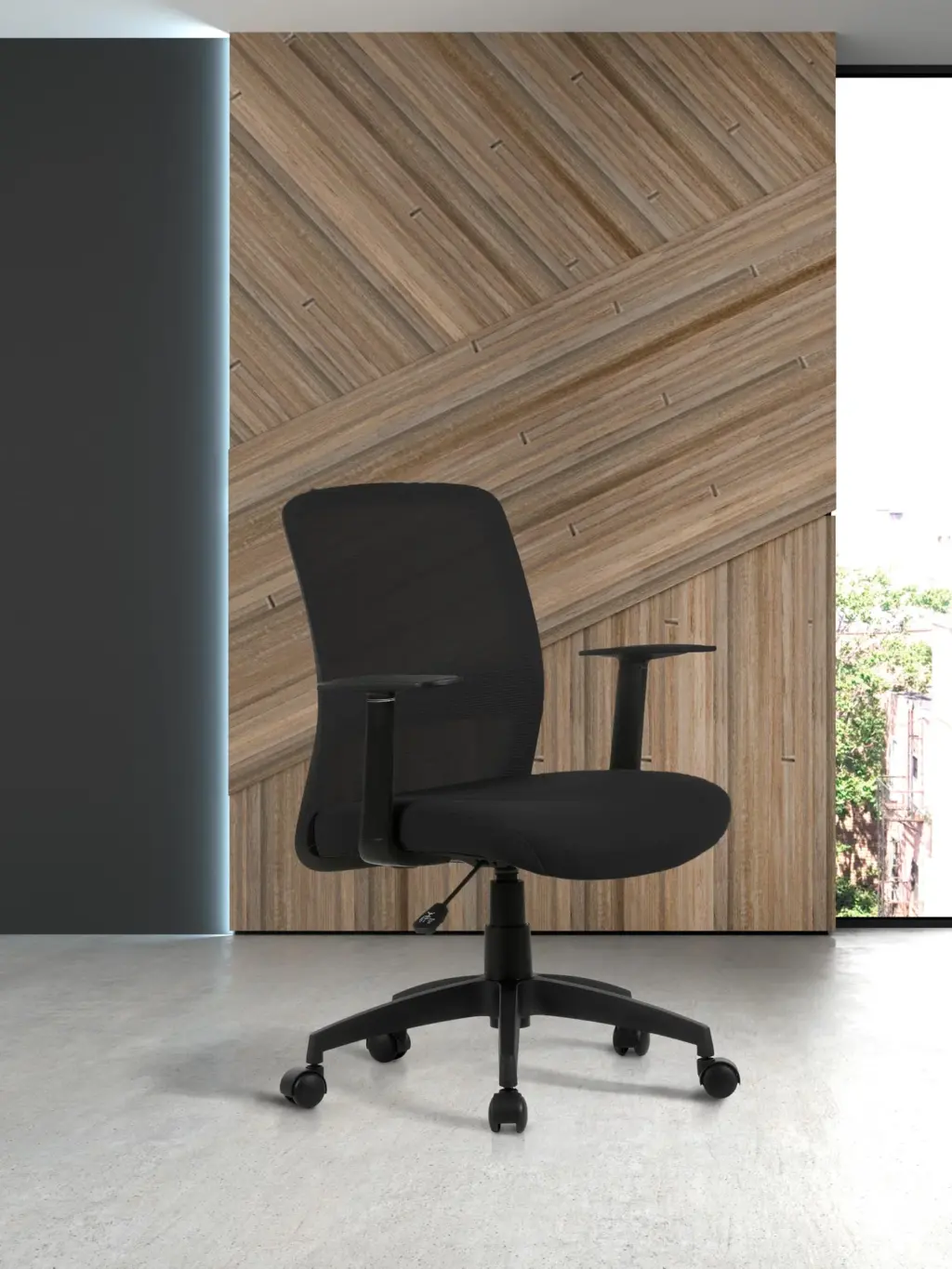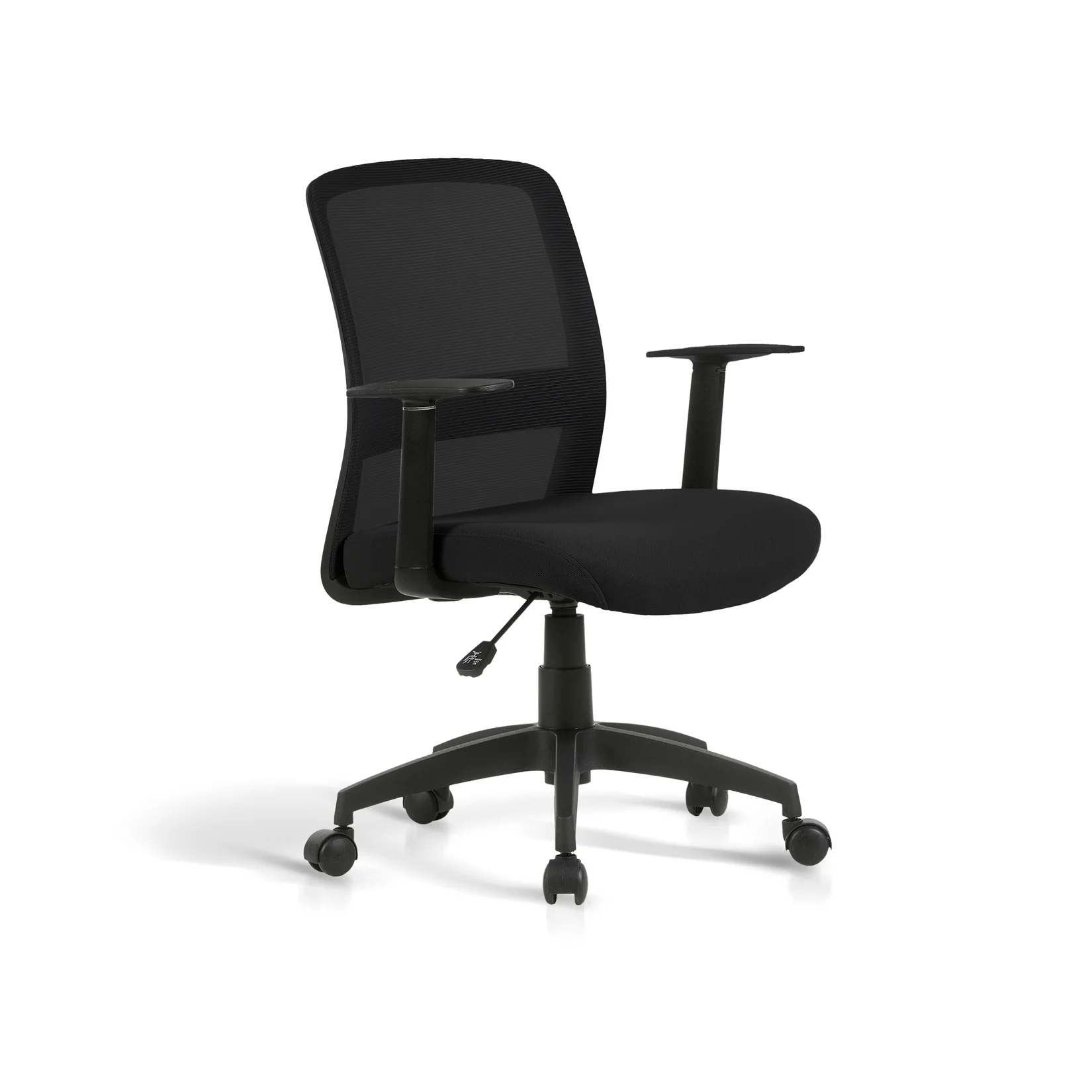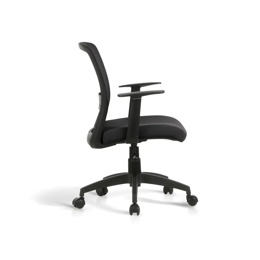 Silla en tela negra con respaldo transpirable, estructura y base en nylon y equipada con ruedas estándar. Dispone de sistema basculante con posición de bloqueo y regulación de altura mediante pistón de gas, adaptándose a diferentes posturas y necesidades.