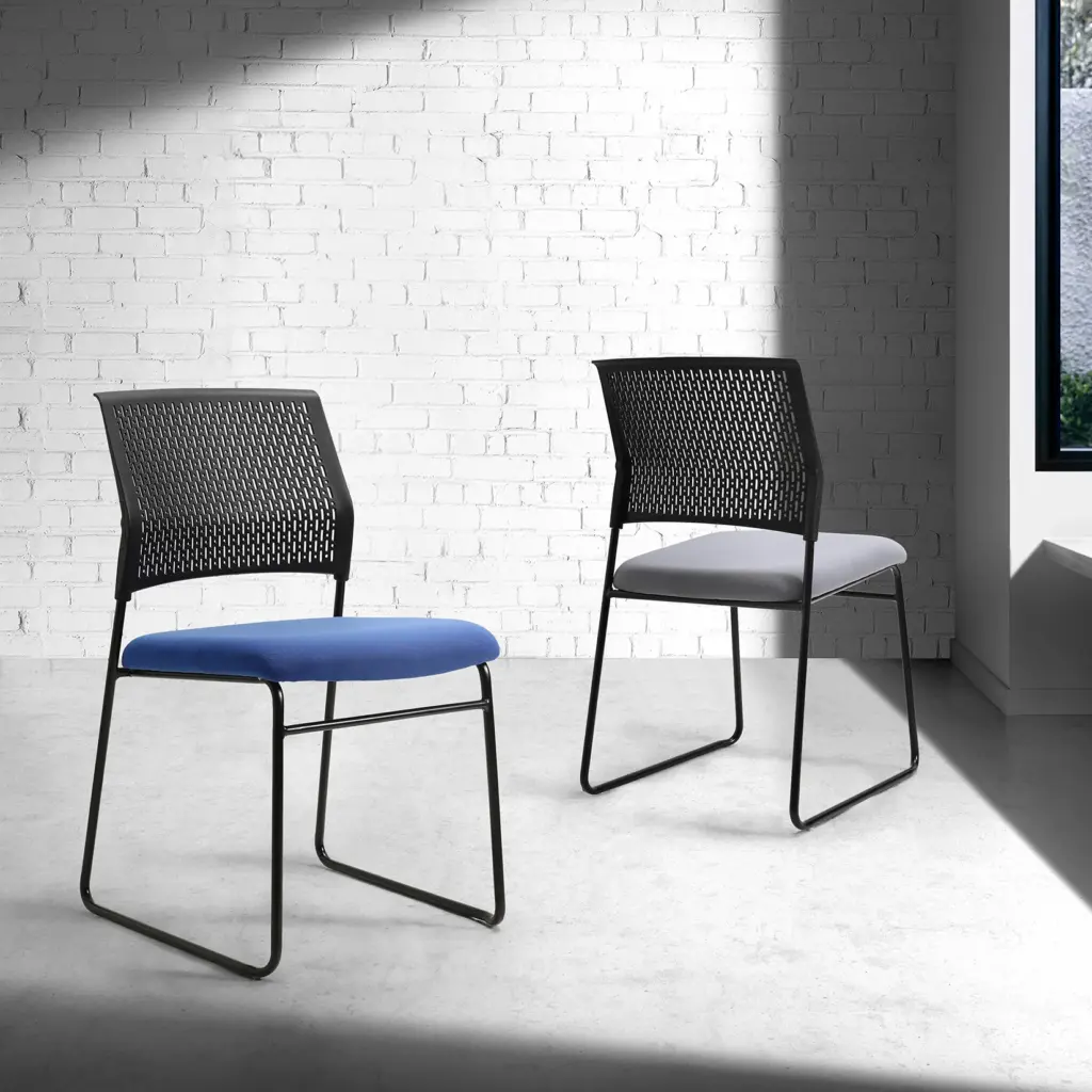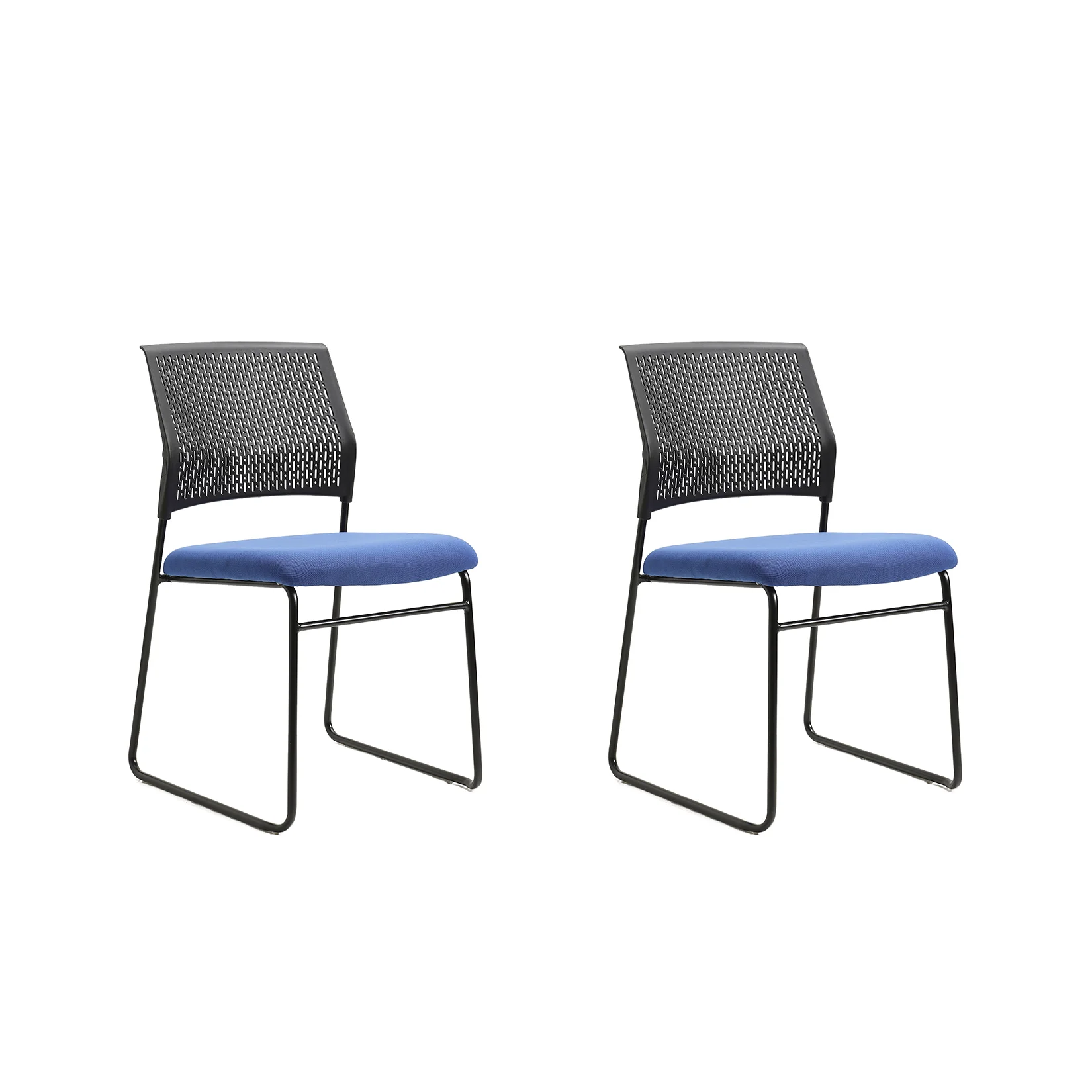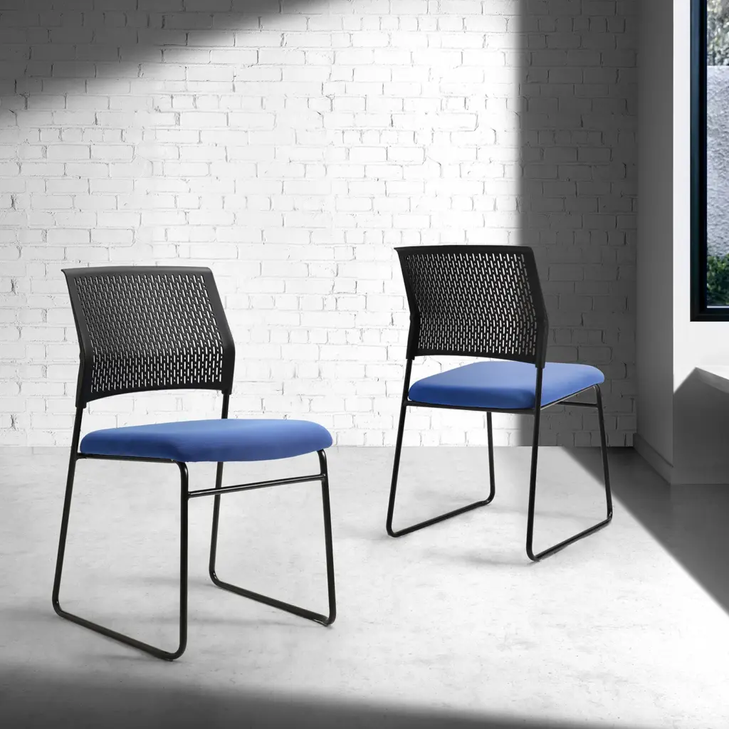 Silla confidente con asiento tapizado en azul y estructura robusta en color negro. Sin brazos, ofrece un diseño sencillo y funcional, ideal para optimizar el espacio. Perfecta para salas de espera, áreas comunes o como silla para visitantes en despachos.