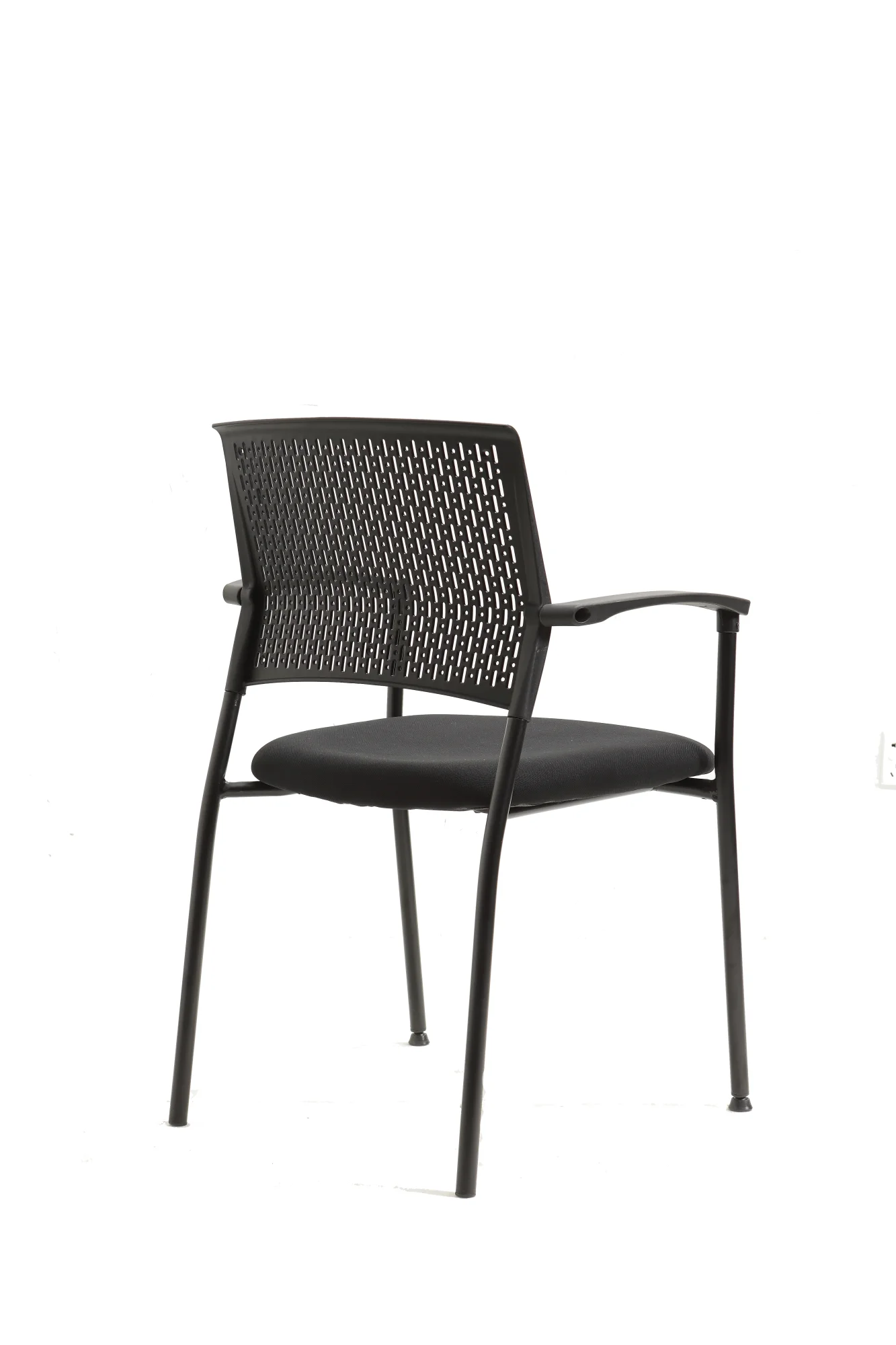 Silla confidente con asiento tapizado en negro y estructura negra, equipada con brazos para mayor comodidad. Su diseño robusto y funcional la hace ideal para salas de espera, áreas comunes o como silla para visitantes en despachos.