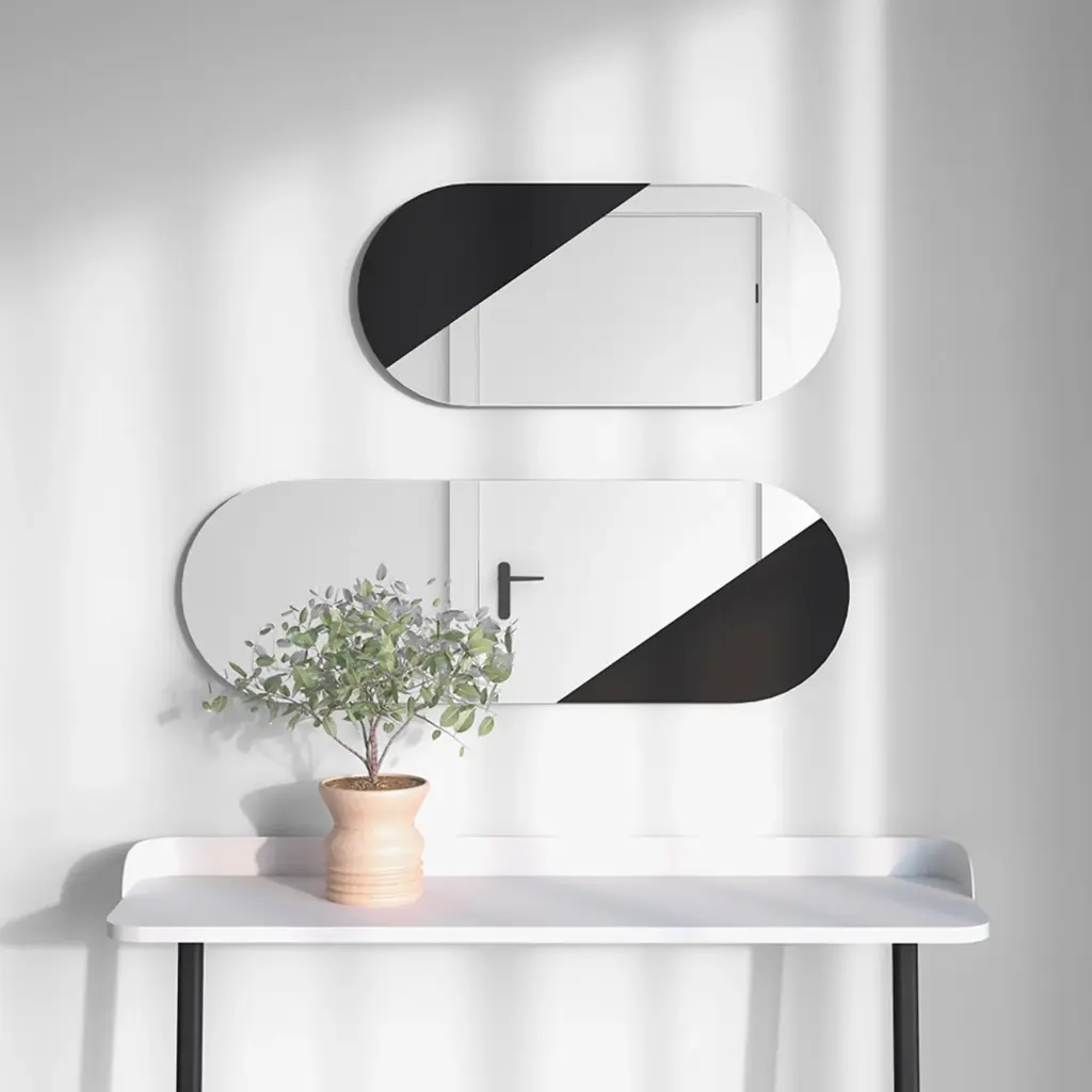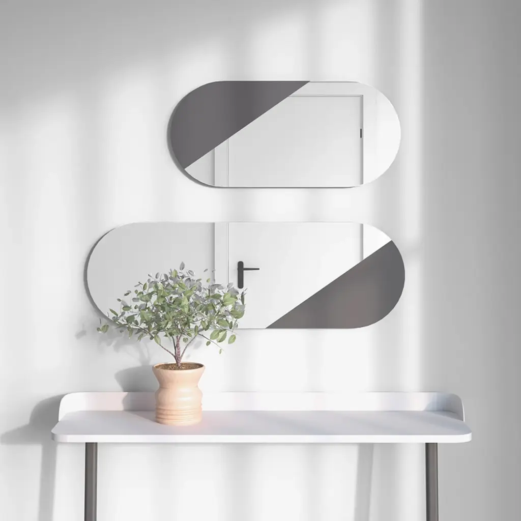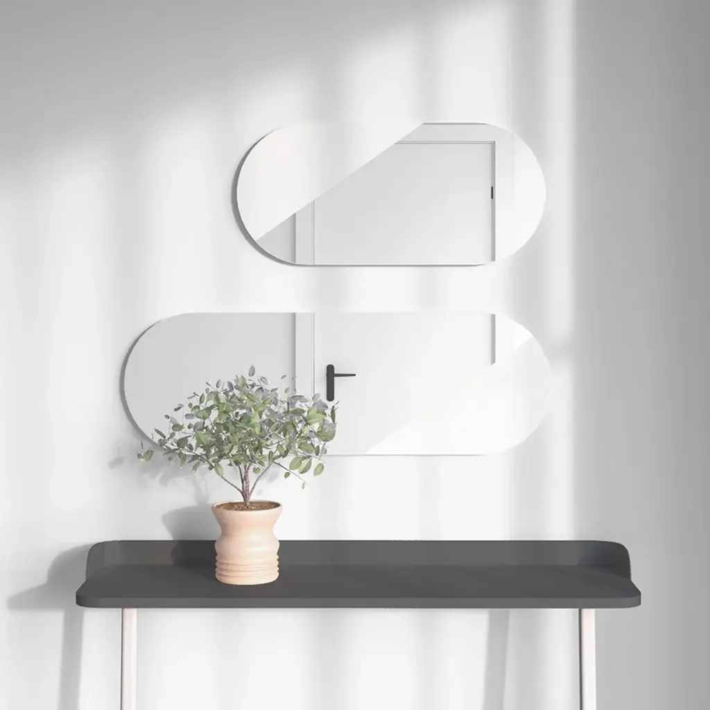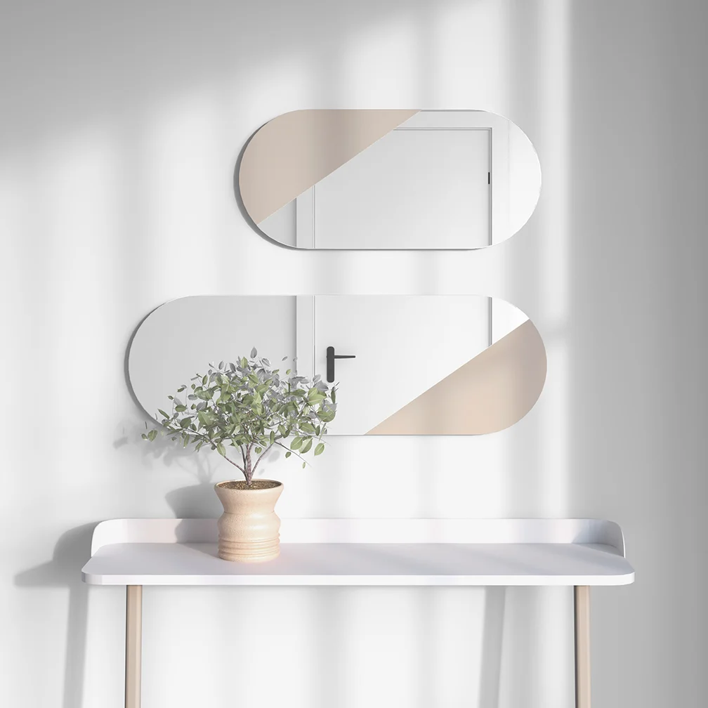 Espejo ovalado sobre trasera de MDF. El diseño cortado del cristal aporta un toque especial, dejando una sección visible, la cual podrás lacar en el color que mejor complemente con tu hogar. Combínalo con el modelo 756, mismo diseño pero más pequeño.