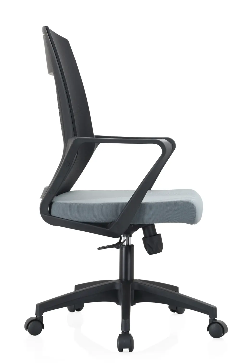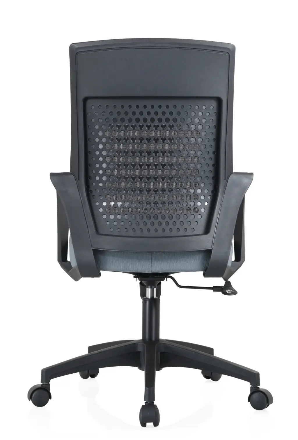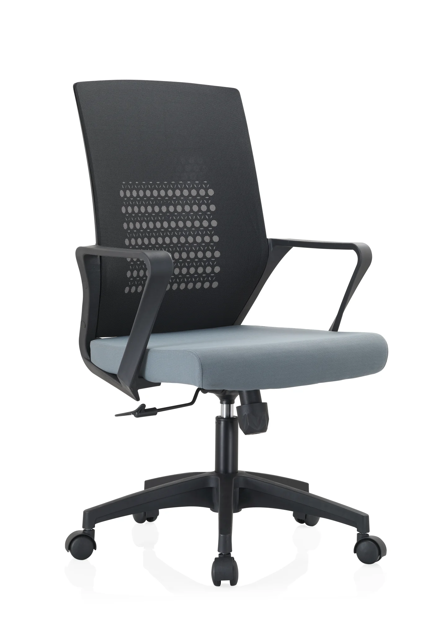Silla de oficina en tela gris con respaldo transpirable, estructura y base en nylon inyectado y equipada con ruedas estandar. Dispone de sistema basculante con opción de bloqueo y regulación de altura mediante pistón de gas, adaptándose a diferentes posturas y necesidades.