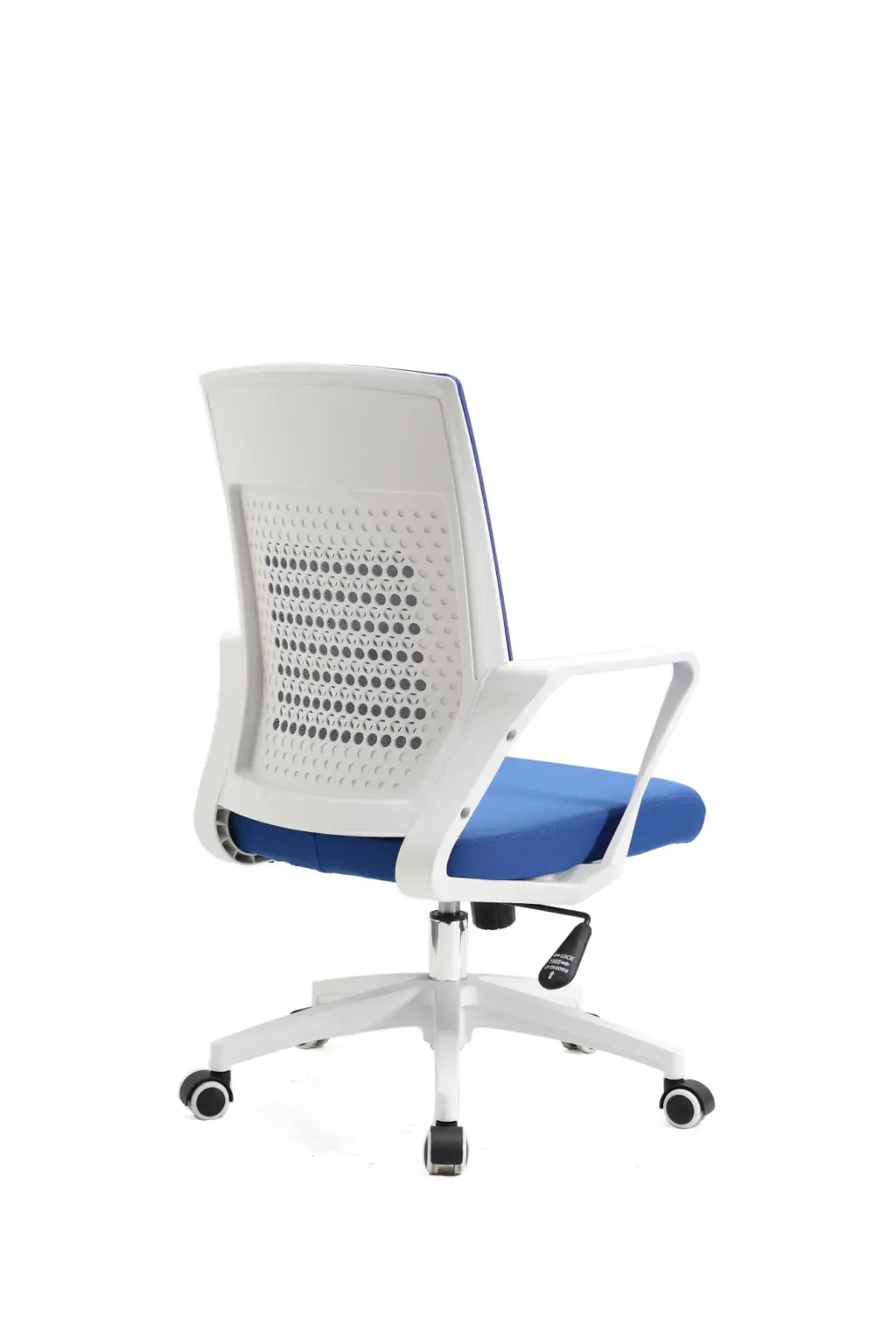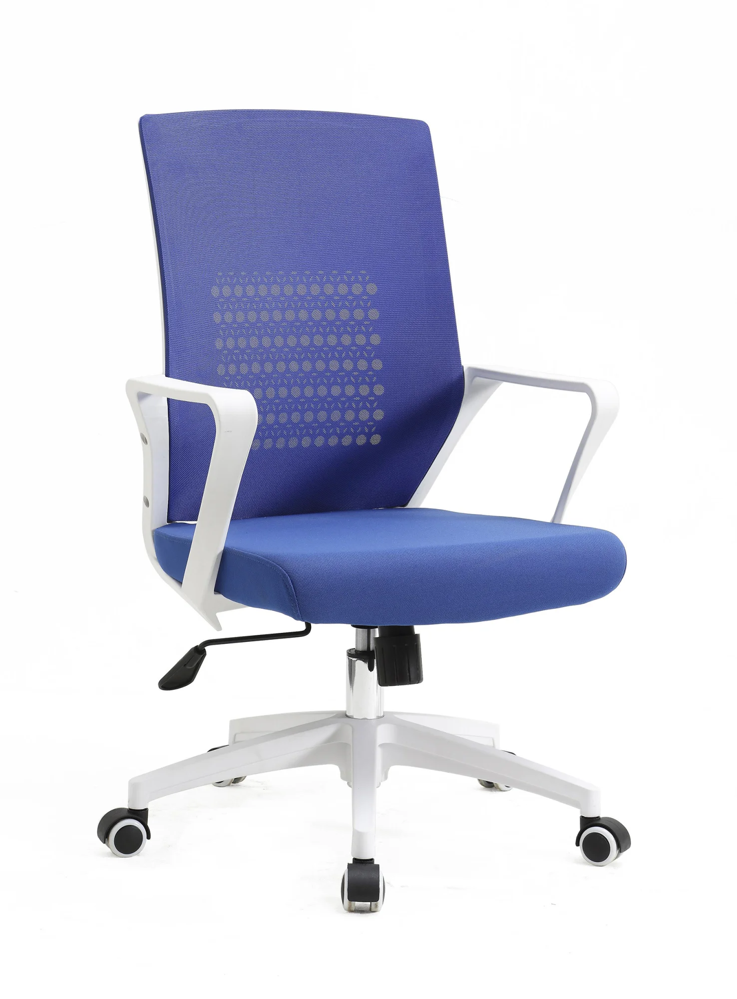 Silla de oficina en tela azul con respaldo transpirable, estructura y base en nylon blanco inyectado y equipada con ruedas de silicona aptas para suelos de parquet. Dispone de sistema basculante con opción de bloqueo y regulación de altura mediante pistón de gas, adaptándose a diferentes posturas y necesidades.
