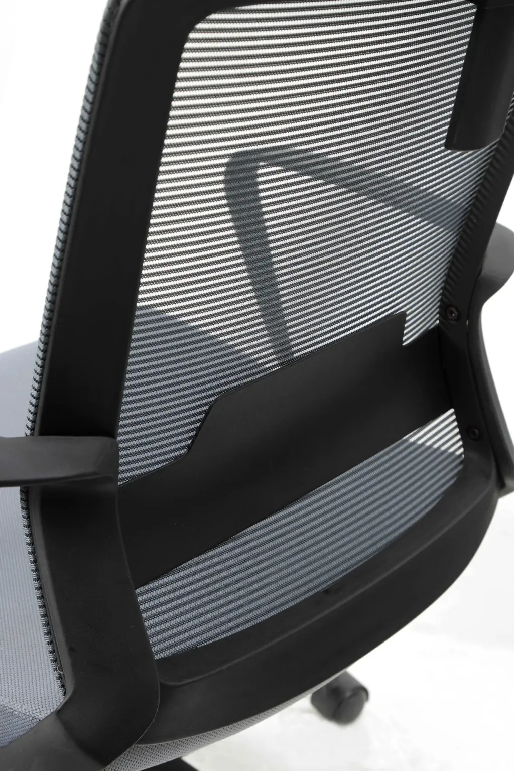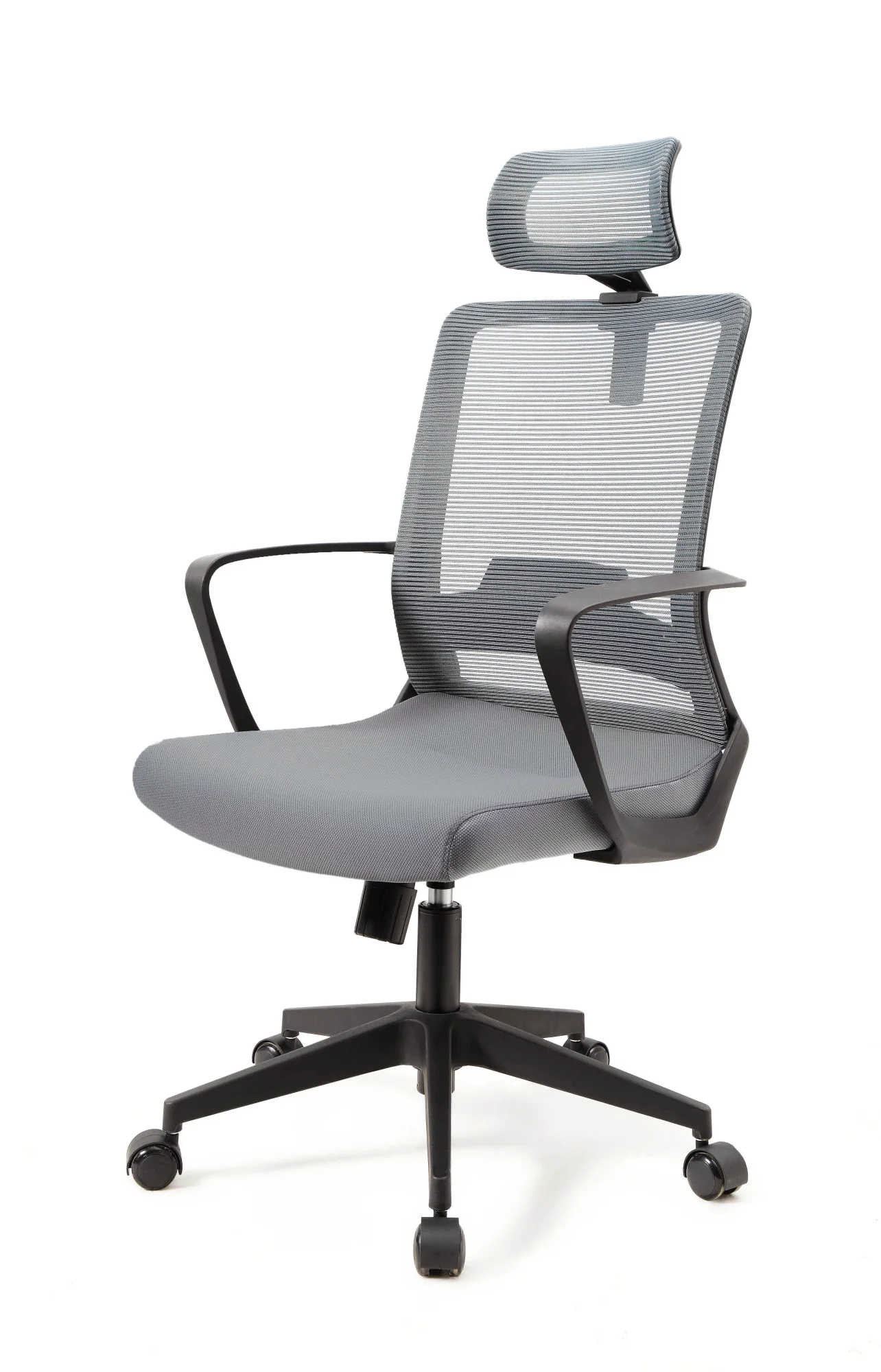 Silla de oficina en color gris con respaldo transpirable, diseñada para combinar estilo y comodidad. Incluye un cabezal regulable para un soporte personalizado y un sistema basculante que permite ajustar la postura. Fabricada con estructura y base de nylon inyectado, garantiza durabilidad y ligereza. Ideal para entornos laborales o de estudio que buscan ergonomía y funcionalidad.